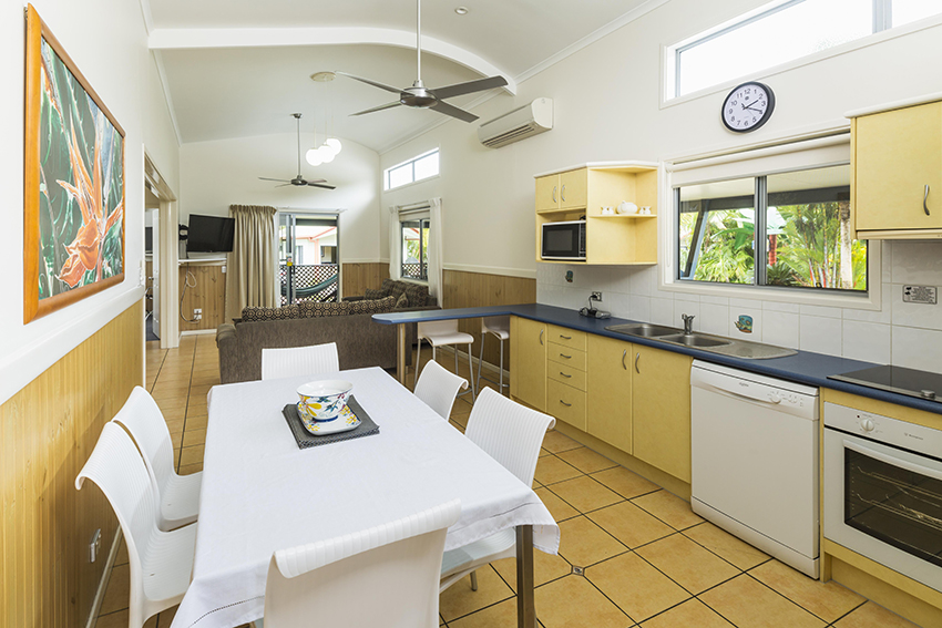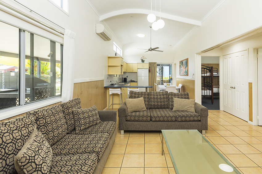 Our 3 Bedroom Sun Lagoon Villas sleep up to ten guests with a king bed and ensuite in the main bedroom, which opens to a spacious patio. They also feature a queen bed in the second bedroom and two bunks in the third bedroom, as well as an additional bathroom with spa bath, living area, kitchen, internal laundry, and private deck.