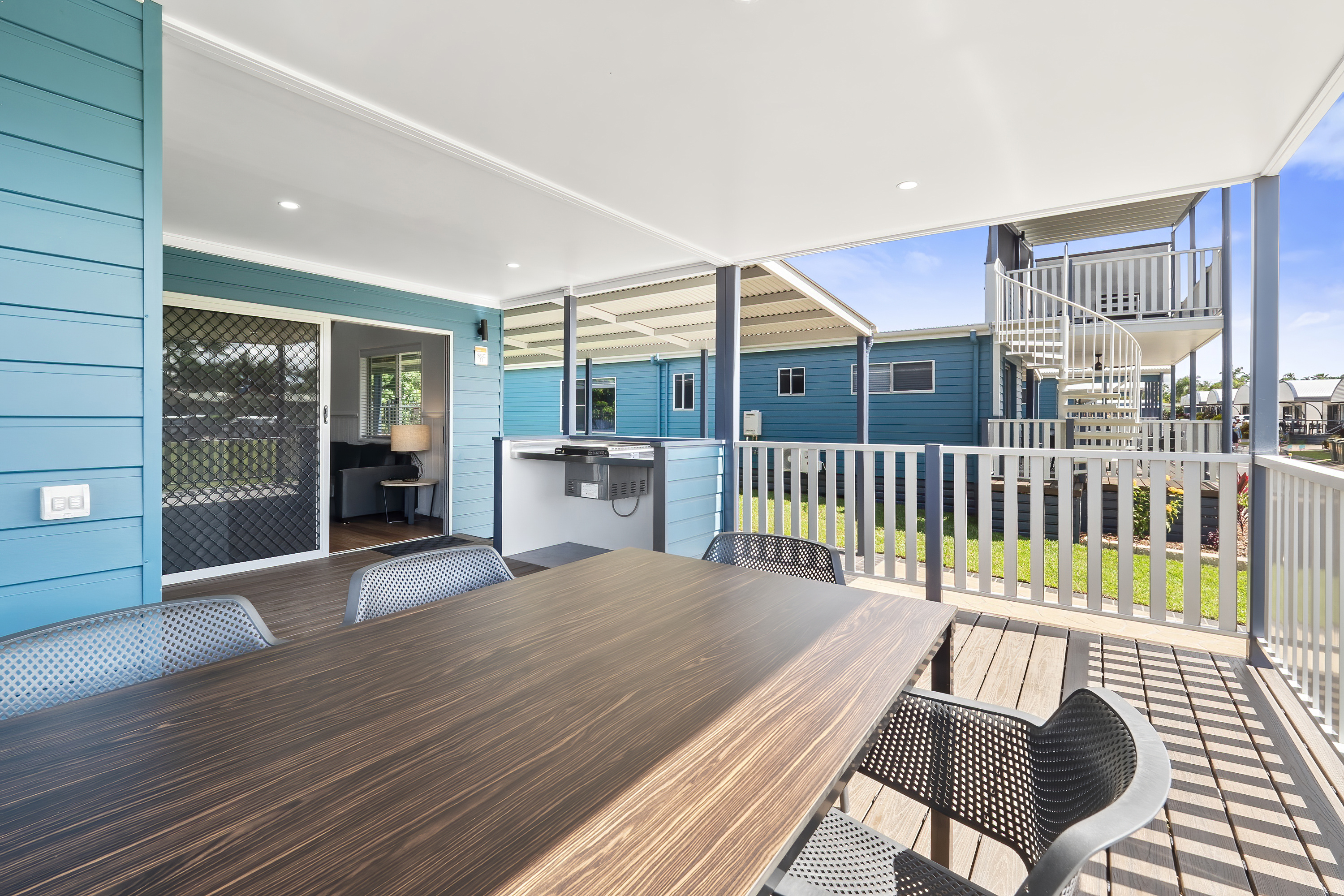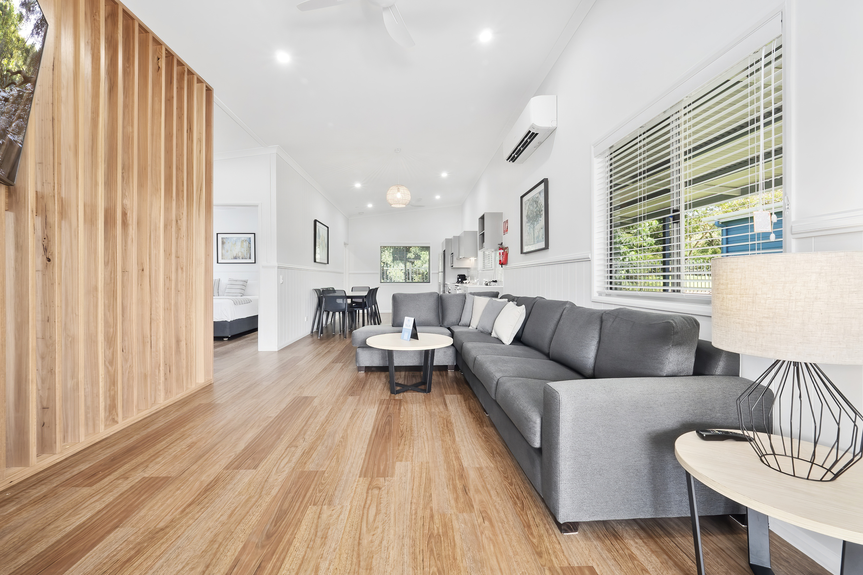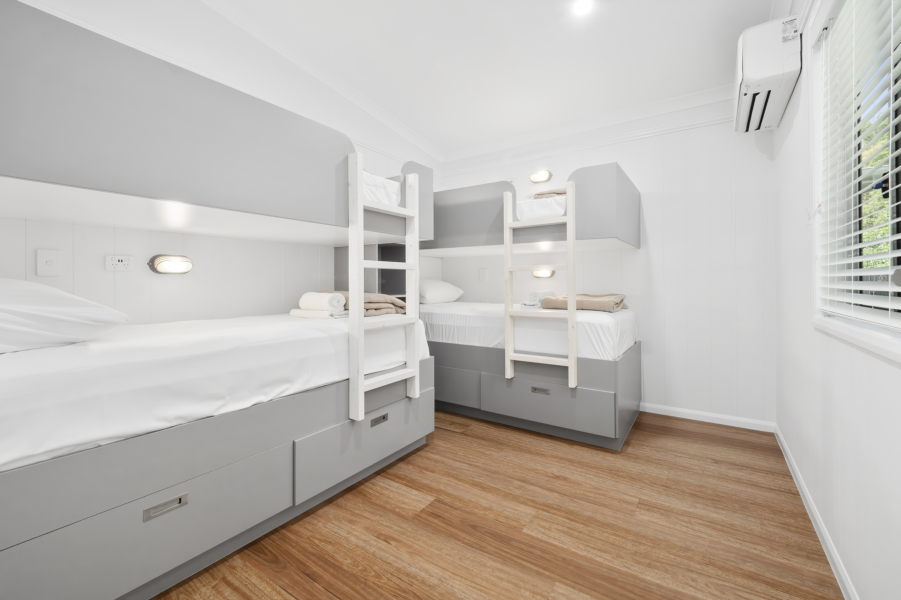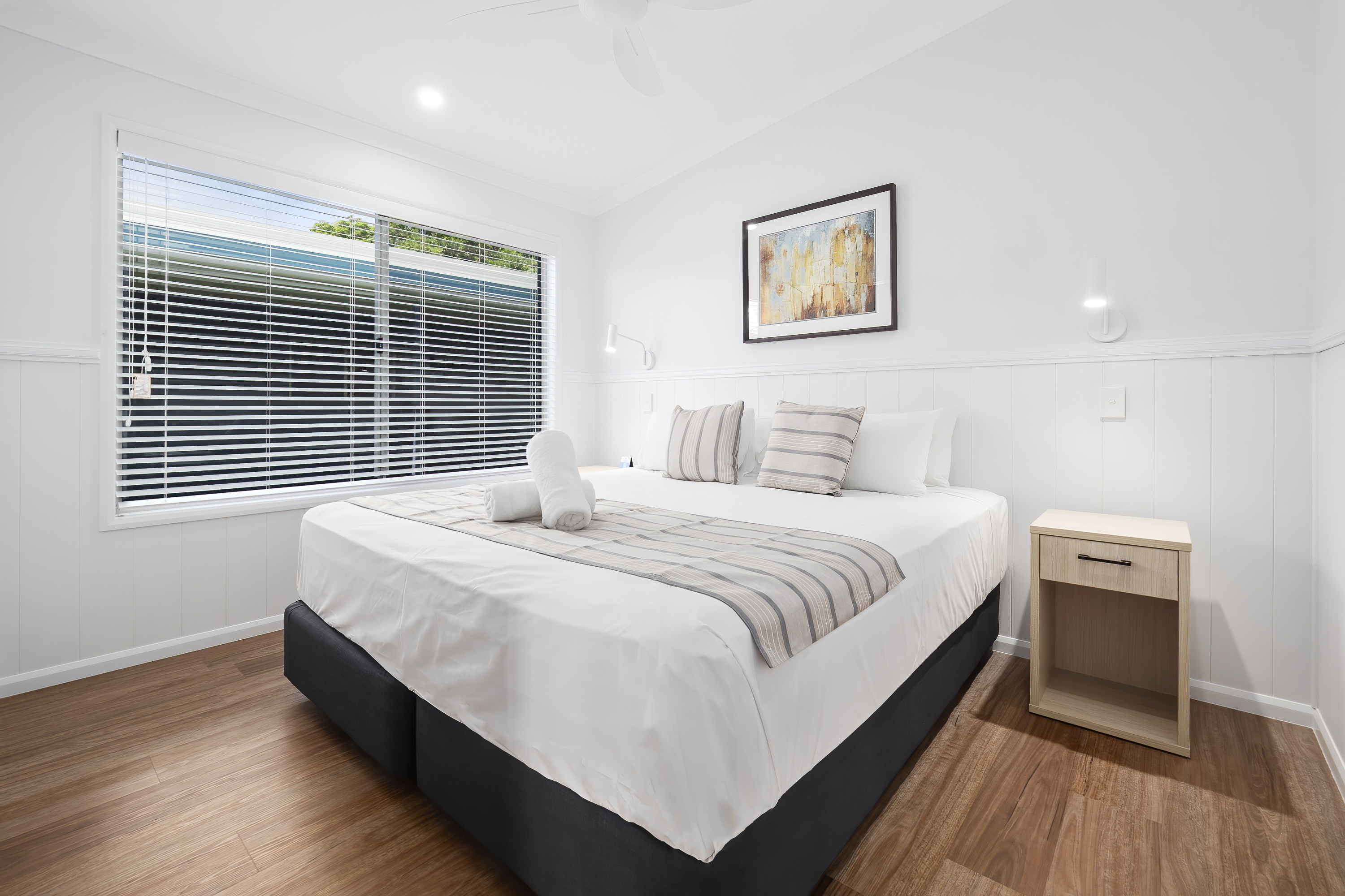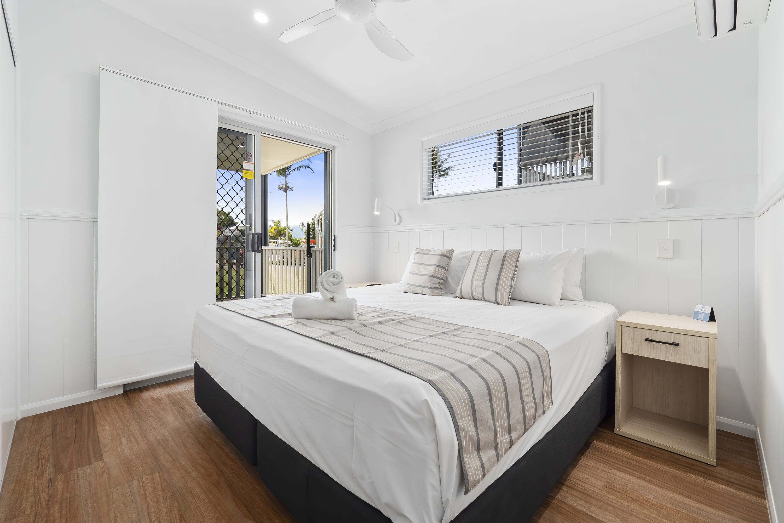 Our Superior Skyview Villas sleep up to eight guests with a king bed and TV in the main bedroom, a queen bed in the second bedroom, and two bunks in the third bedroom, as well as two bathrooms, a living area, internal laundry, and of course views of the resort and surrounding mountain ranges, plus an outdoor patio area on the ground level.