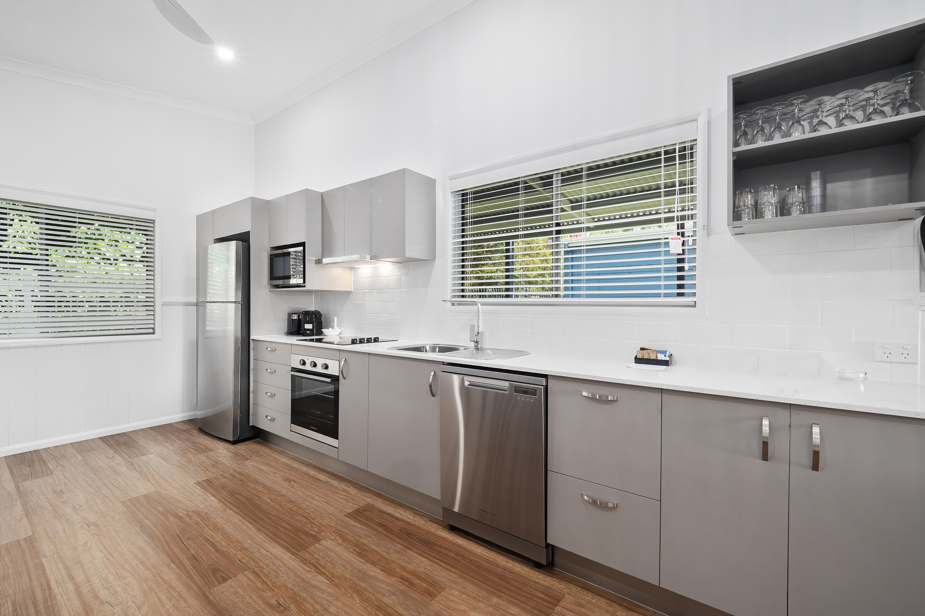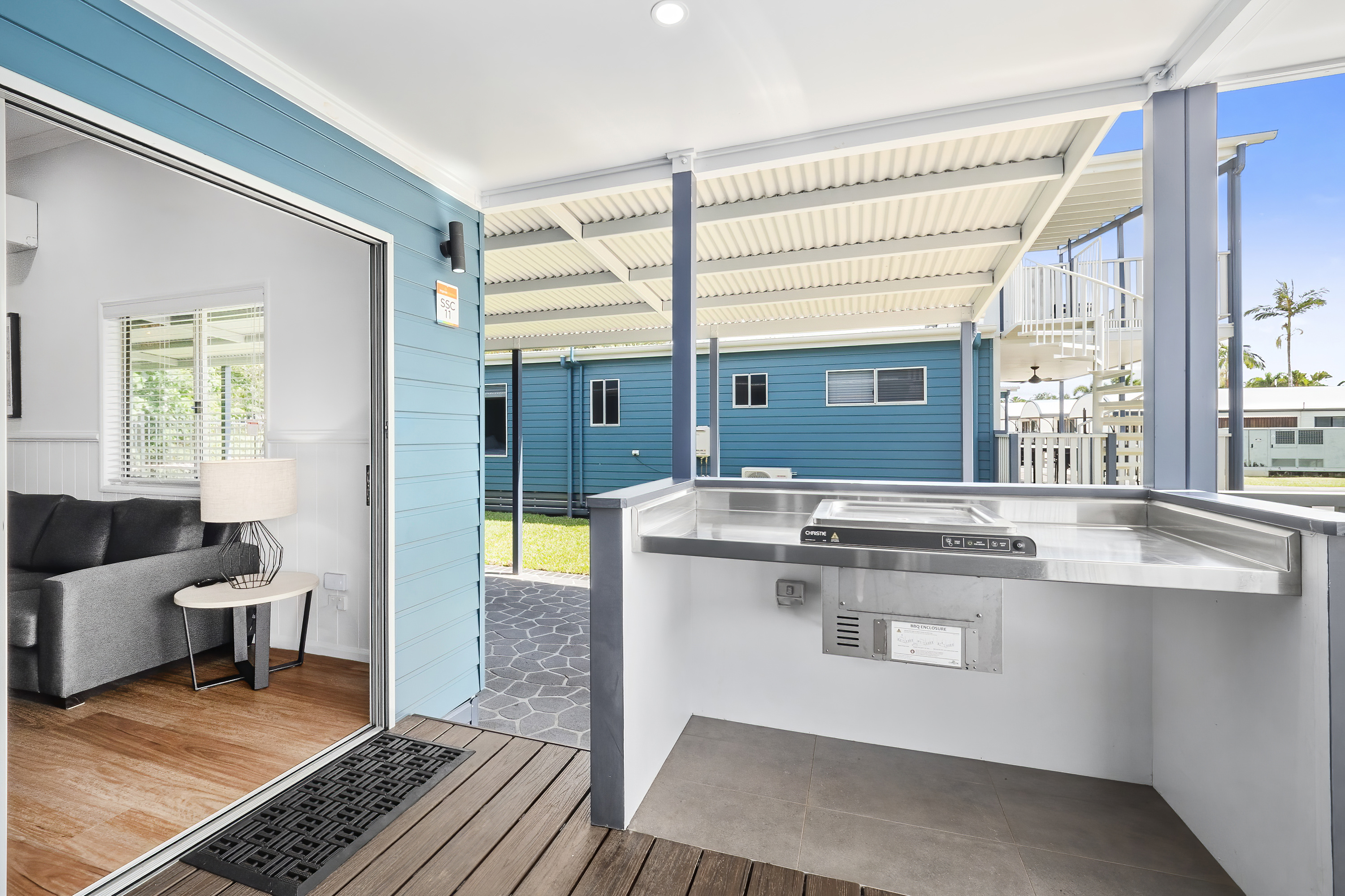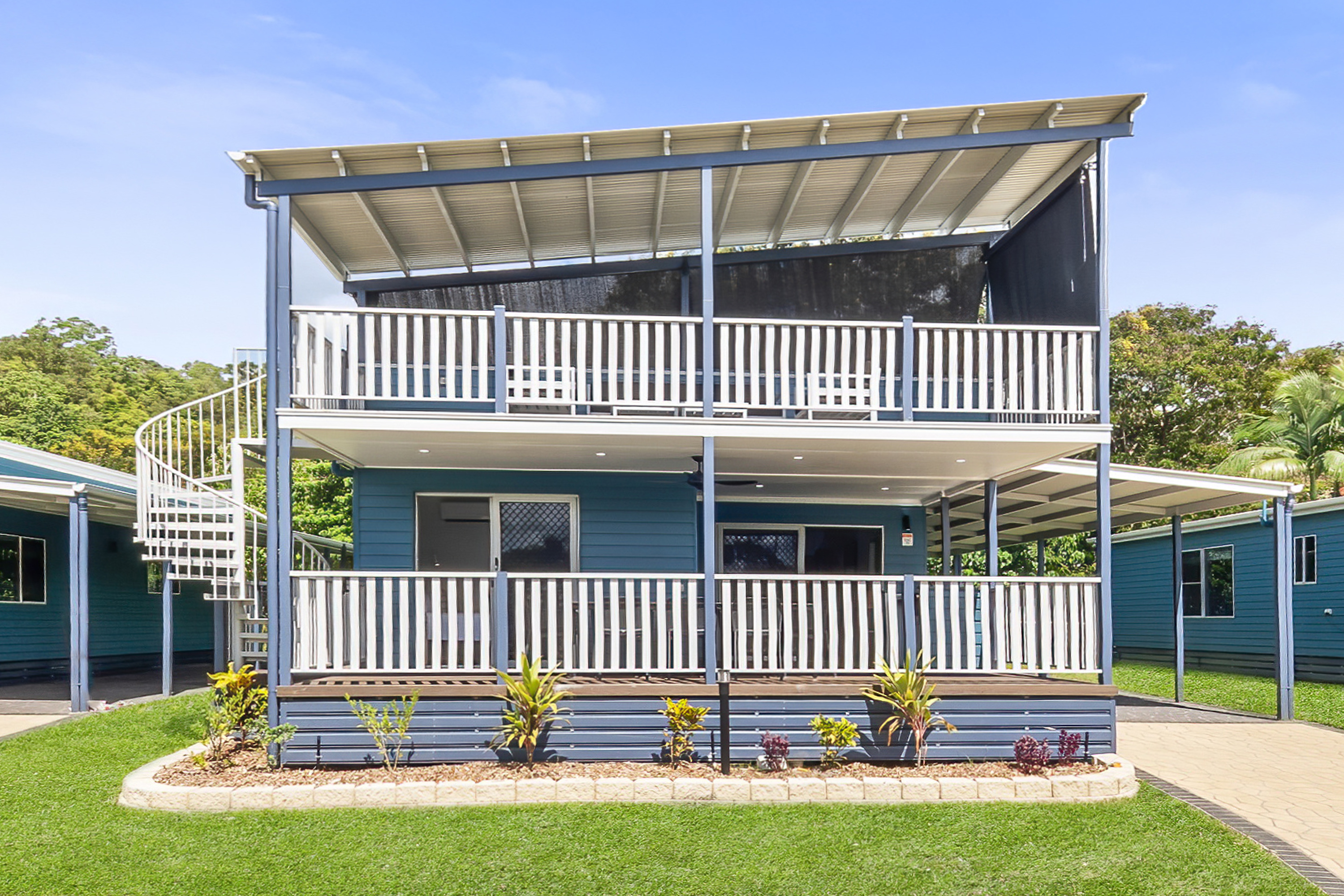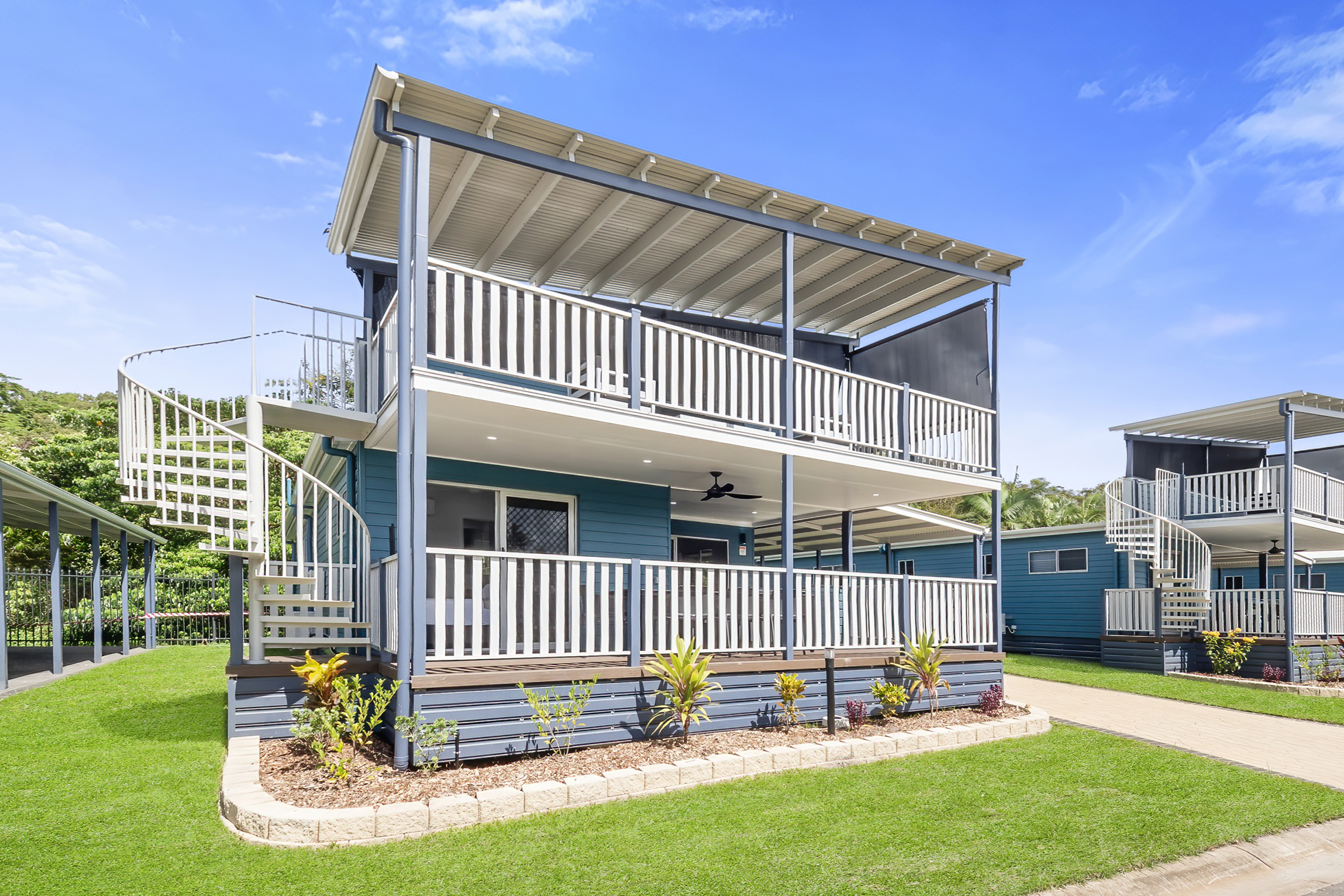 Our Superior Skyview Villas sleep up to eight guests with a king bed and TV in the main bedroom, a queen bed in the second bedroom, and two bunks in the third bedroom, as well as two bathrooms, a living area, internal laundry, and of course views of the resort and surrounding mountain ranges, plus an outdoor patio area on the ground level.