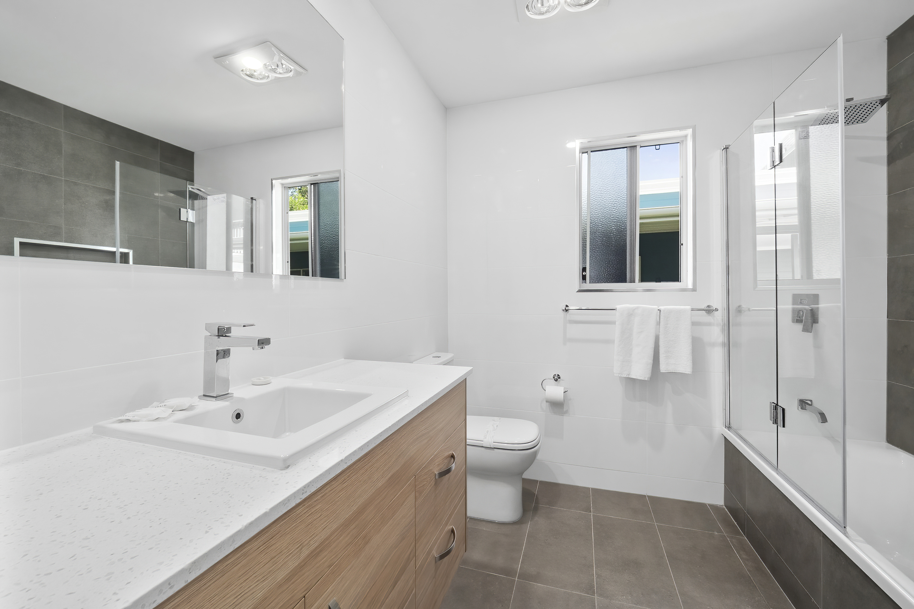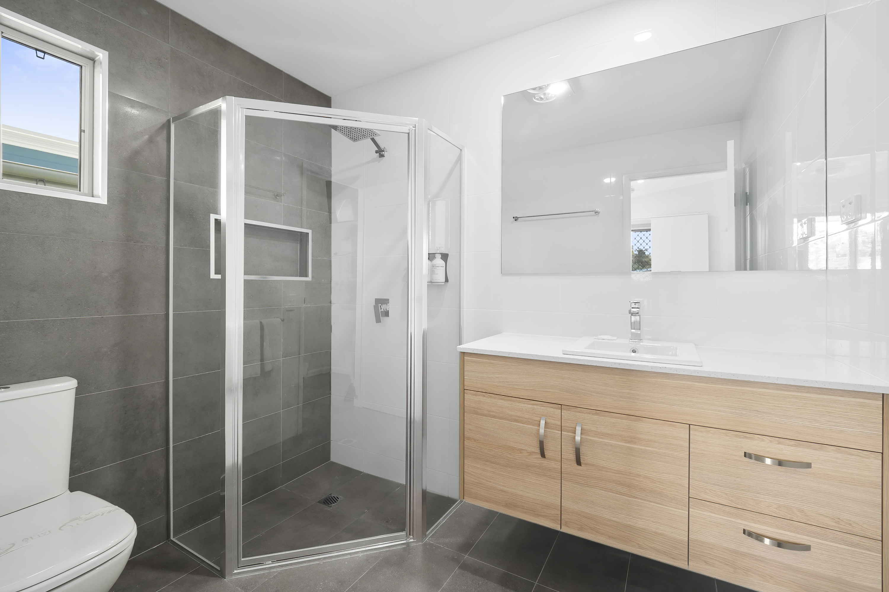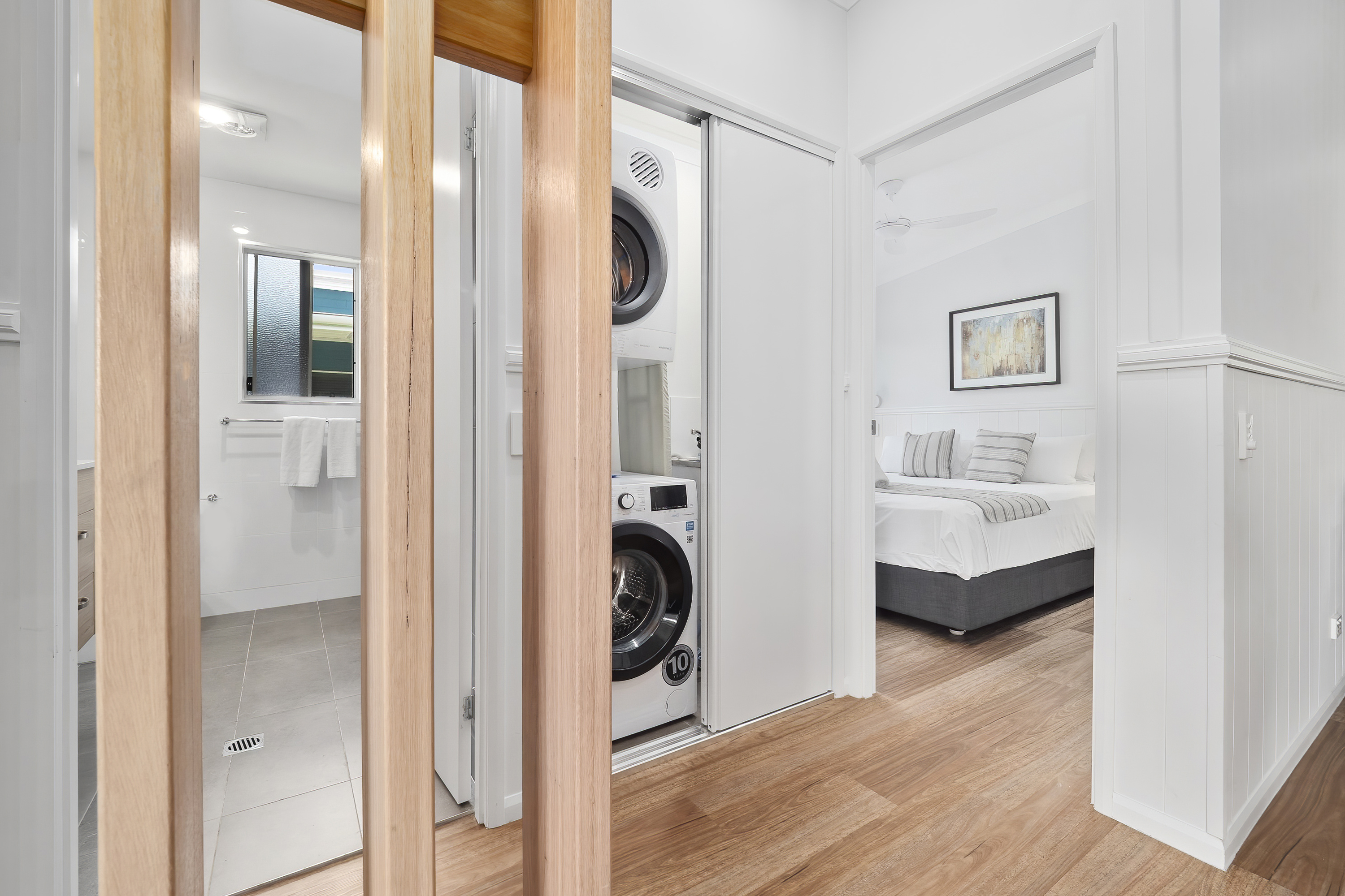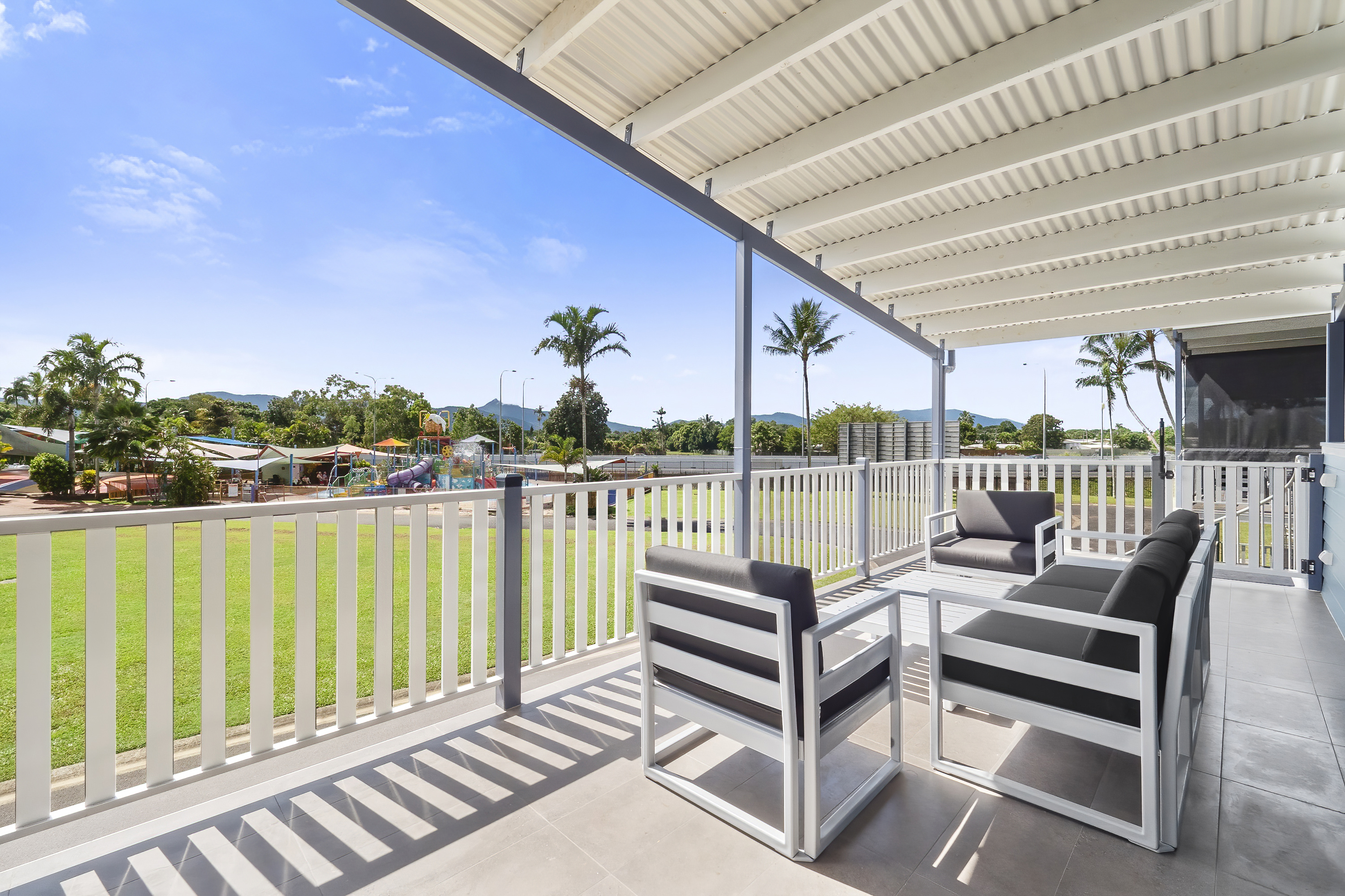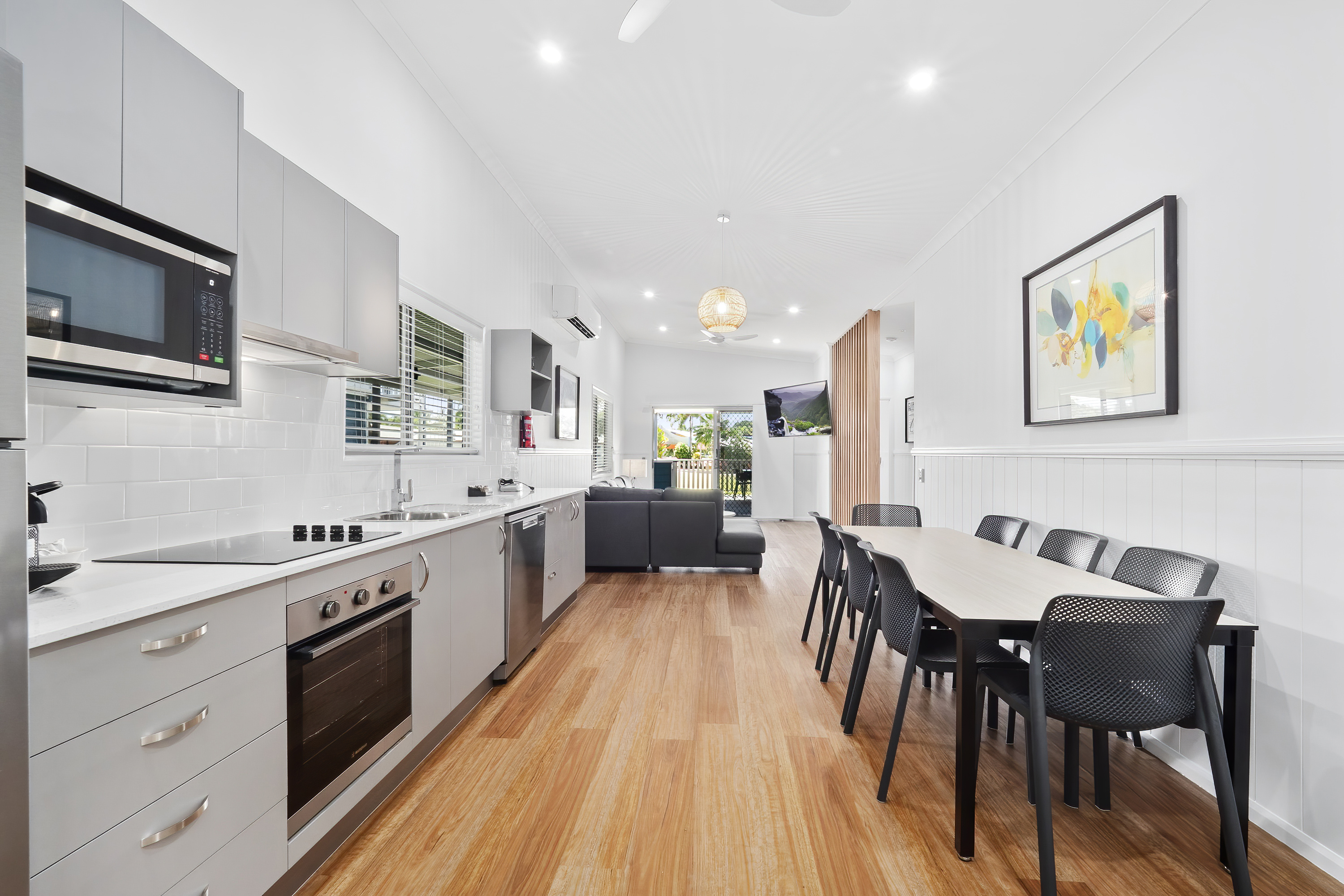 Our Superior Skyview Villas sleep up to eight guests with a king bed and TV in the main bedroom, a queen bed in the second bedroom, and two bunks in the third bedroom, as well as two bathrooms, a living area, internal laundry, and of course views of the resort and surrounding mountain ranges, plus an outdoor patio area on the ground level.