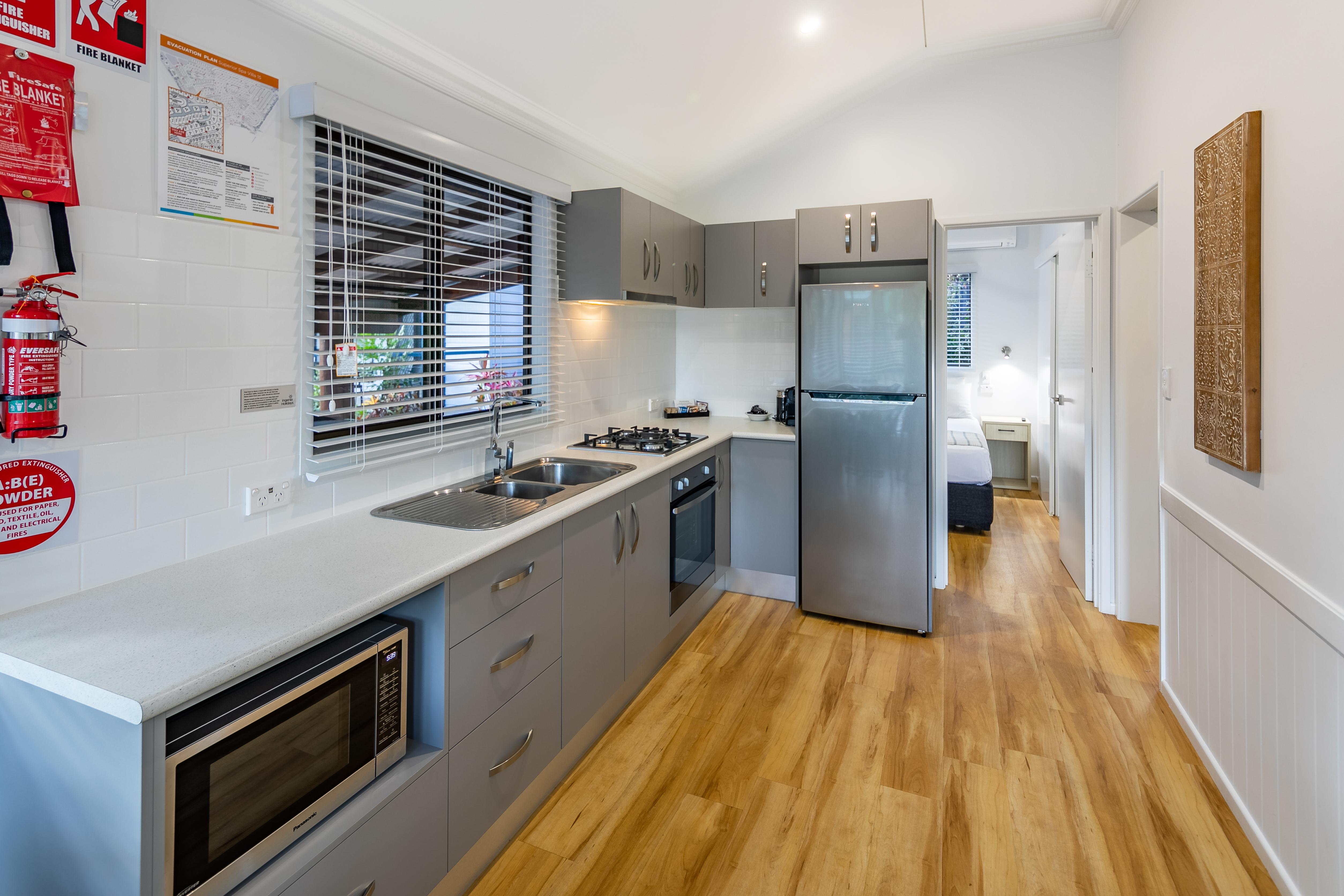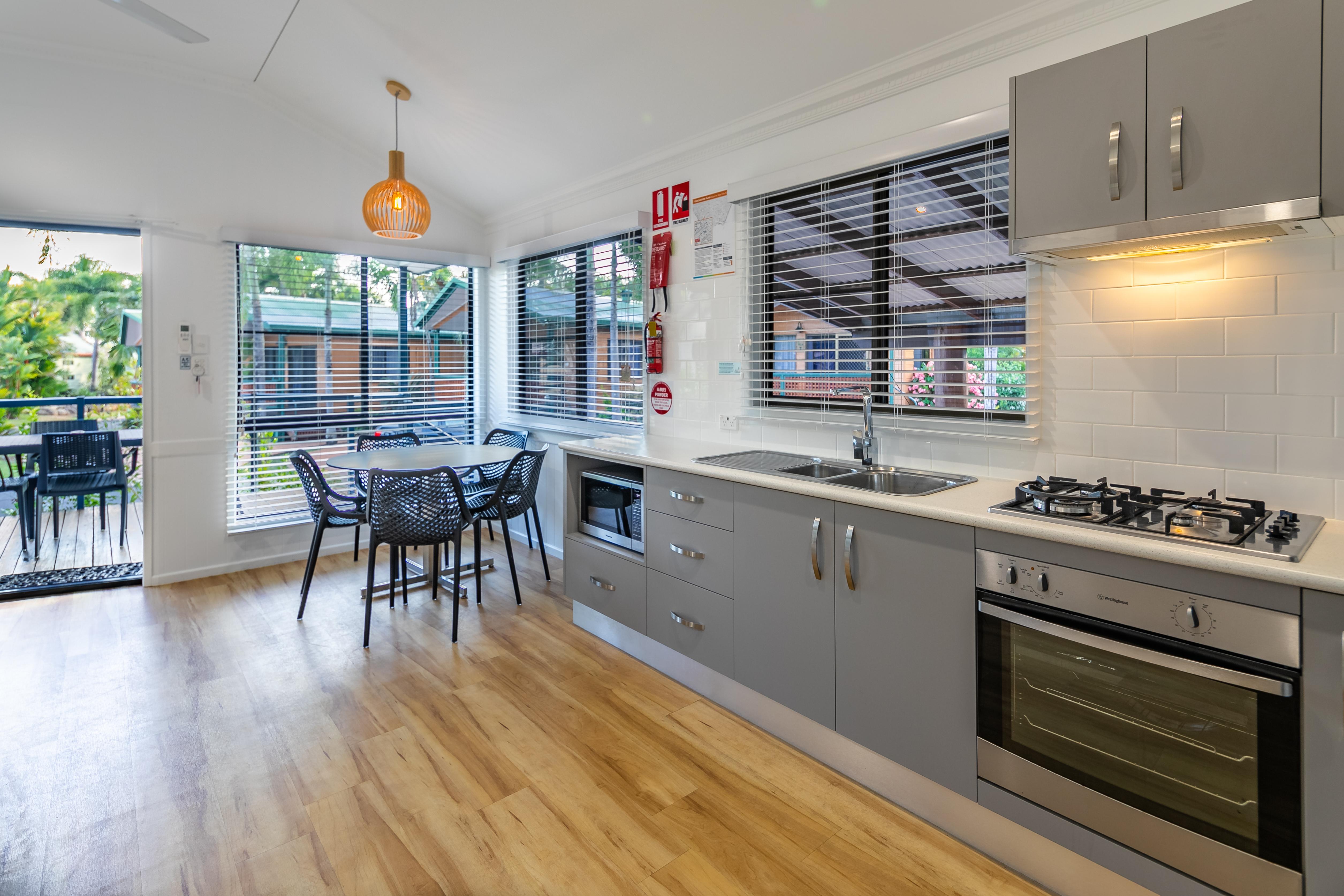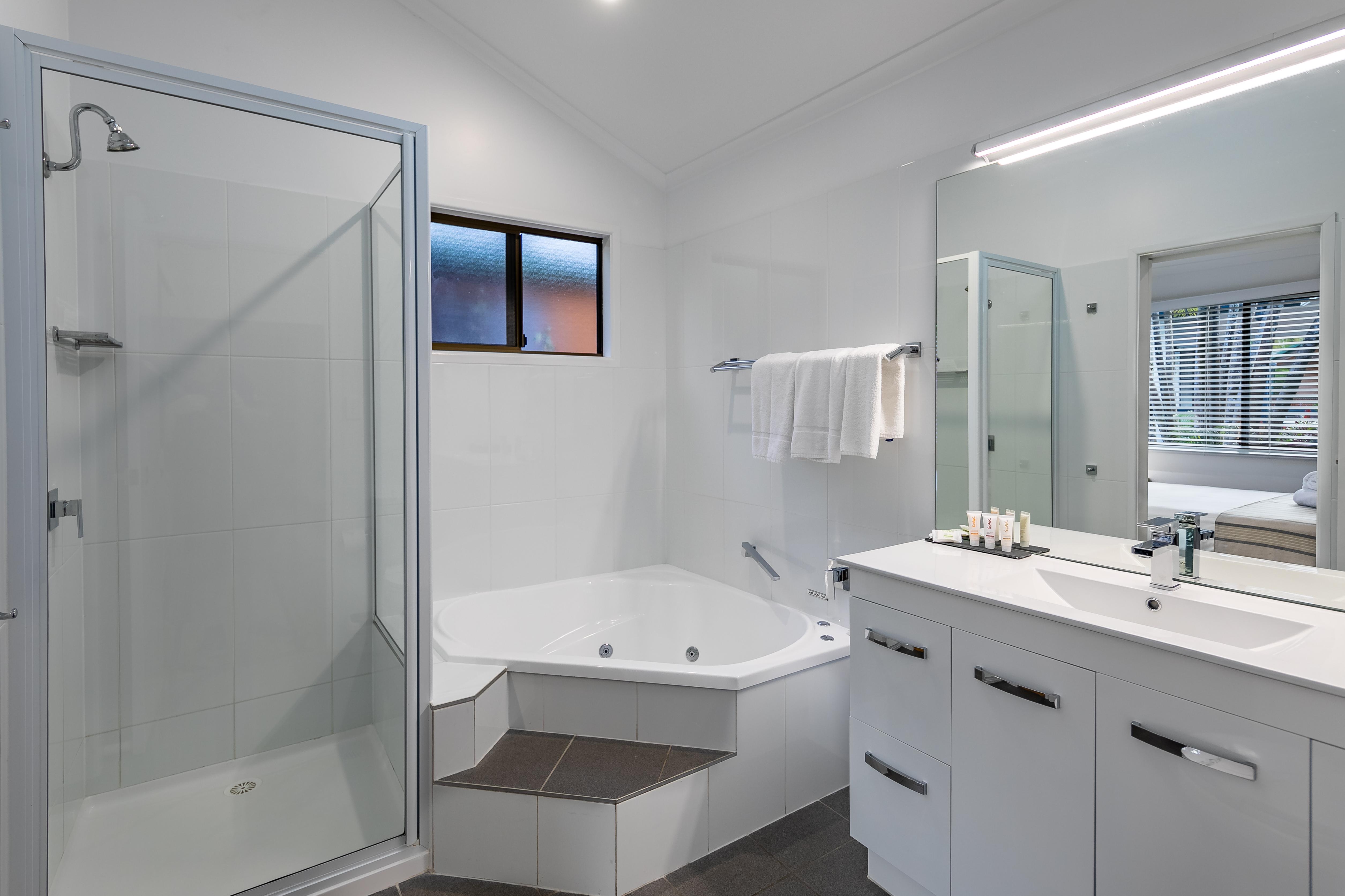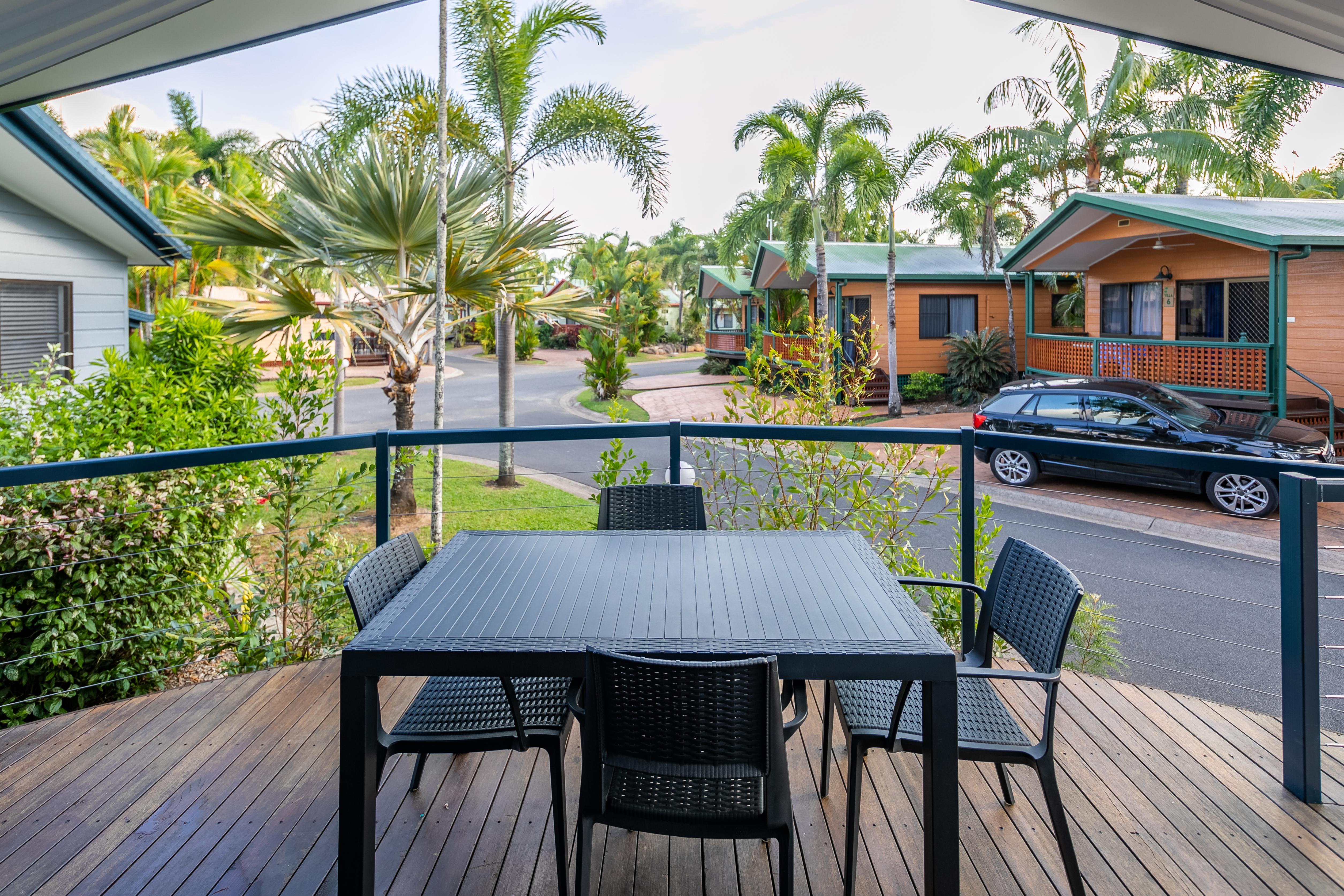 Our 2 Bedroom Superior Spa Villas sleep up to six guests and feature a queen bed, TV, and spa ensuite in the main bedroom, bunks in the second bedroom and a double sofa bed in the living area, as well as a bathroom, kitchenette, and private deck.