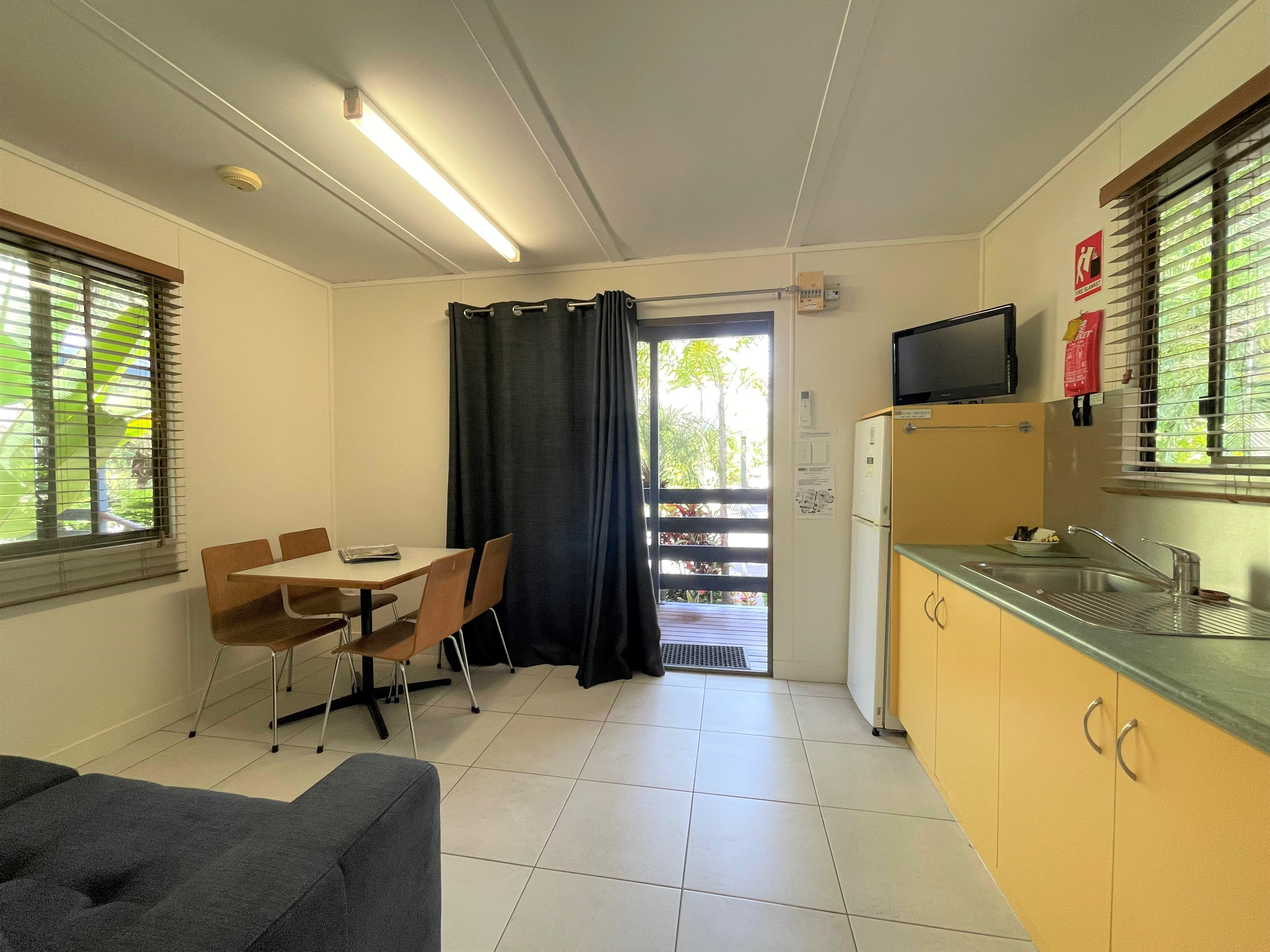 Our Sunbird Ensuite Cabins feature an open plan living area with dining table, couch and a deck with outdoor seating. Facilities include microwave, hotplates, electric frypan, jug, toaster, fridge, air-conditioning and television.