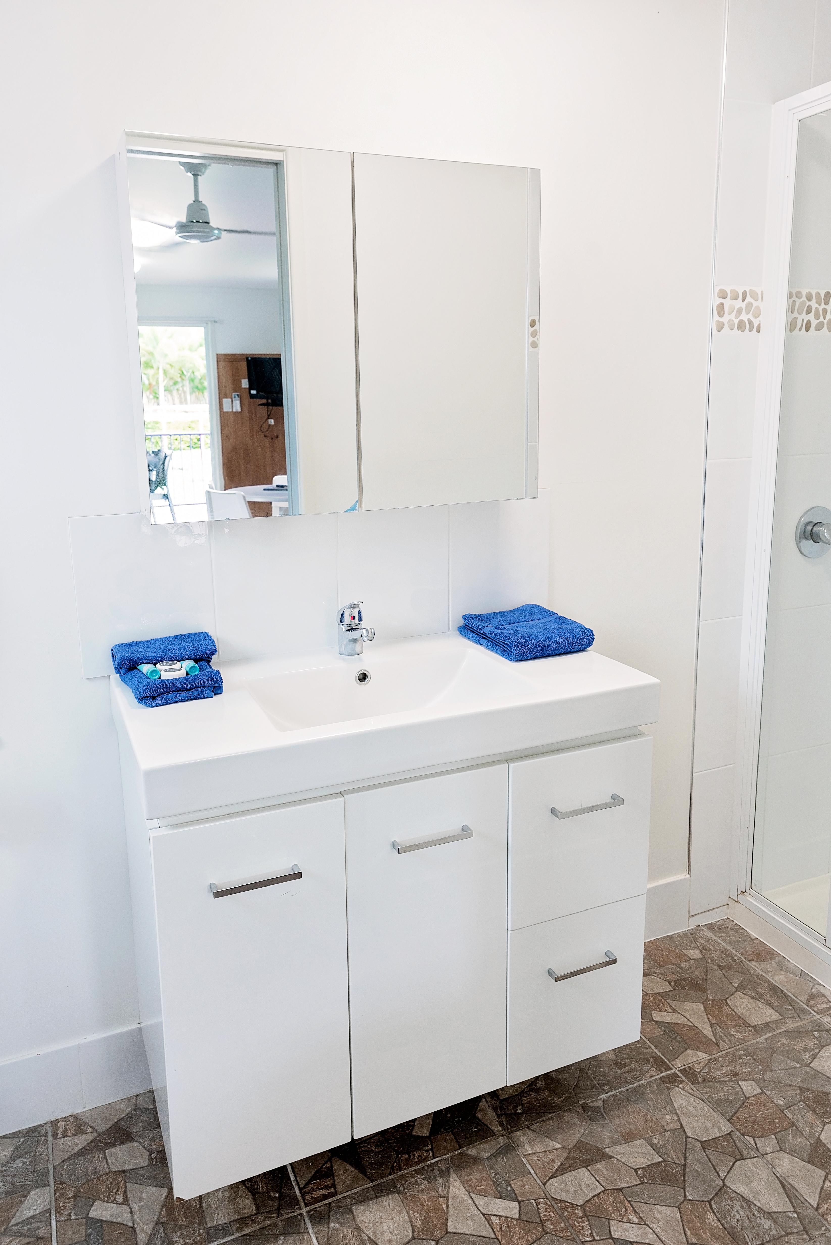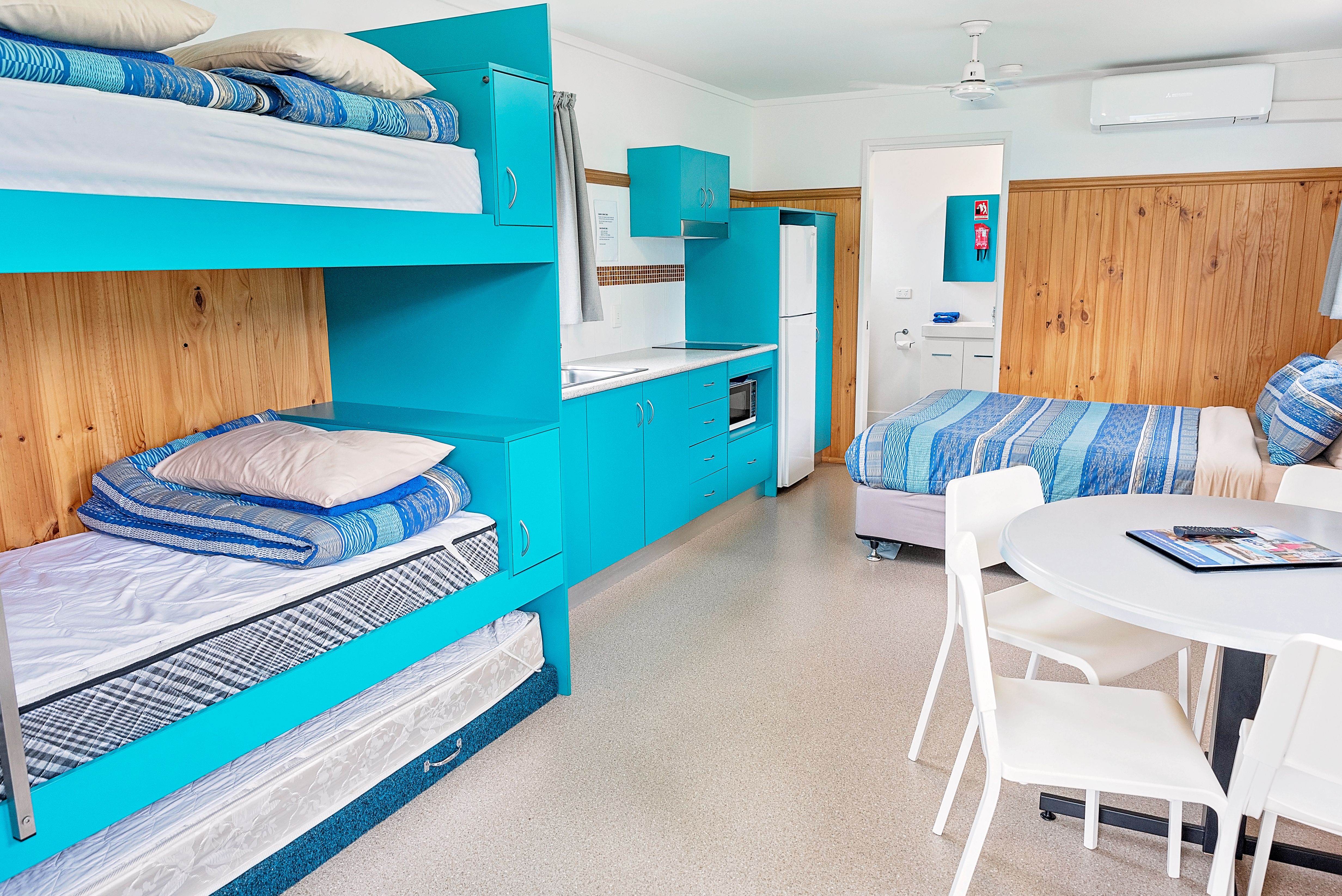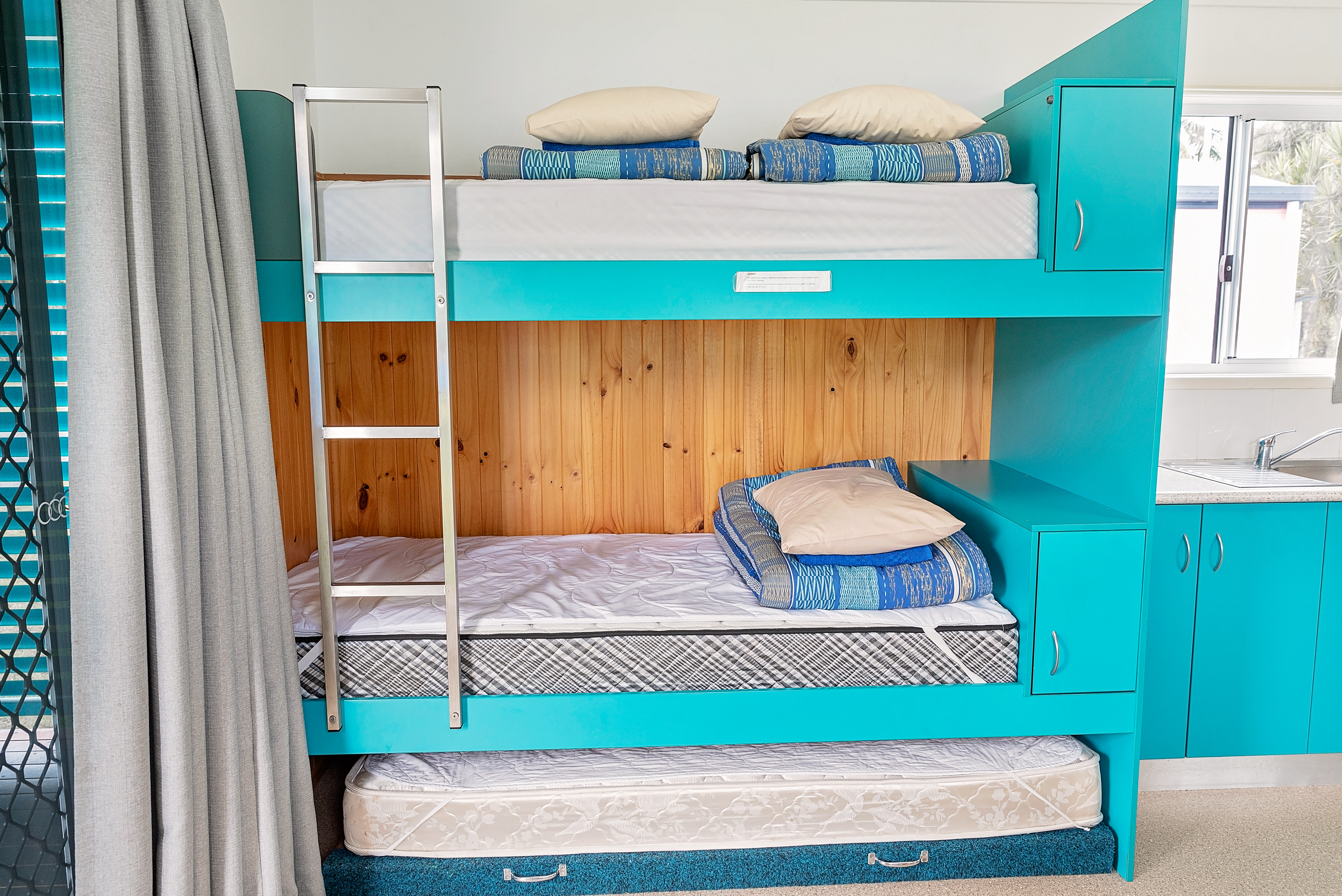 The Deluxe Ensuite Cabins or 'Grooper Shack' sleep 5. They have 1 queen bed, 2 single bunks and a trundle. They are fully self contained with linen on all beds and a huge deck with a private BBQ.