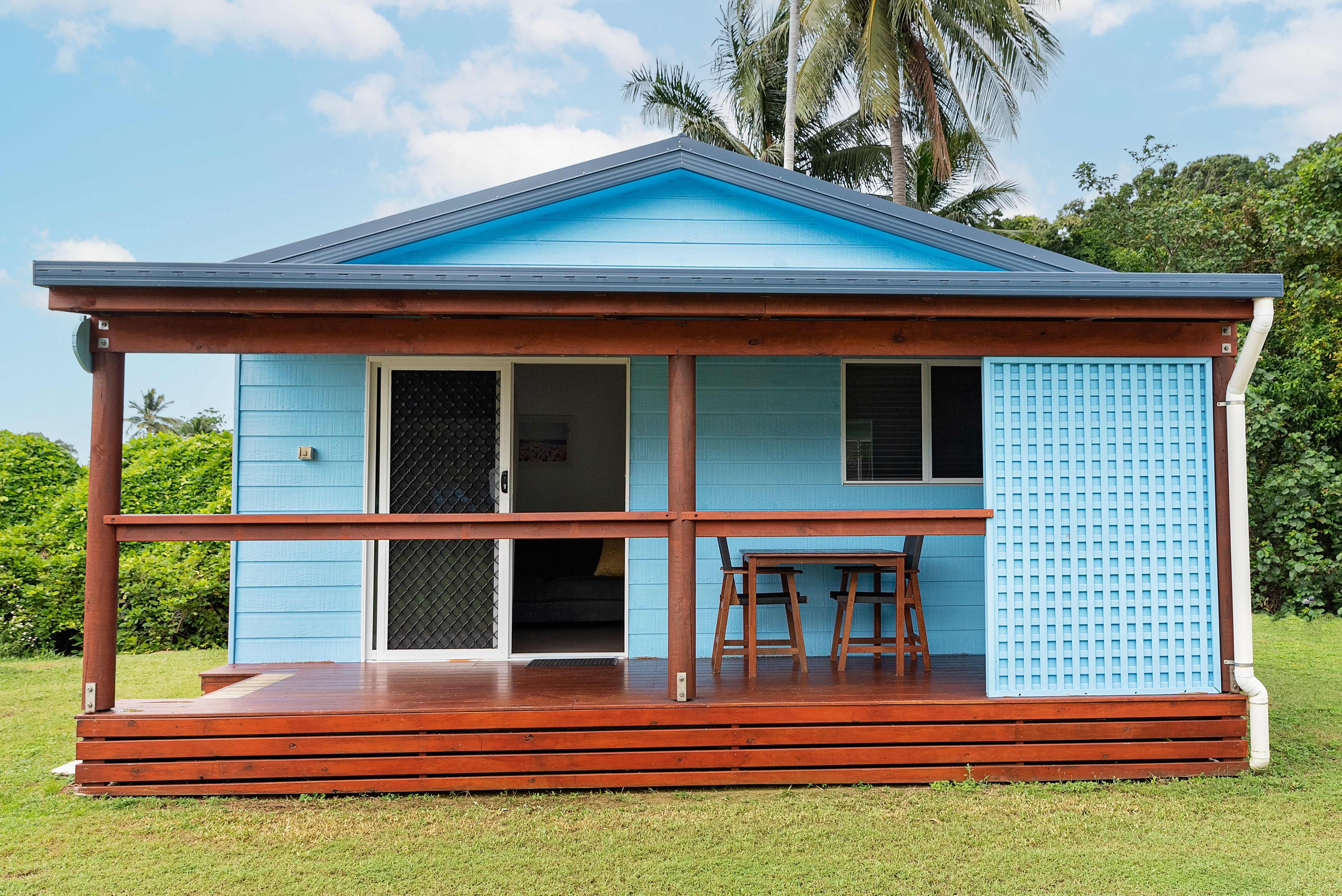 The Deluxe Villa or 'Turtle Shack' has a separate bedroom with one queen bed and a full kitchen, including an oven.