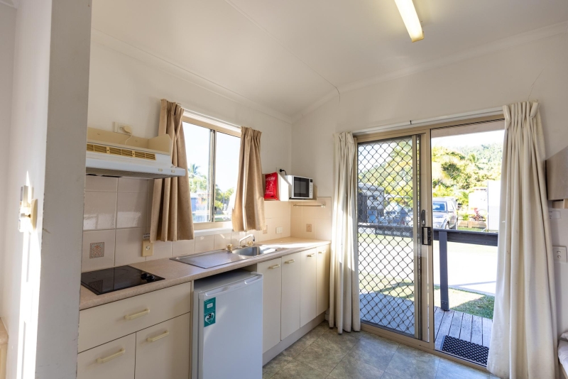 Open plan cabin with queen bed. Air conditioned with kitchen. Sleeps up to 2.