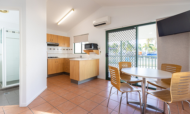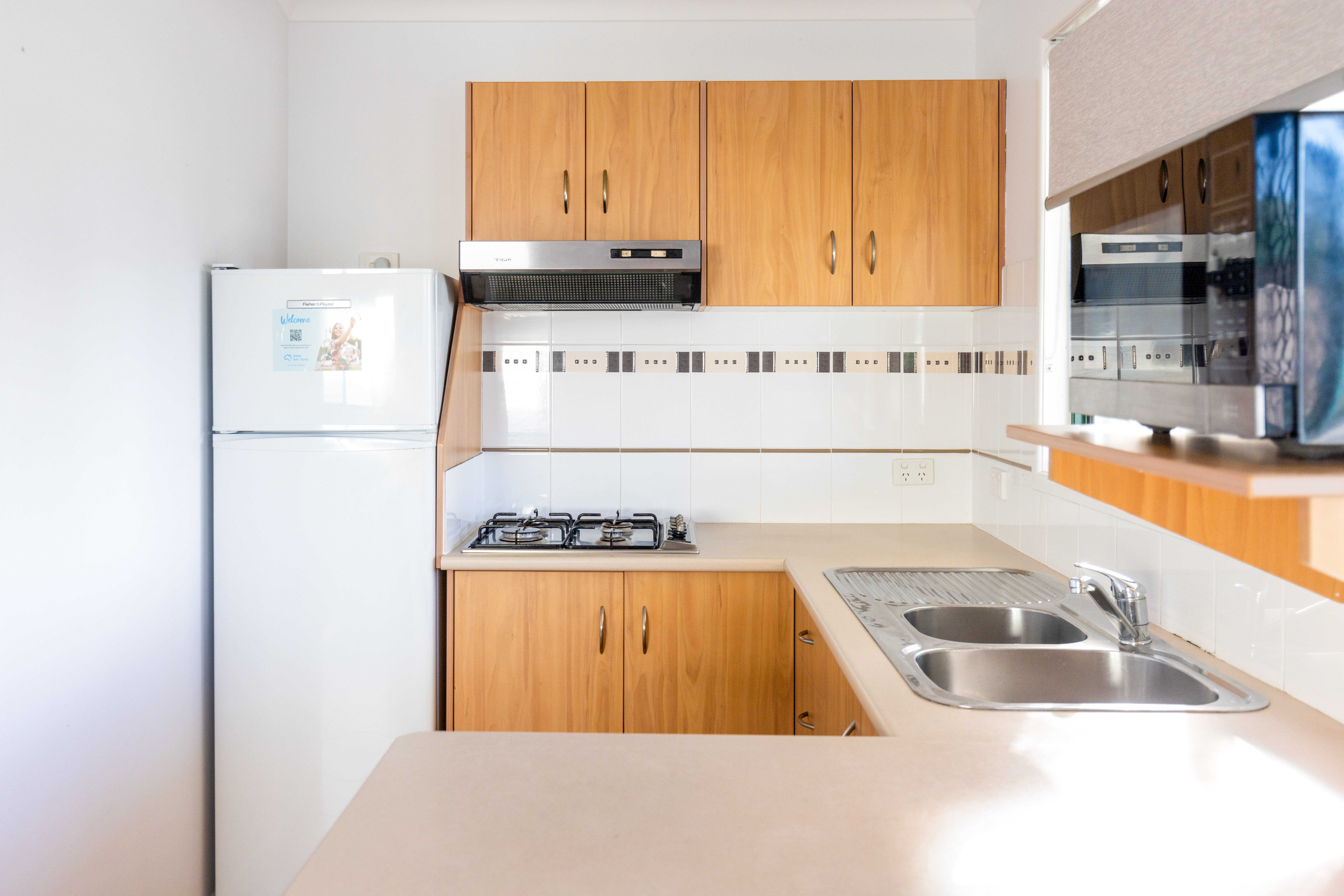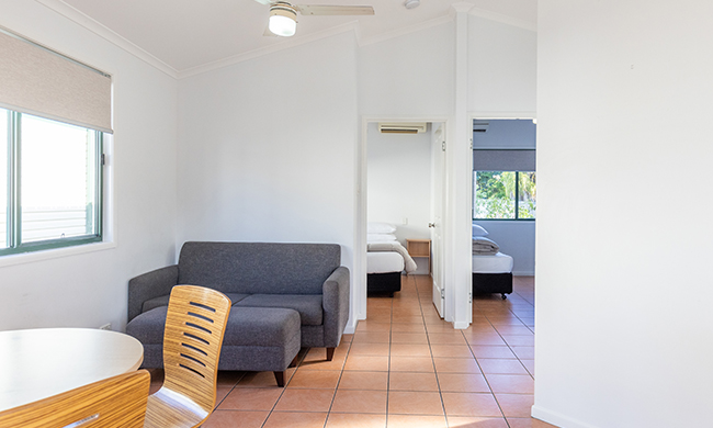 Located overlooking the lagoon pool, 2 bedroom villa sleeps four. One queen bed and two single beds. Featuring air conditioning; full kitchen with microwave, oven and fridge; bathroom; dining area; lounge with TV; small shaded veranda; parking for one vehicle.
