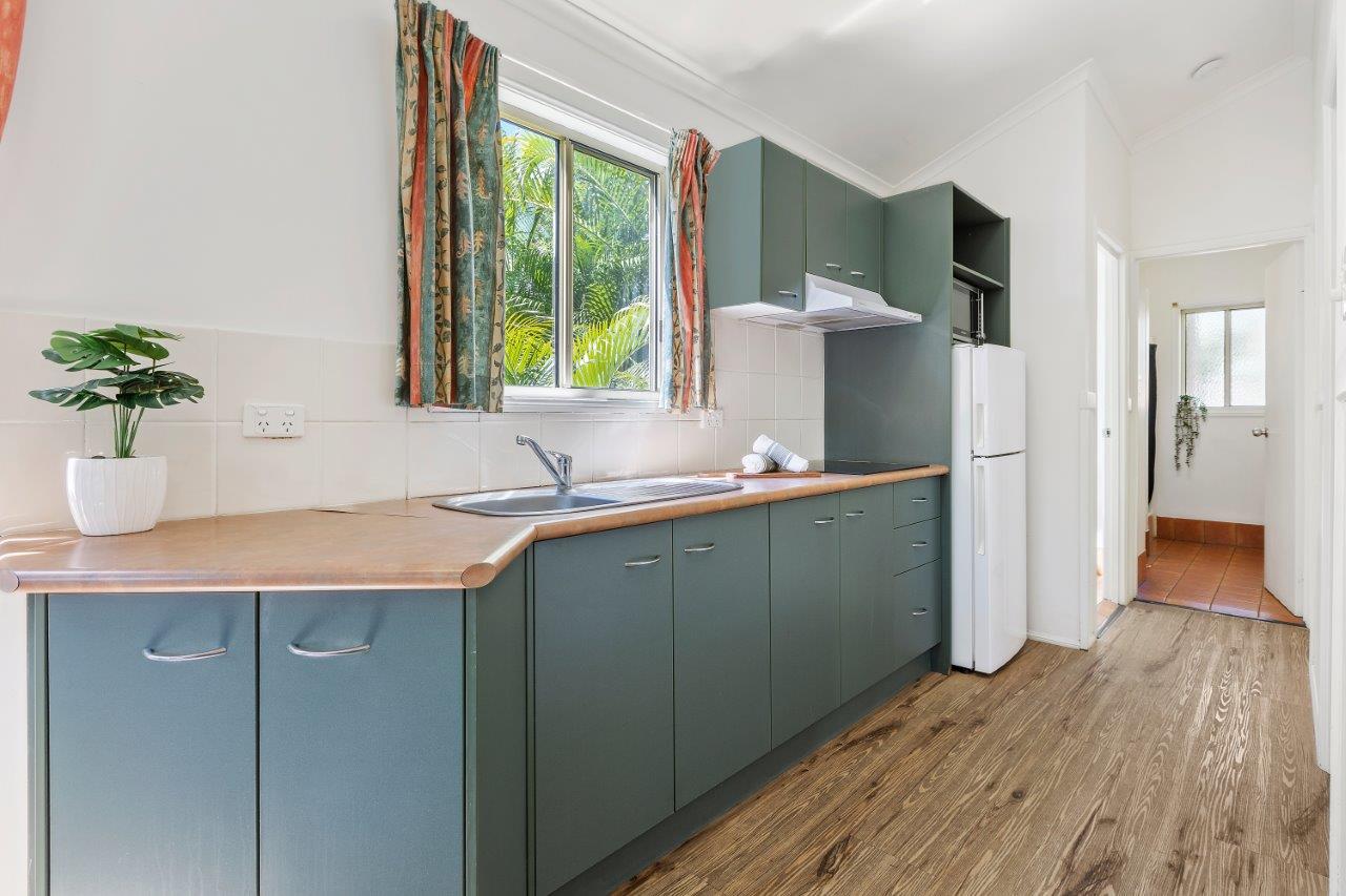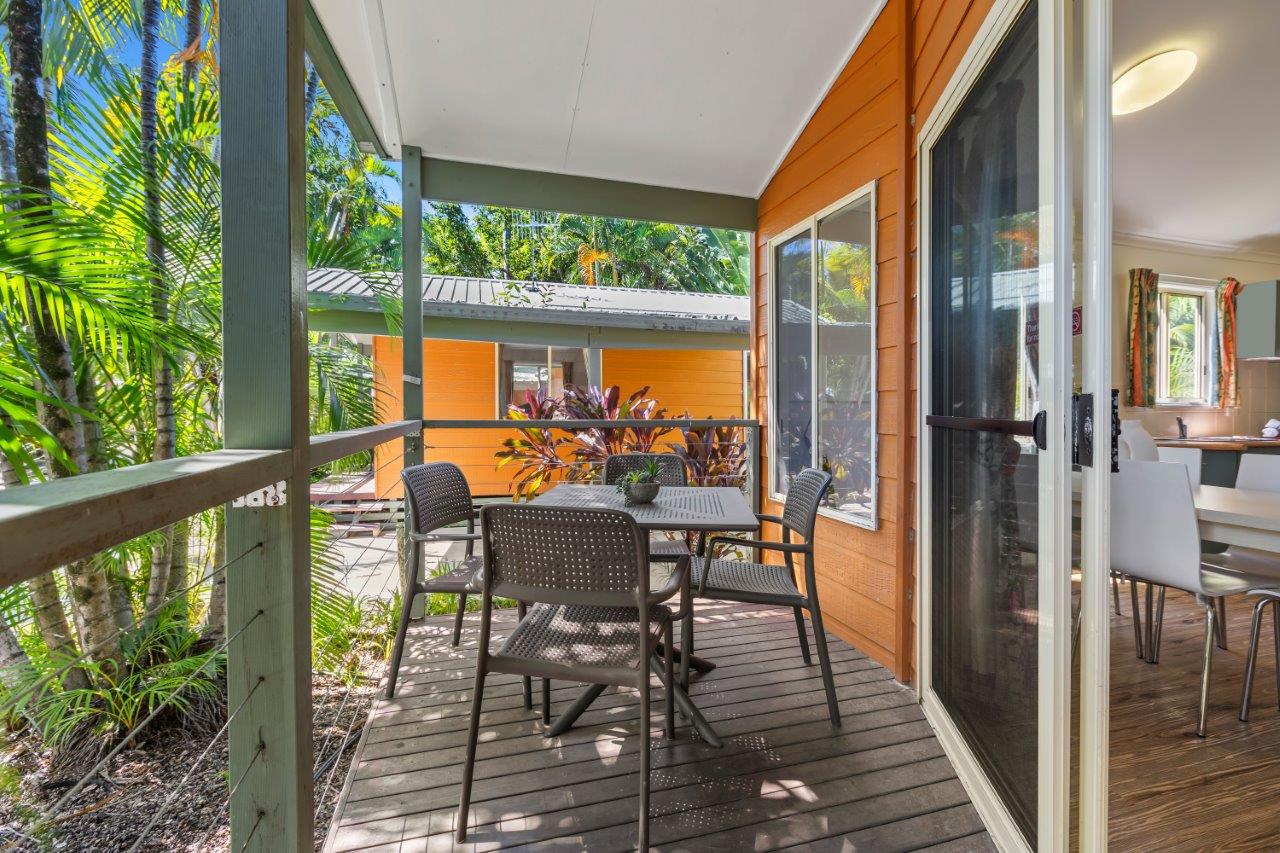 Our Garden Villa has 2 bedrooms: one with a queen bed and the other with 2 sets of bunks. The kitchen is well equipped with a microwave and stovetop. You’ll find a separate dining area and a TV in the lounge. Step out onto the balcony with outdoor furniture. The villa includes a bathroom and a separate toilet, plus air conditioning and fans throughout. It's ideal for families or small groups. Enjoy covered parking outside. Linen is provided. Sorry, no pets.