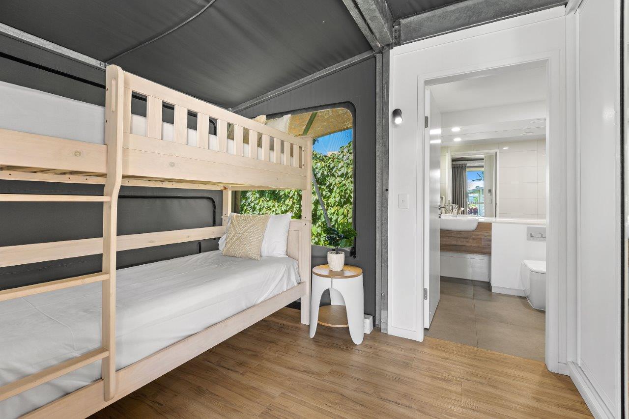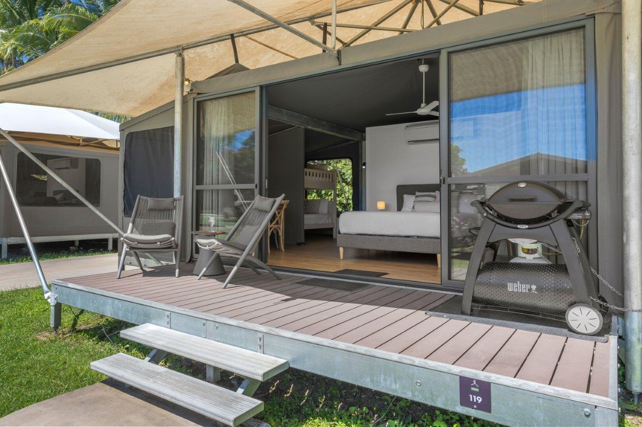 Nestled in our tropical grounds, our Glamping Tents offer a true holiday oasis in The Whitsundays. Each tent features an open plan layout with a queen bed, two sets of single bunk beds, and a kitchen, dining, and lounge area for unwinding after a day of adventure. Step outside to the outdoor deck to relax or fire up the Weber BBQ with family and friends.