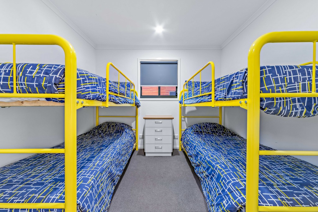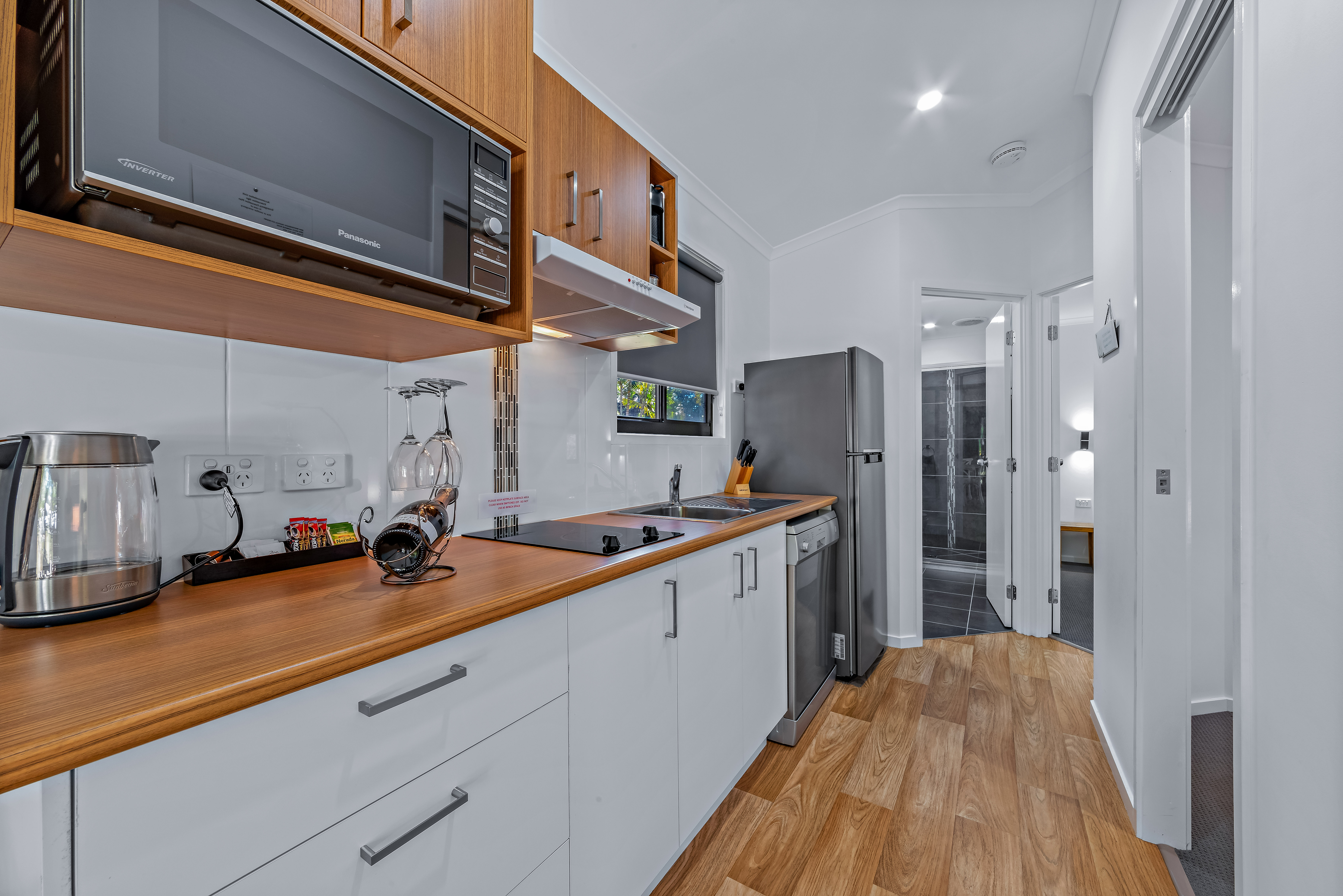 The layout includes one queen bed and two sets of bunks, making it a great choice for families. The fully equipped kitchen features a stovetop, microwave, dishwasher, and large fridge. With air-conditioning and a spacious deck, it’s easy to relax after exploring the Whitsundays.