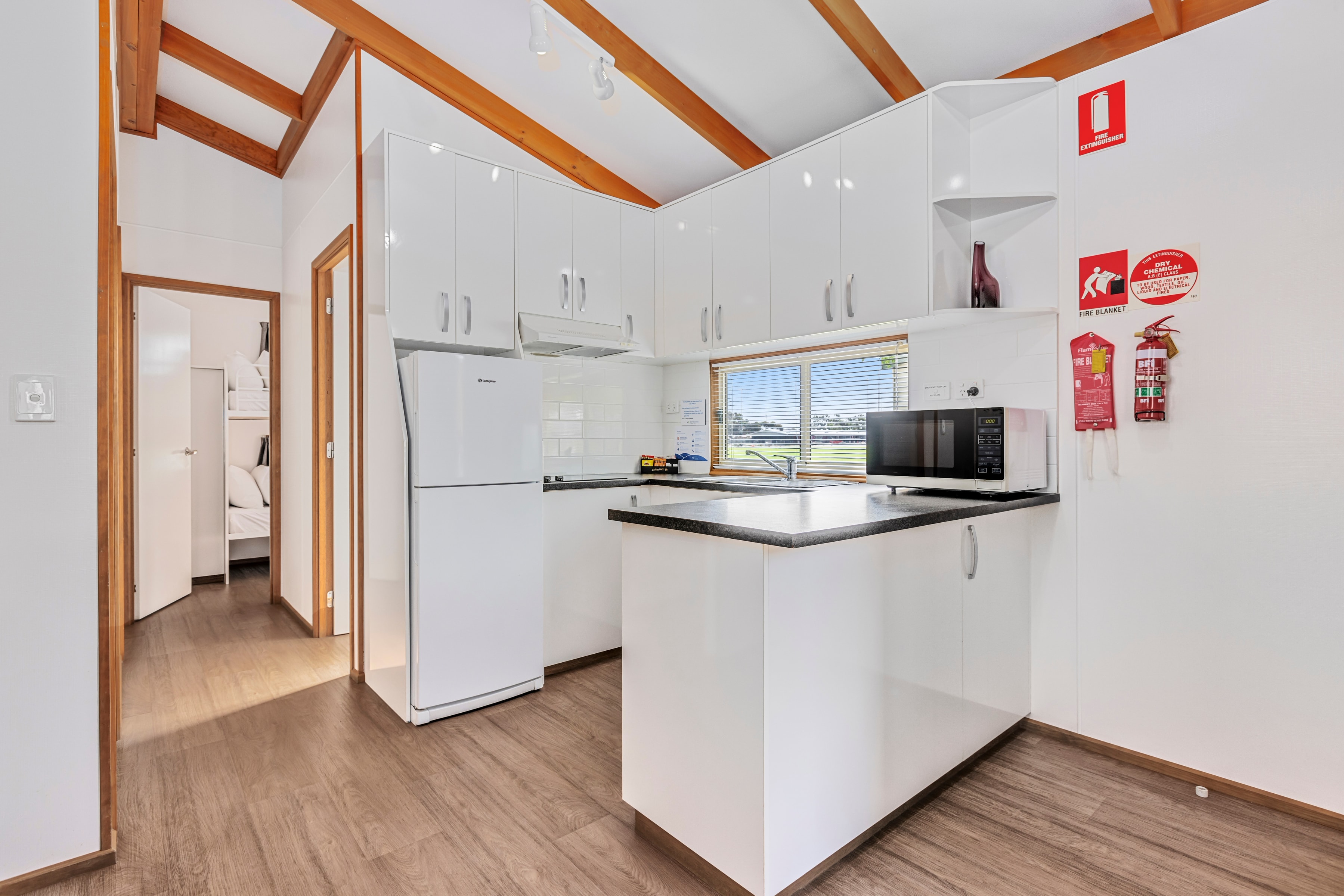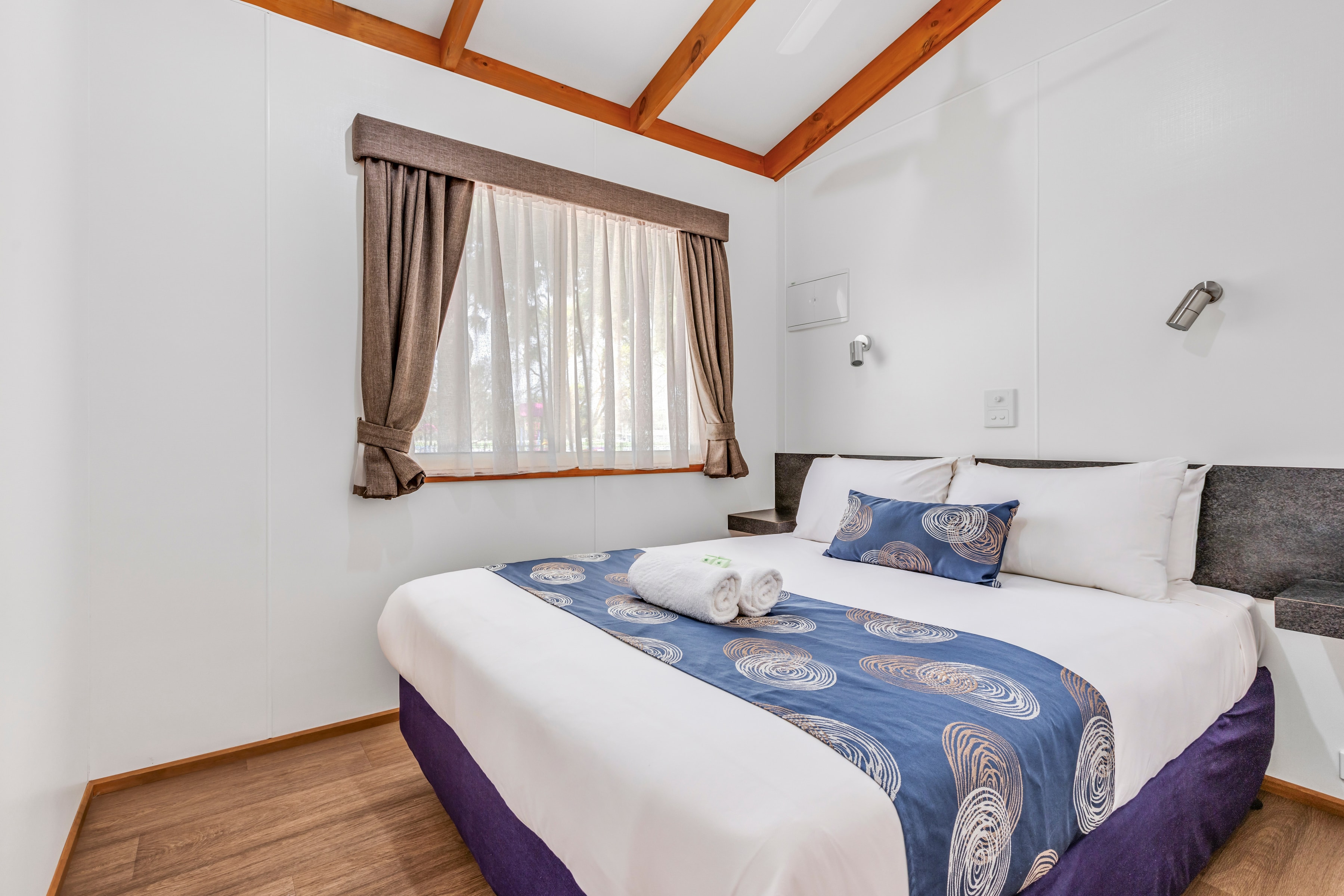 The Chardonnay cabin sleeps 6 with one queen bed in the main bedroom and four single beds (2 sets of single bunk beds) in the second bedroom. Linen and towels are provided to all beds.