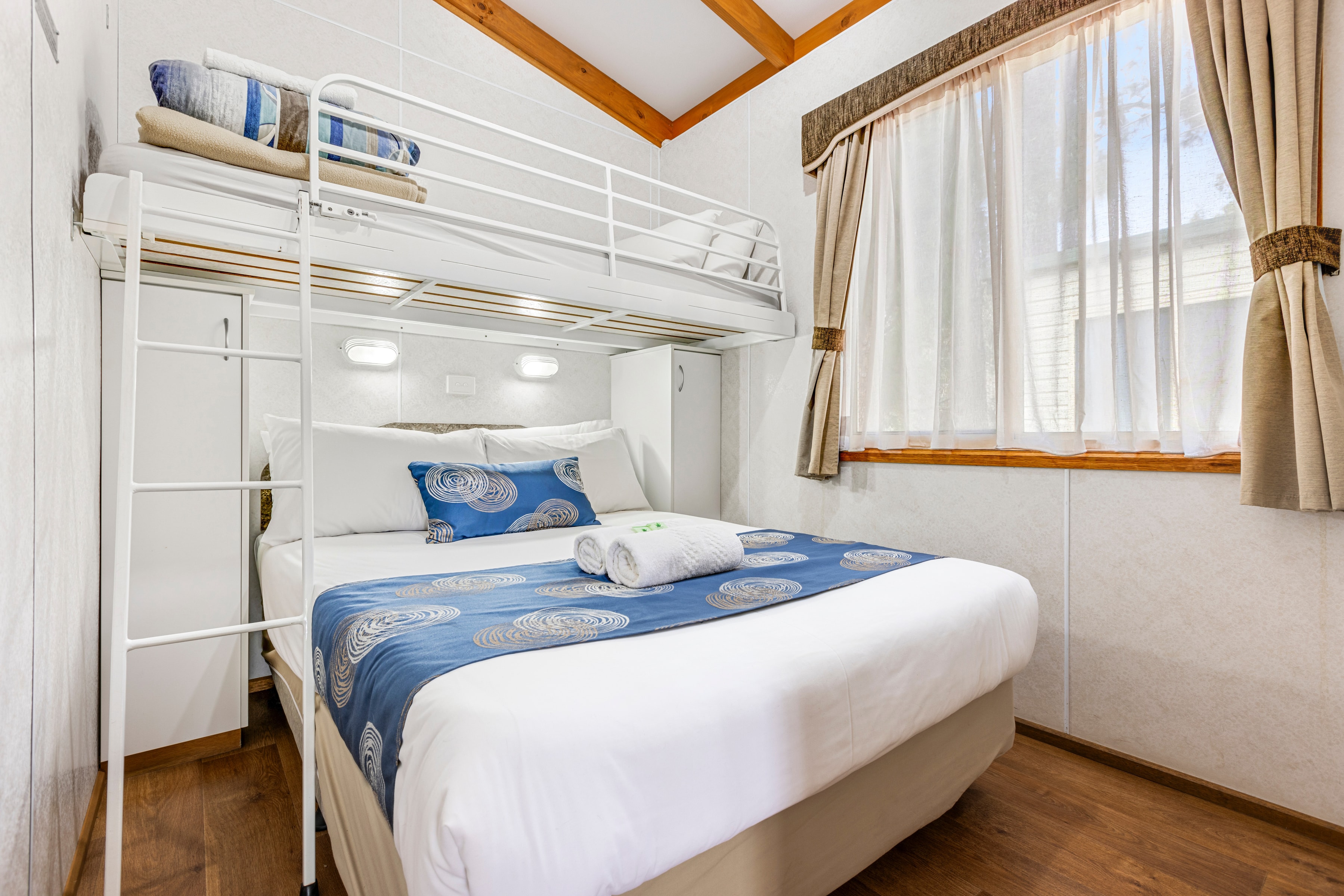 They have a queen bed in the main bedroom and double bed with pull down bunk bed in the second bedroom. Linen and towels are provided to all beds.