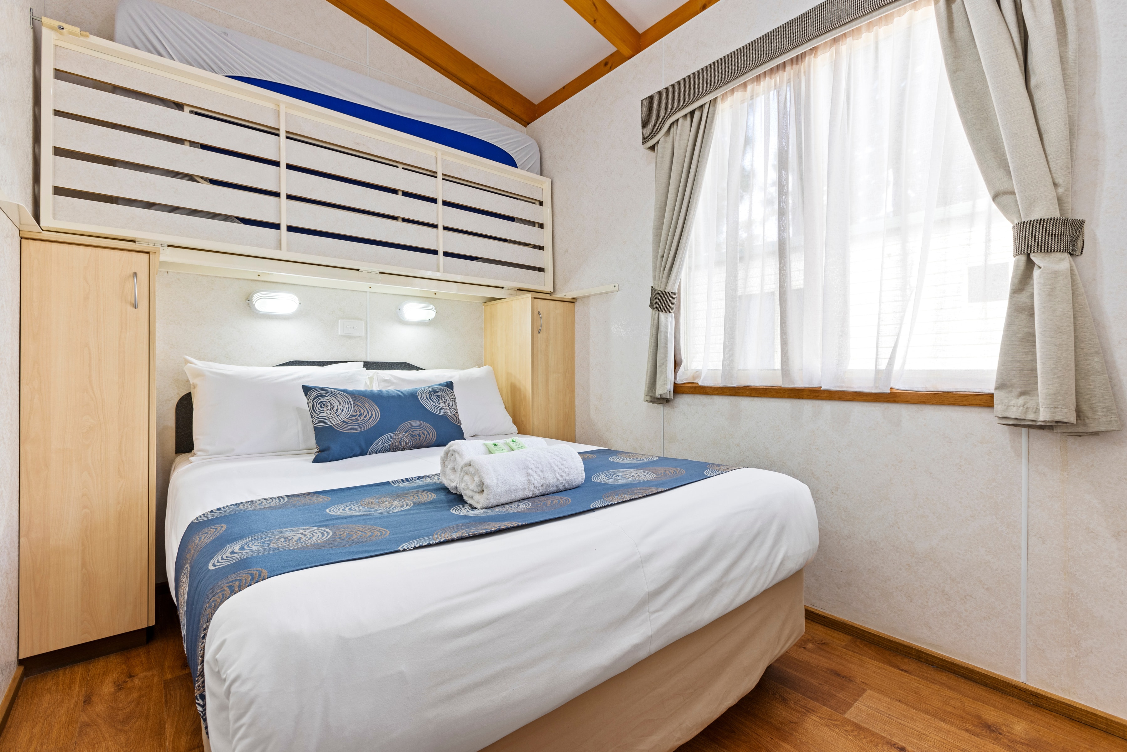They have a queen bed in the main bedroom and another double bed in the second bedroom with a single pull-down bunk overhead. Linen and towels are provided to all beds.