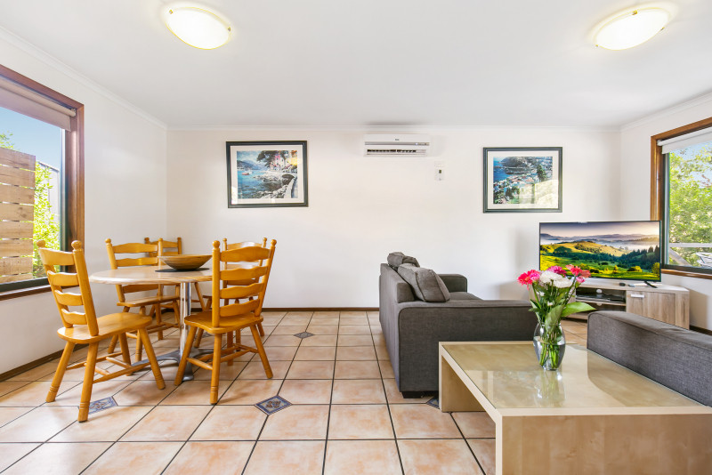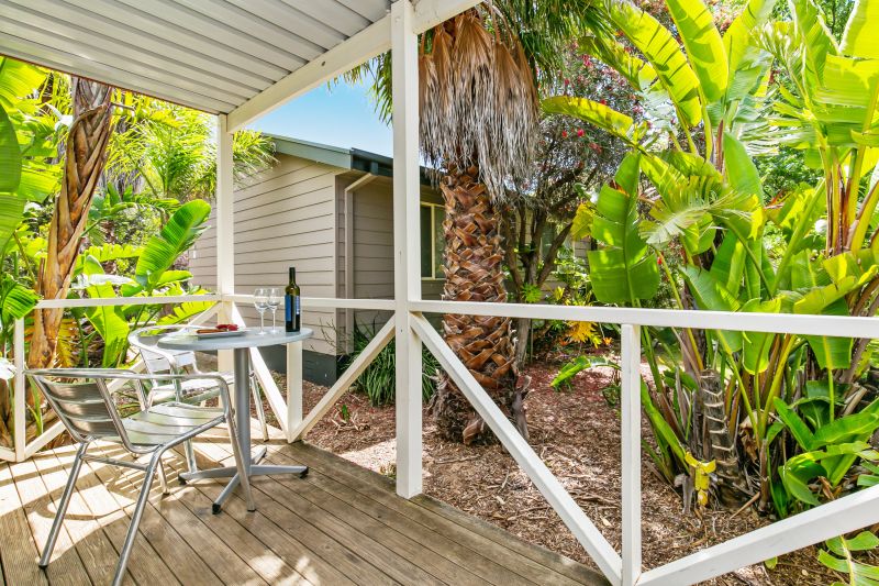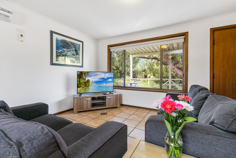 You’ll enjoy a self-contained kitchen with a fridge, microwave, stovetop, and ample crockery and cutlery, along with a dining area and TV in the living space. Stay connected with fast internet and enjoy your favorite shows and movies with streaming available right in the cottage. The bathroom has a shower, toilet, and vanity, and the cottage is air-conditioned for your comfort.