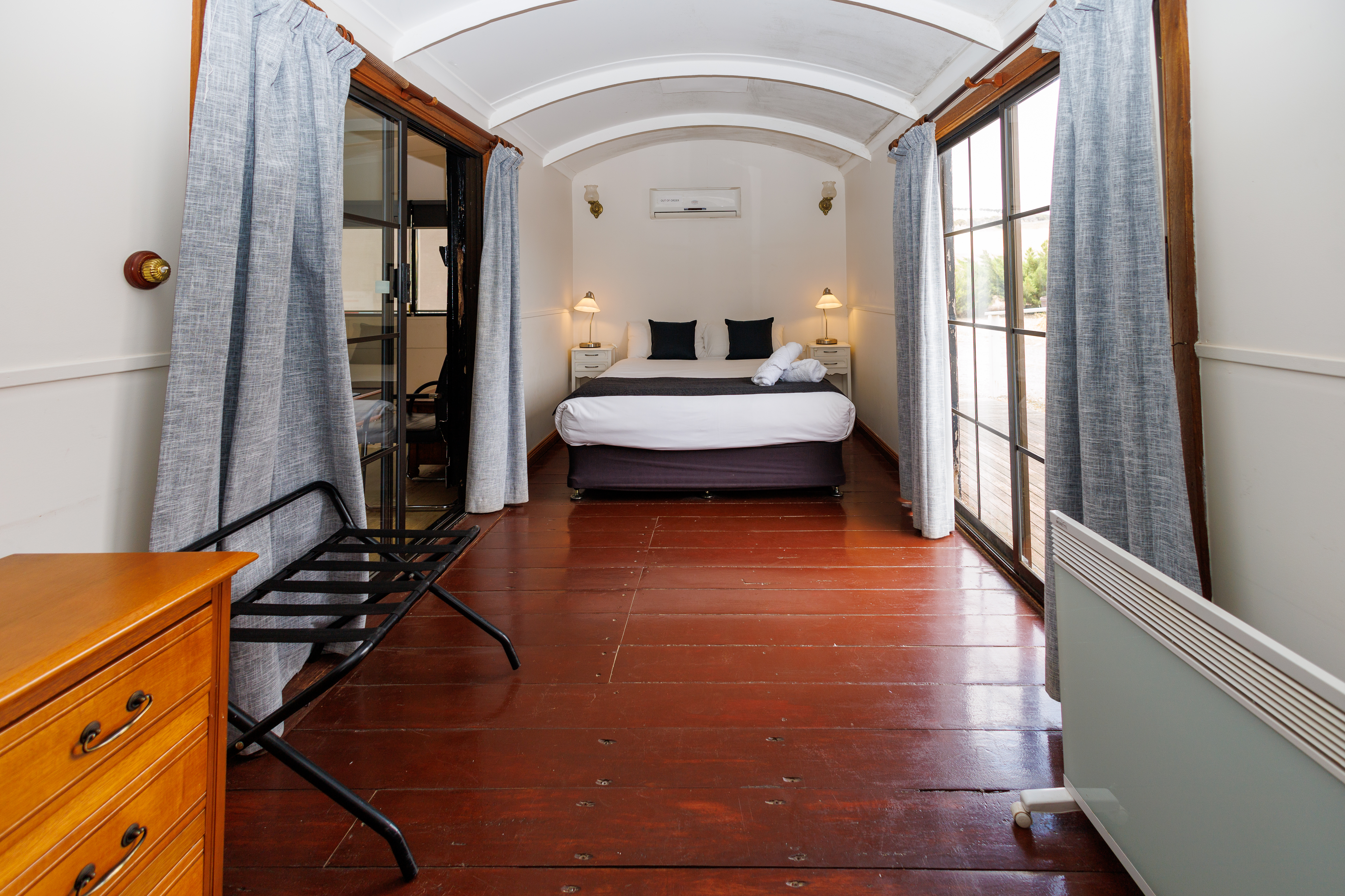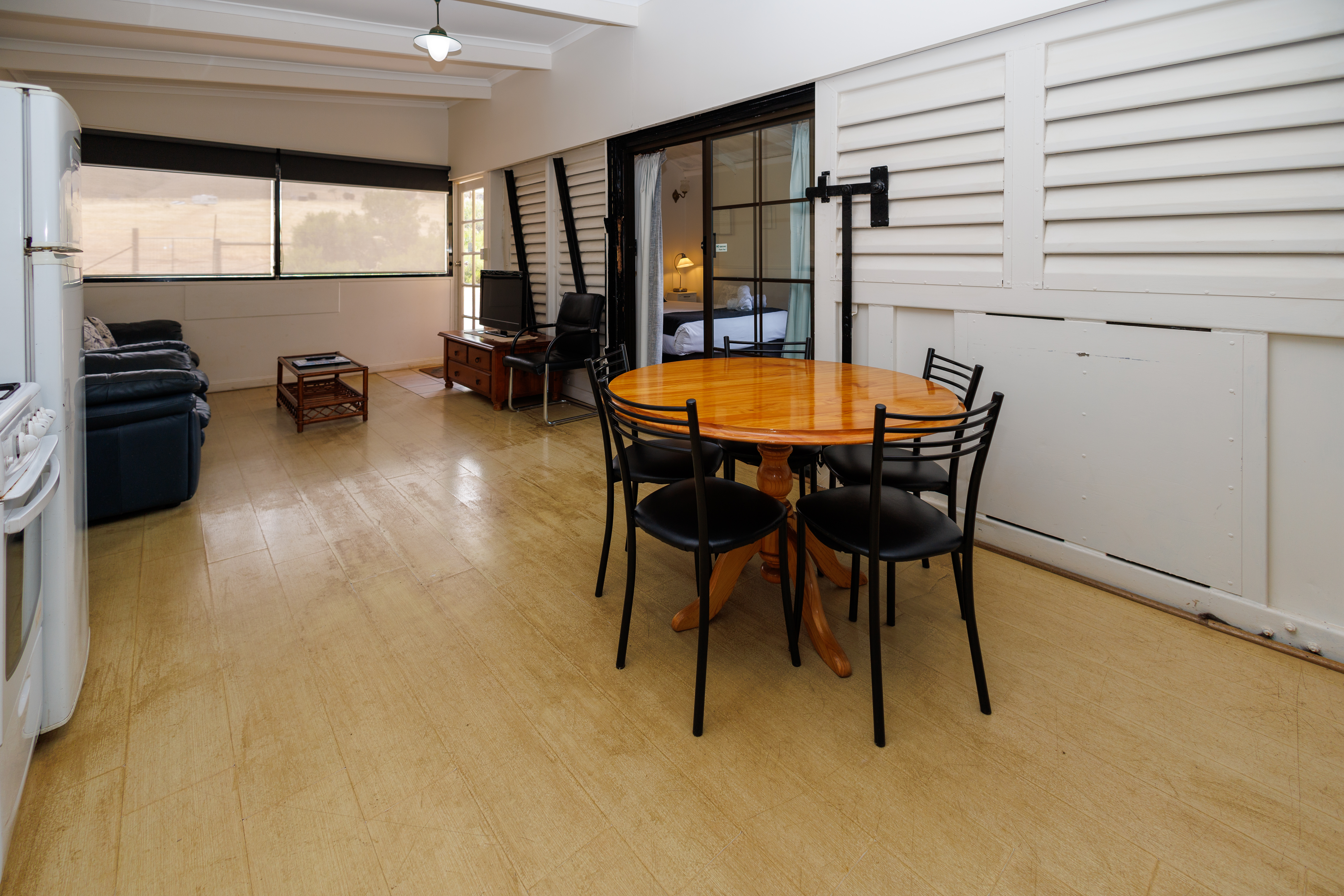 Railway Cottage/Cabin is a very popular two bedroom, self-contained cottage/Cabin. It has a large private bathroom that adjoins the two bedrooms. The main bedroom, which is a converted railway carriage, has a queen bed with its own flat screen TV and couch for a little extra privacy. It opens out on to a rear deck with BBQ that looks out to the farmlands. The second bedroom has three single beds, a perfect sized room for everyone to fit in. Both bedrooms have RC/AC and open out into the neat kitchen, with a dining area that adjoins the lounge.