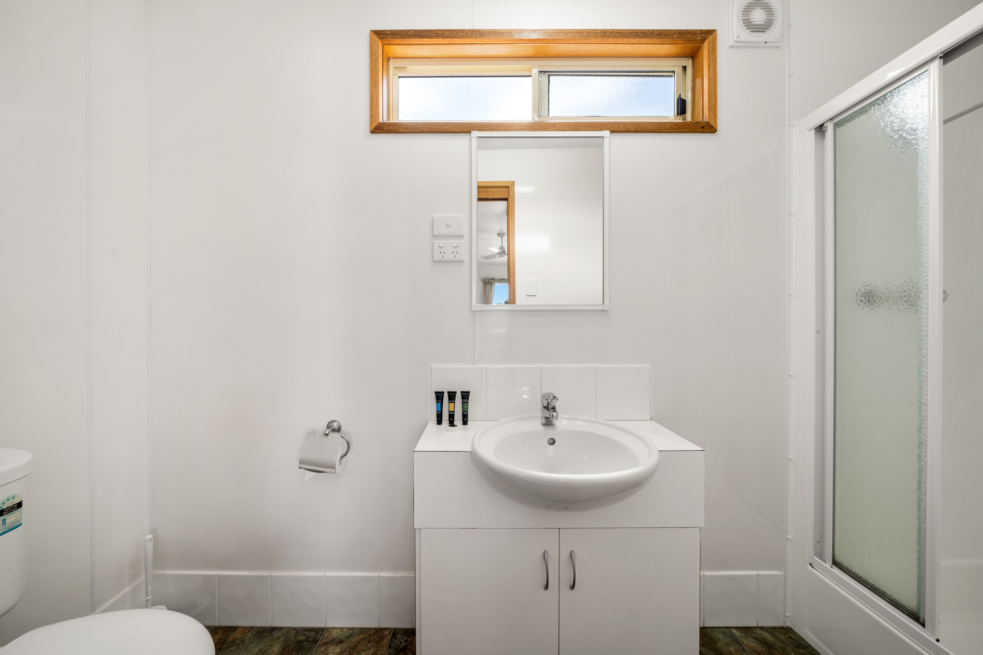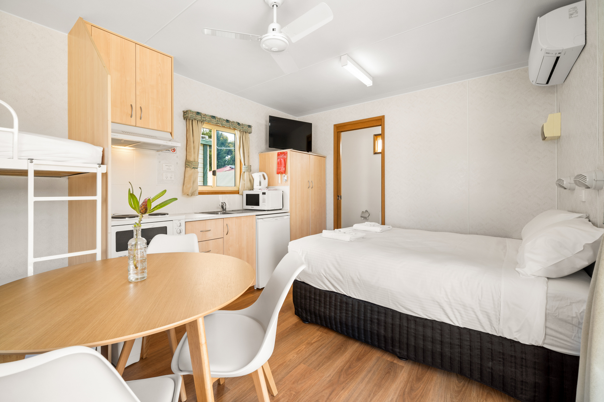 Studio style cabin with double bed, bunk bed, bathroom, kitchen & dining/lounge area. TV, air conditioning, tea & coffee, shampoo, conditioner & body wash also provided.