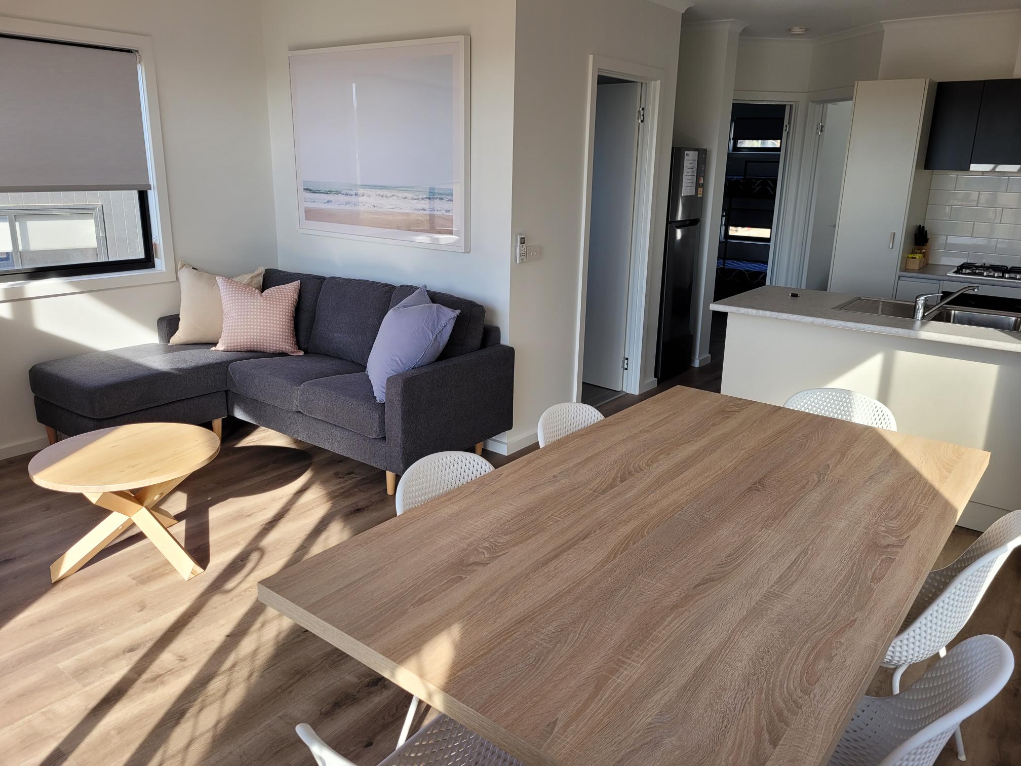 The Dune Cabin has views out to the Bungala River. The main bedroom contains 1 x queen bed, and the second bedroom has 1 x quad bunk bed. Bottom bunk can be hinged up to make room for a port-a-cot. Sleeps up to 6 people. Open plan kitchen, dining & lounge with television. Outdoor decking with seating area. Ensuite with shower. Kitchen includes dishwasher, gas stove top & microwave.