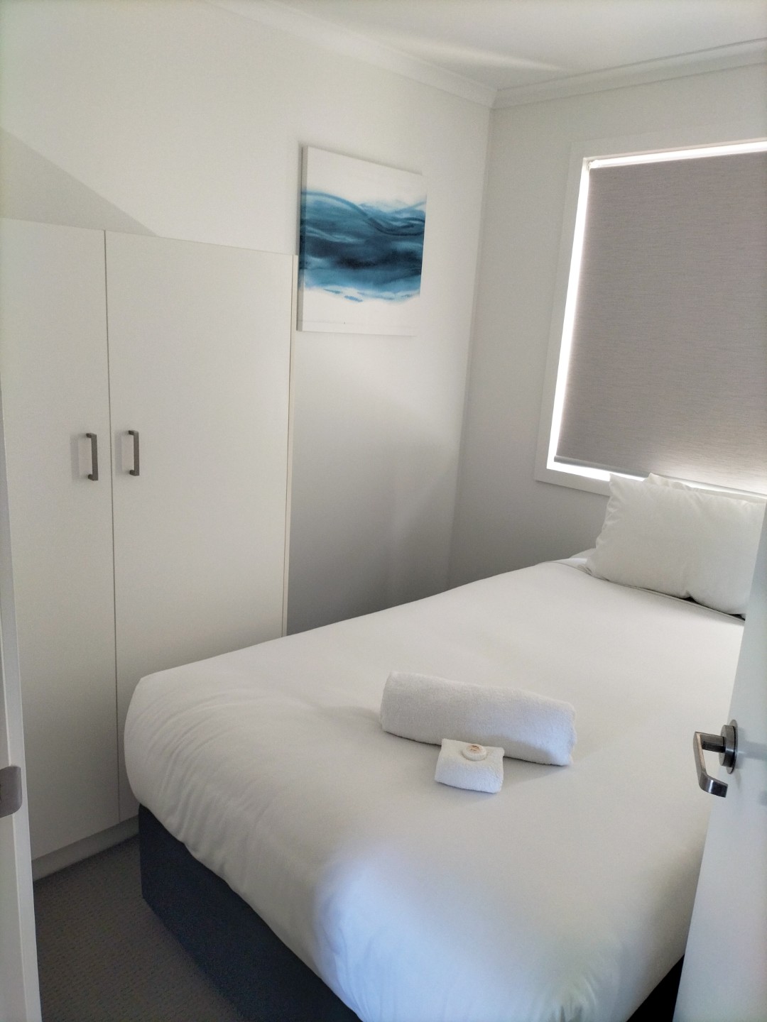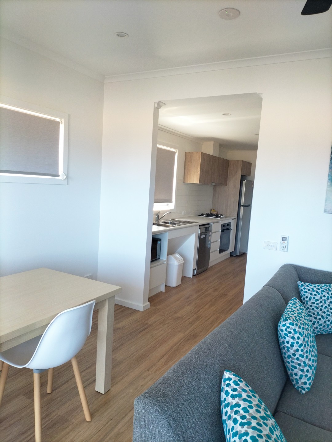 Our Tide 2 bedroom accessible cabins offer 1 x queen and 1 x single room. Large accessible bathroom with shower. Open plan kitchen, dining and lounge. Kitchen includes dishwasher, gas stove top and microwave. Outside decking and seating area, to ocean views, with accessible ramp. Sleeps up to 3 people.