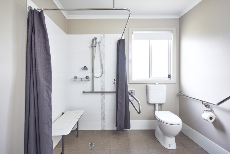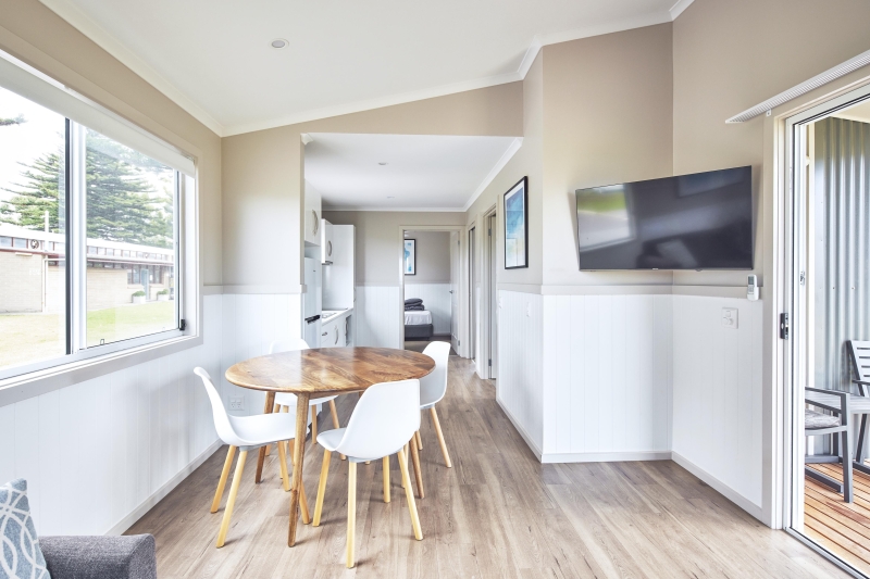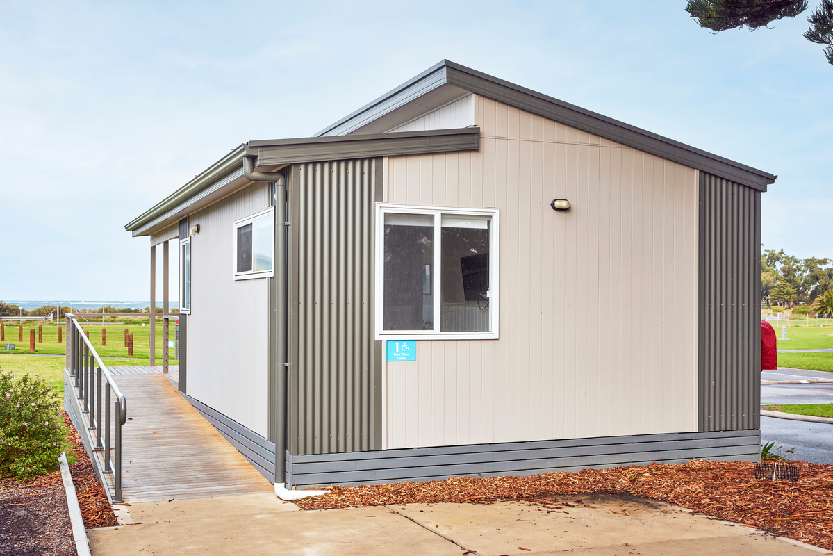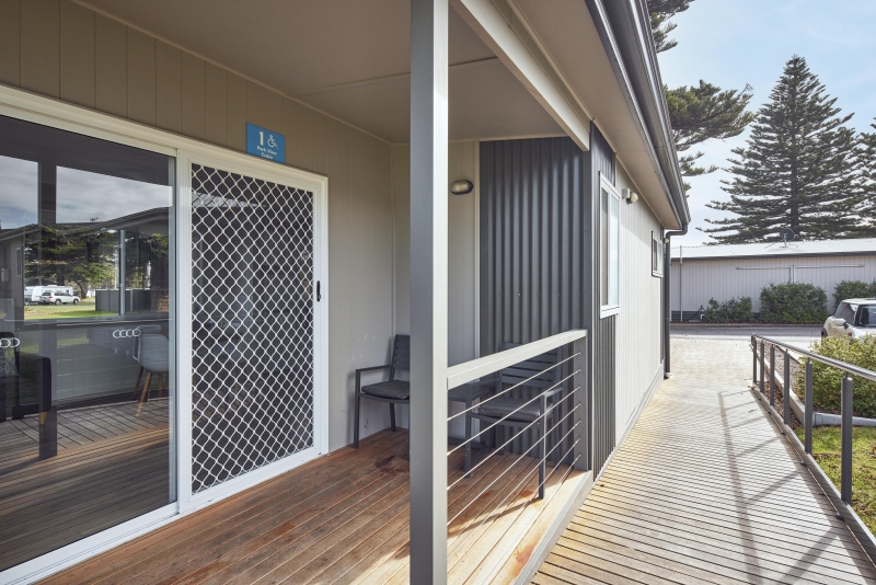 Access friendly cabin including ramps and accessible bathroom. Two bedrooms. One queen and one single bed. Features air-conditioning; kitchen including fringe and microwave; accessible bathroom; dining setting and lounge with TV and DVD.