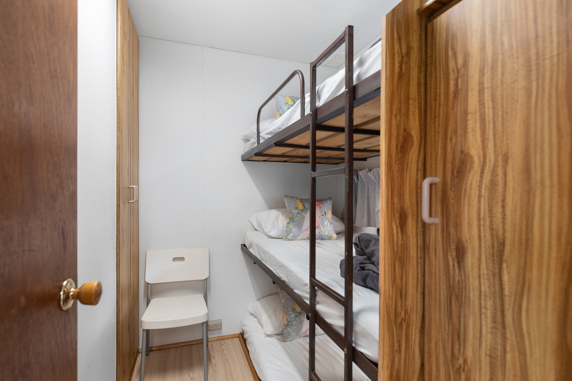 The double bed is in the kitchen area and there is a separate bedroom with a set of triple bunks plus a separate bathroom. All bedding is provided including towels.