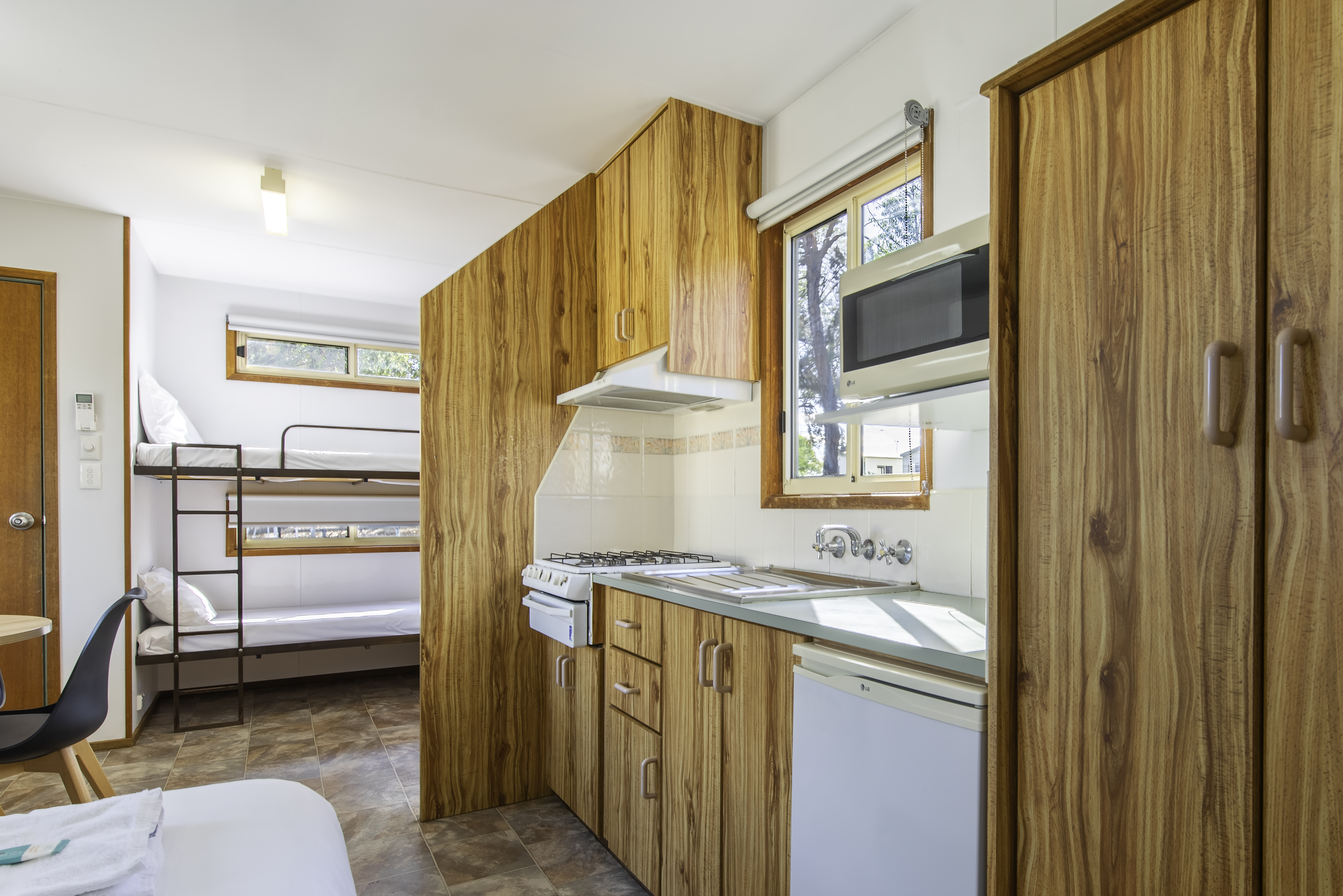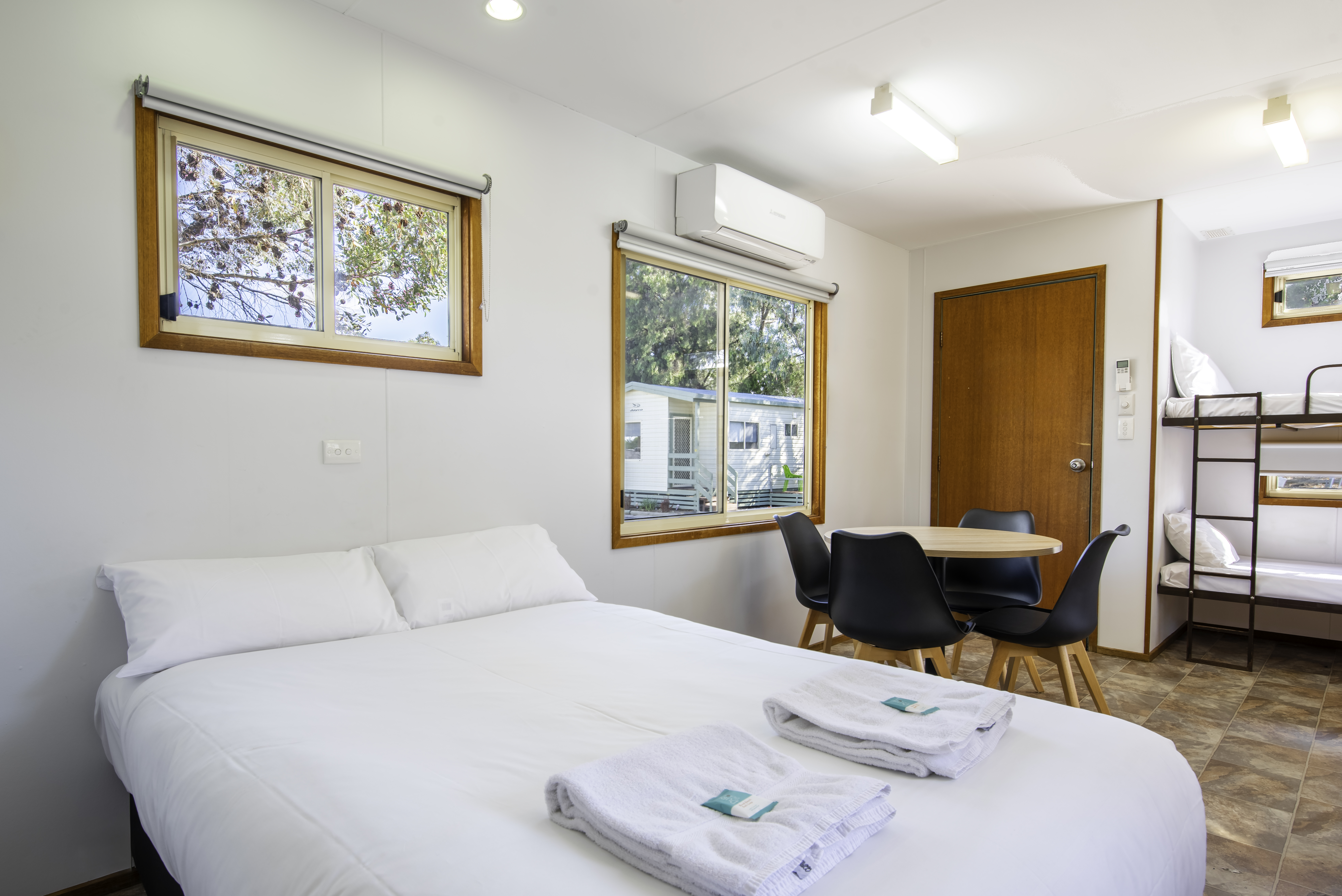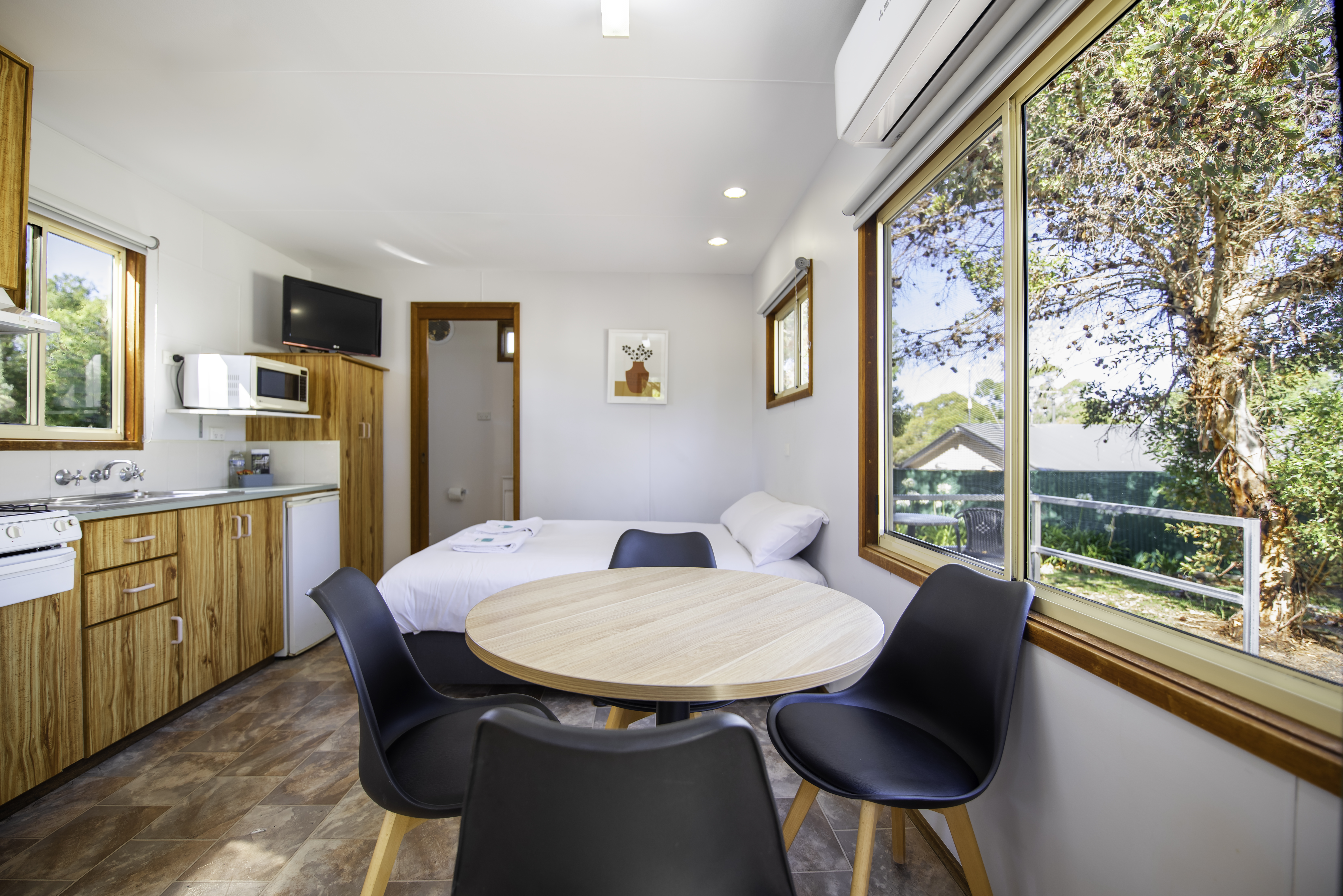 Centrally located within our Park these studio style cabins offer a peaceful spot for those seeking simplicity in their holiday. Each cabin features 1 double bed and 2 single beds in bunks, linen provided. The bathroom contains free toiletries, toilet, shower and towels. The living area contains a dining table, TV and reverse cycle A/C. The kitchenette contains a microwave, kitchenware, mini refrigerator, electric kettle, hotplate and toaster. Book now for a serene and simple retreat!