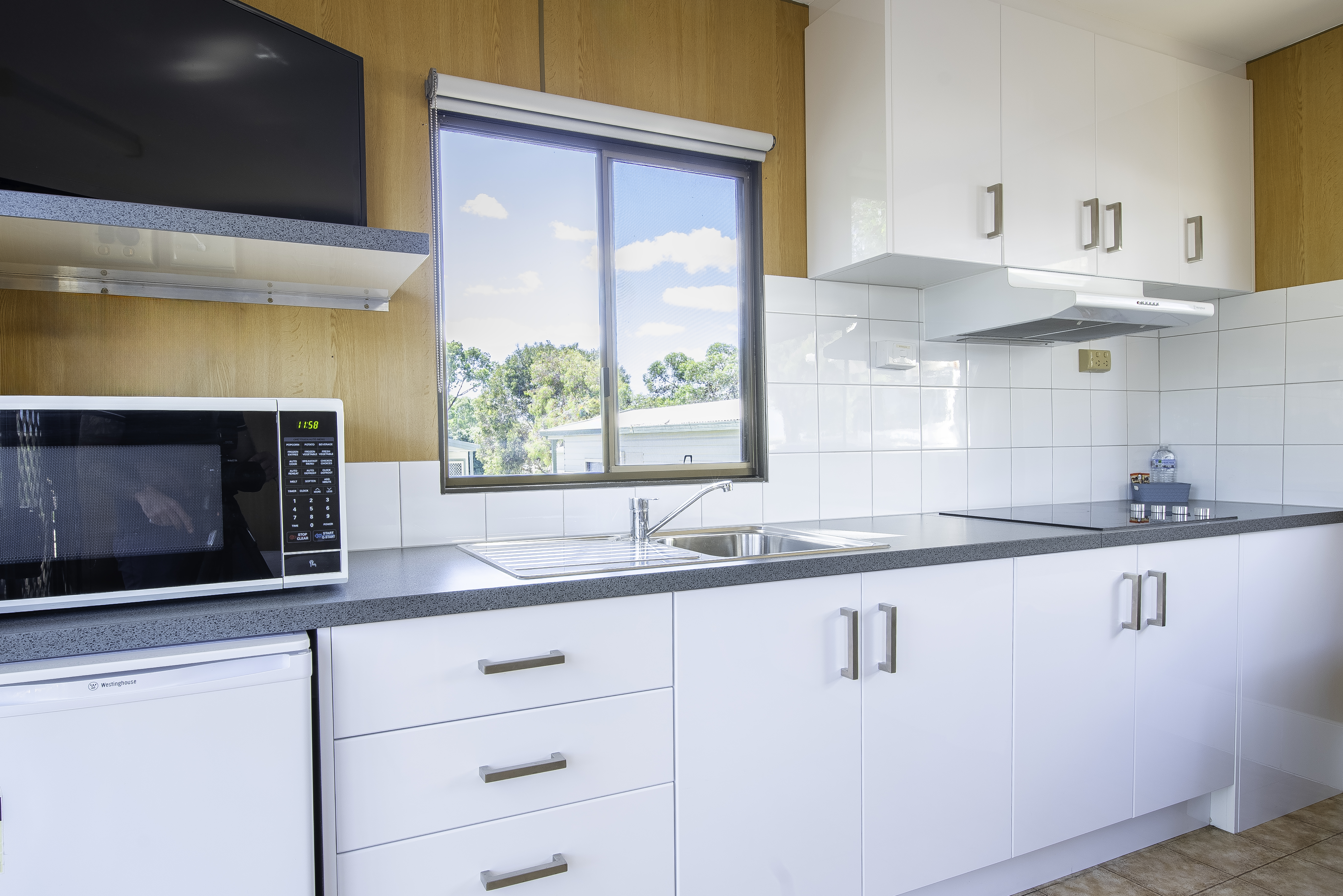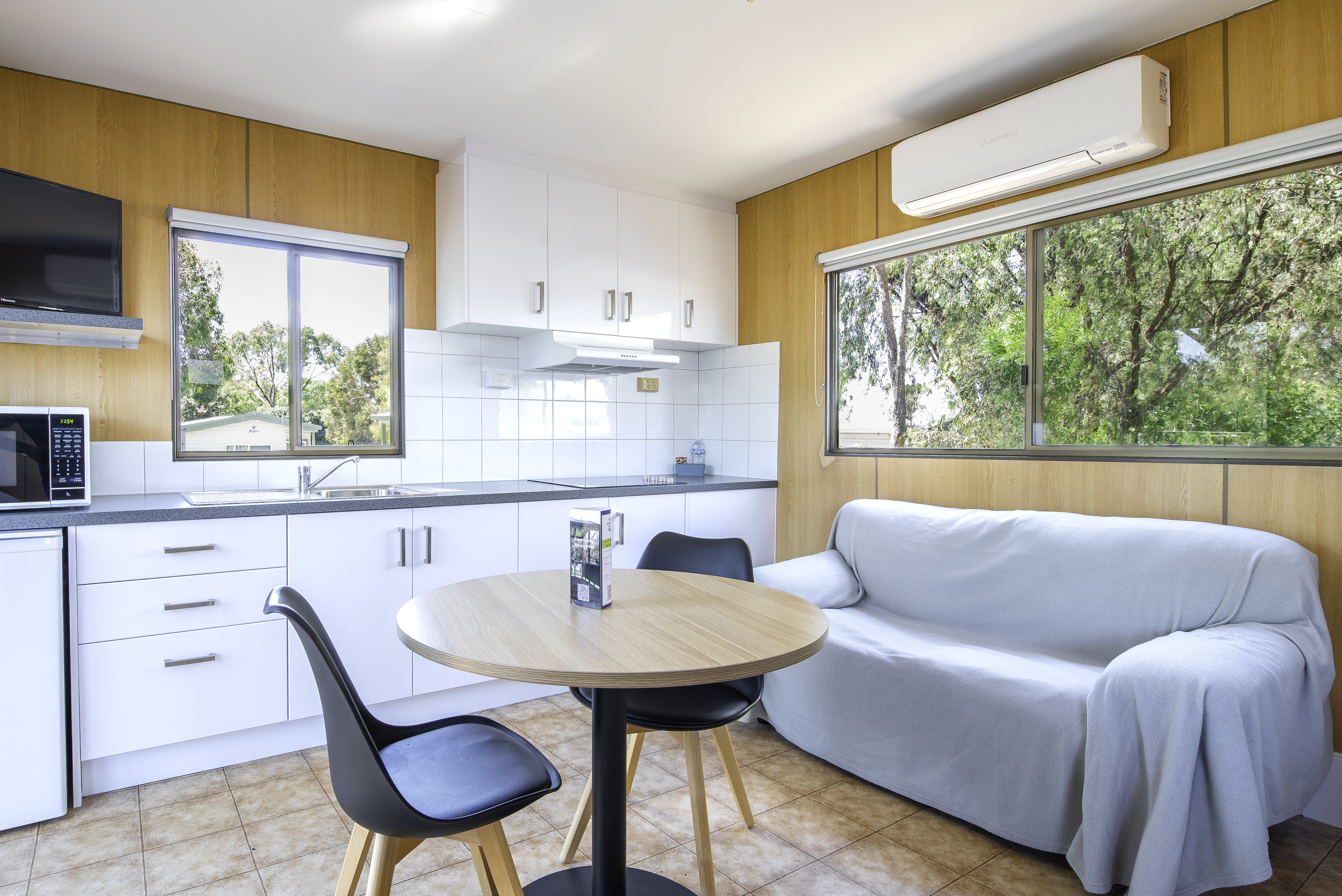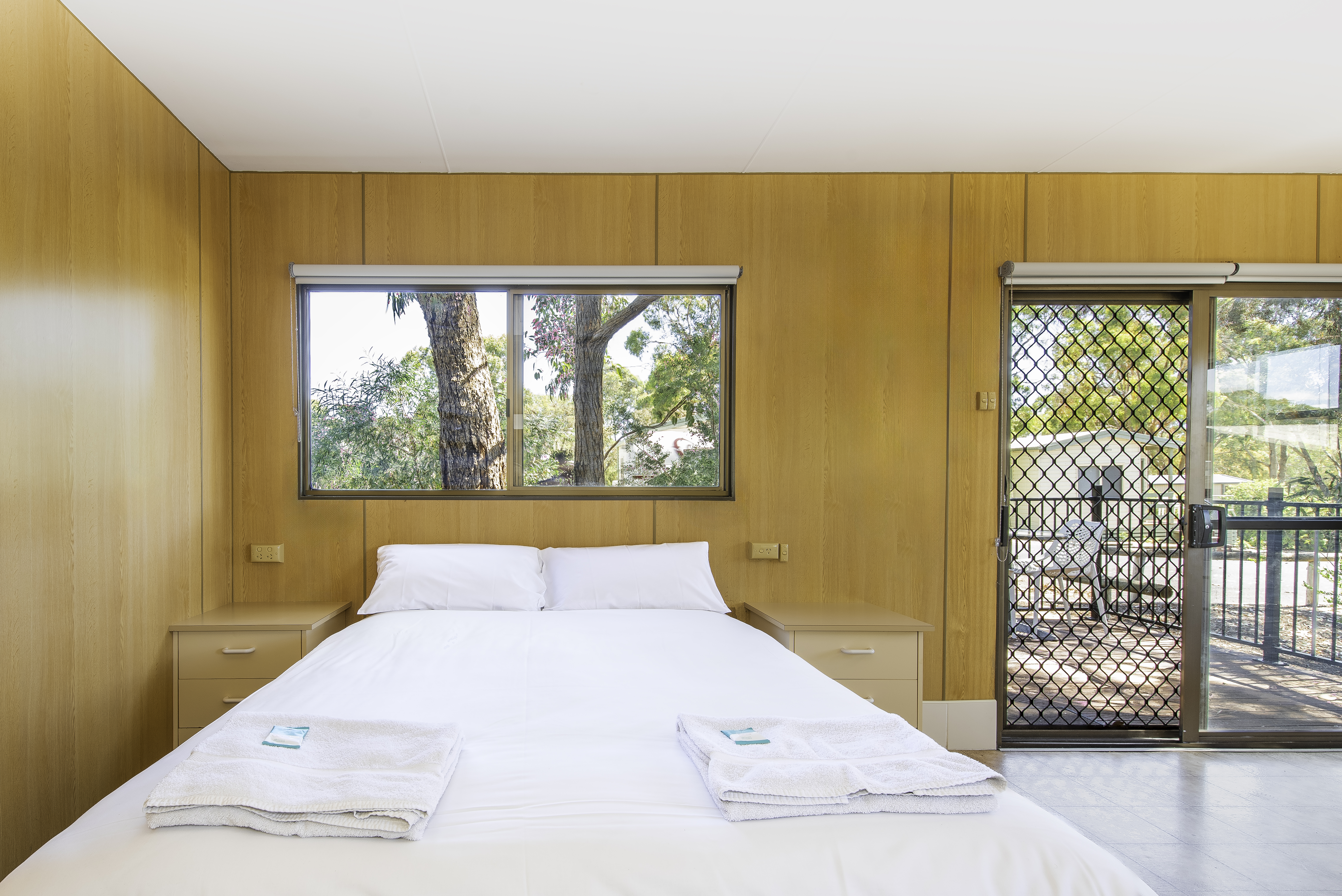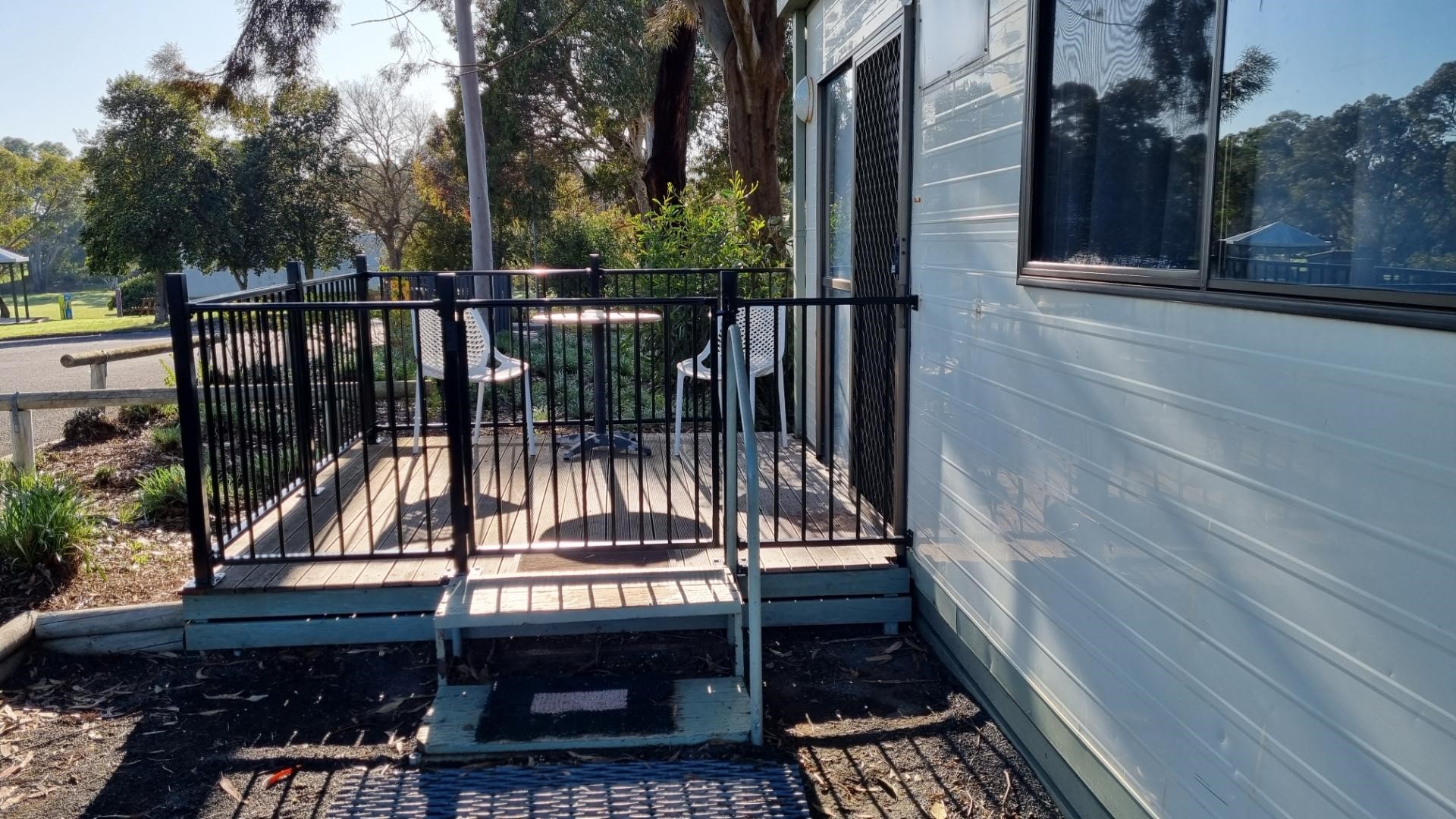 These cabins come with a fenced outdoor area for your pets protection and comfort, and are centrally located within our Park. Each cabin features 1 queen bed, linen provided. The bathroom contains free toiletries, toilet, shower and towels. The living area contains a dining table, TV, seating area and reverse cycle A/C. The kitchenette contains a microwave, kitchenware, full refrigerator, electric kettle, cooktop and toaster.