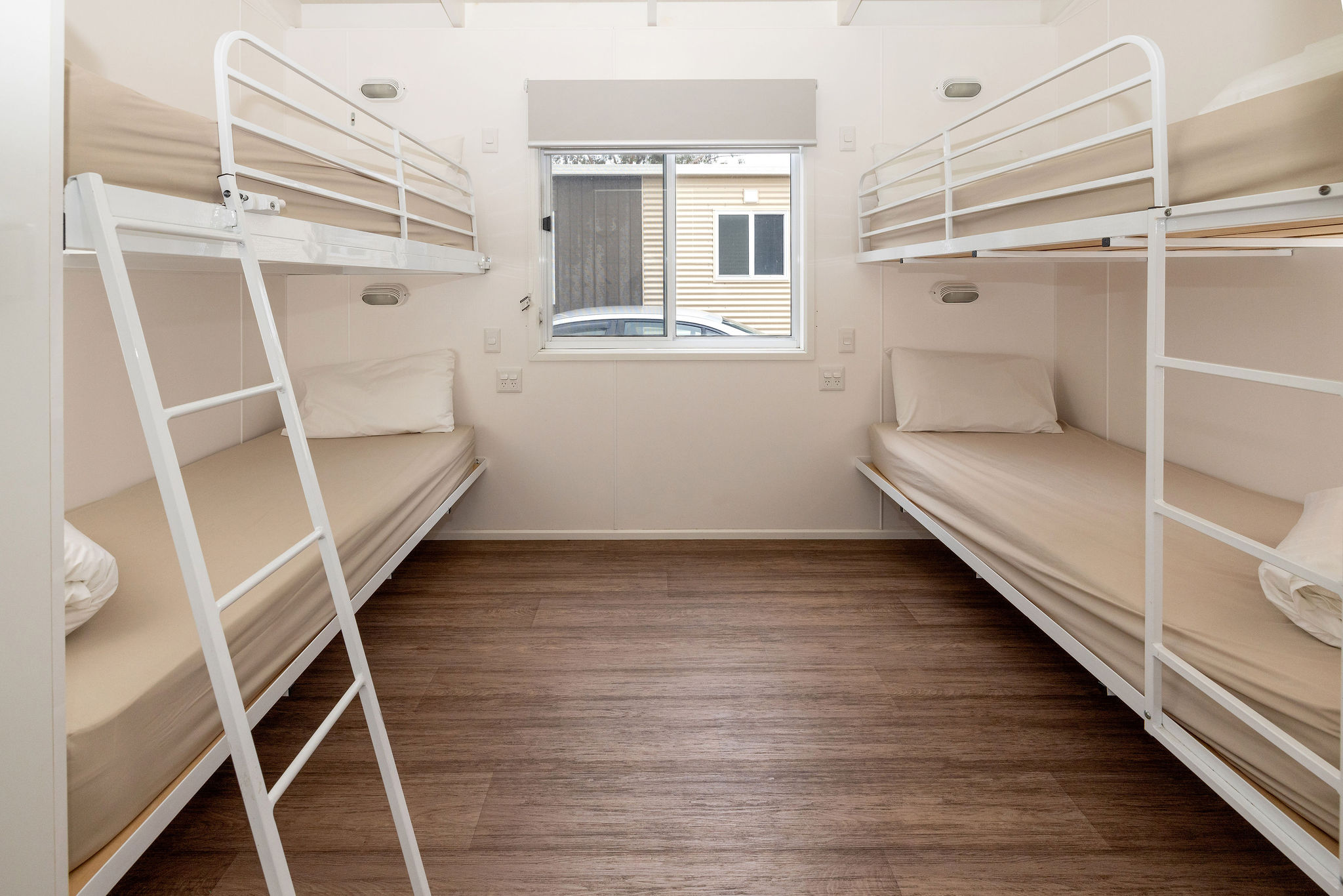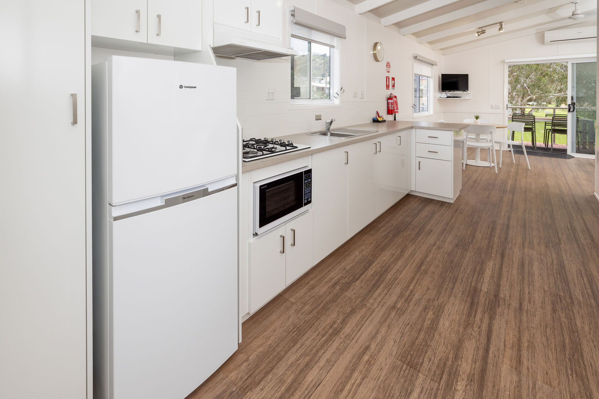 This open-plan villa features a queen bed in the main bedroom and two sets of bunk beds in the second bedroom. The villa is equipped with a self-contained kitchen, including a fridge, microwave, stovetop, and all the necessary crockery and cutlery. There’s also a separate dining area and a TV in the living space. The bathroom includes a shower, toilet, and vanity. The villa is also air conditioned to ensure a comfortable stay.