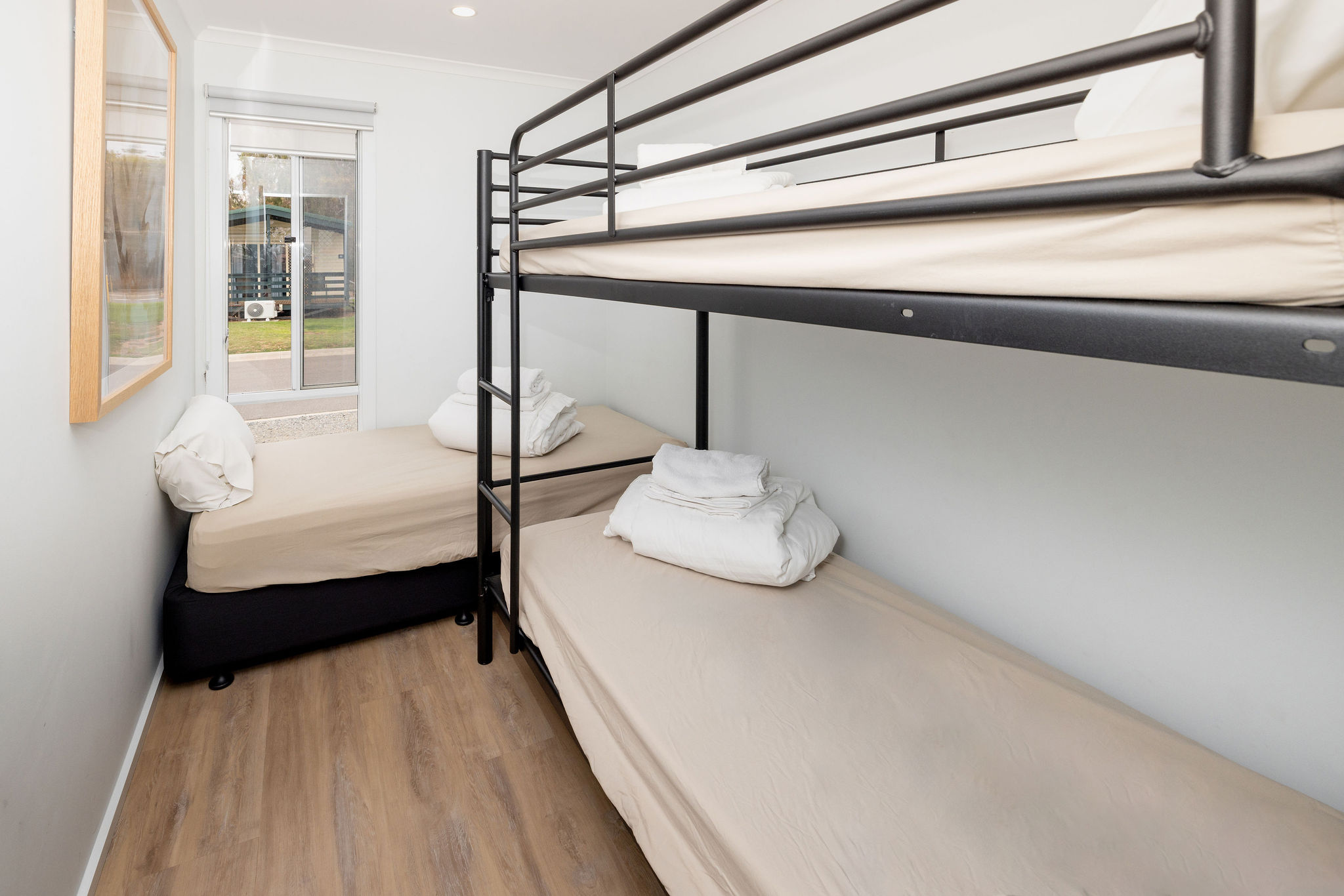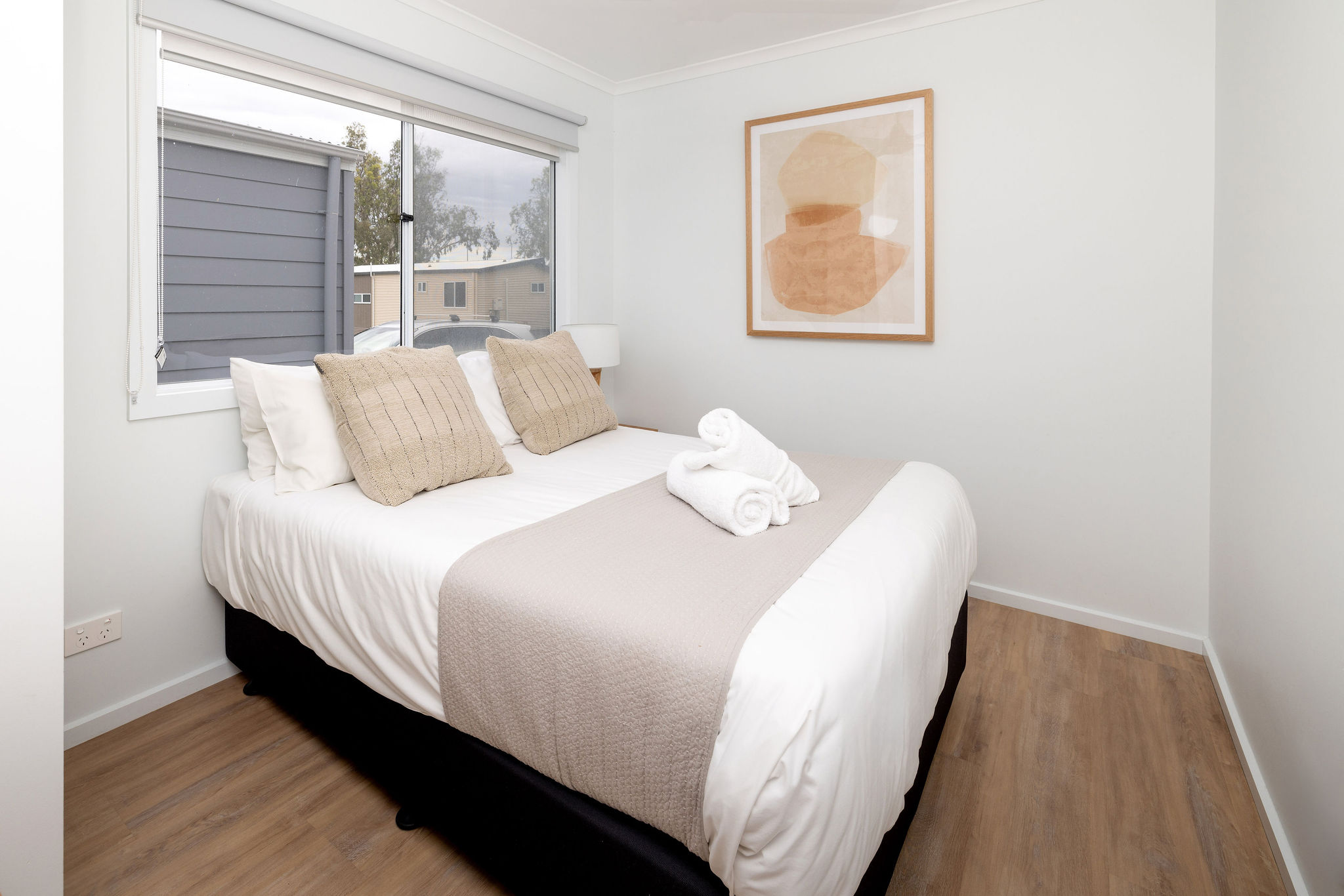 In this open-plan cabin, you’ll find a double bed in the main bedroom and a bunk bed and a single bed in the second bedroom. The self-contained kitchen comes fully equipped with a cooktop, microwave, full-sized fridge, and all the crockery, cutlery, and utensils you need. There’s also a small outdoor dining area and a Smart TV in the living area for you, where you can relax while streaming your favourite TV shows and enjoy high-speed internet. The bathroom features a shower, toilet, and vanity, and the cabin is air-conditioned for your comfort.