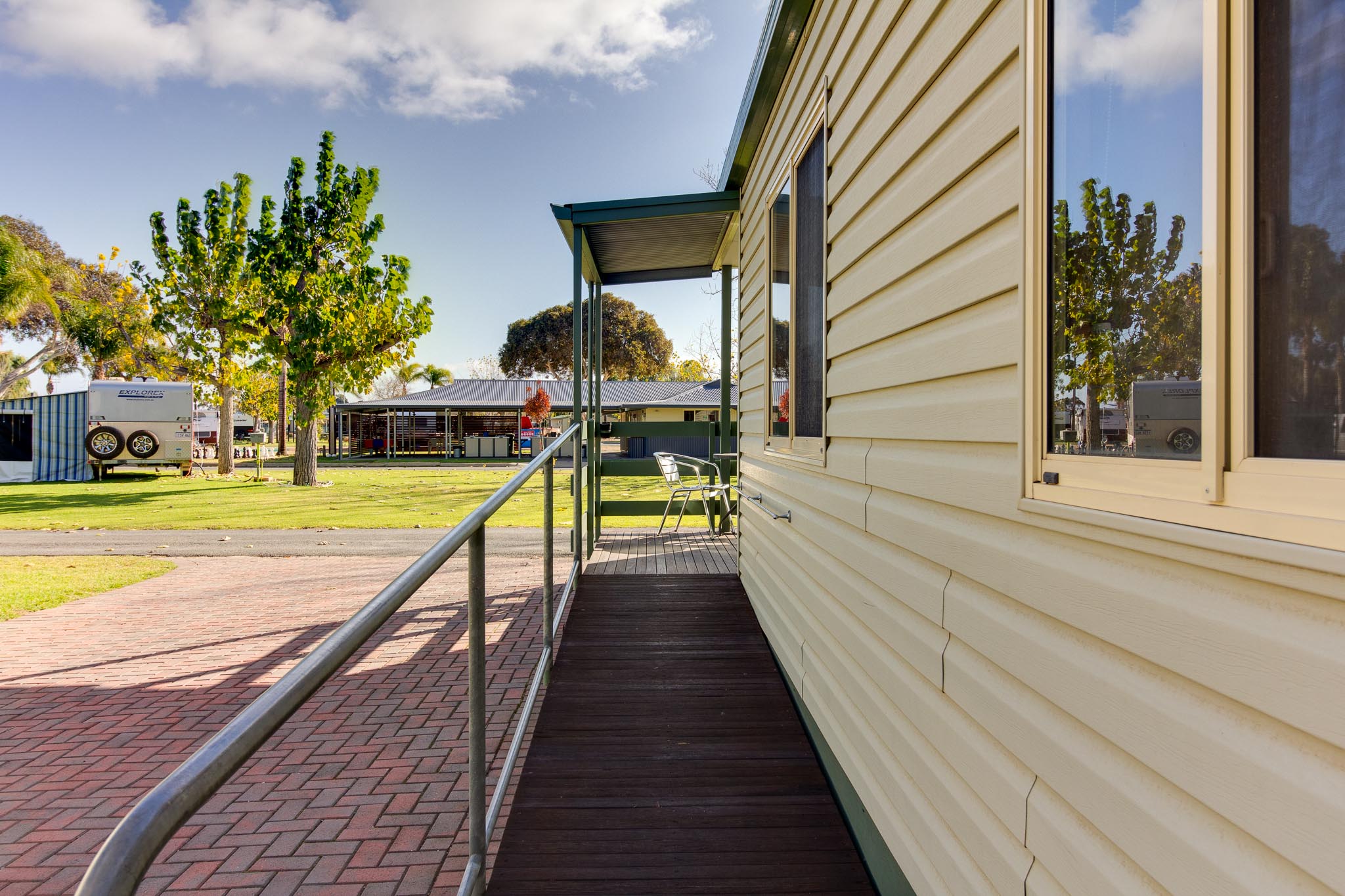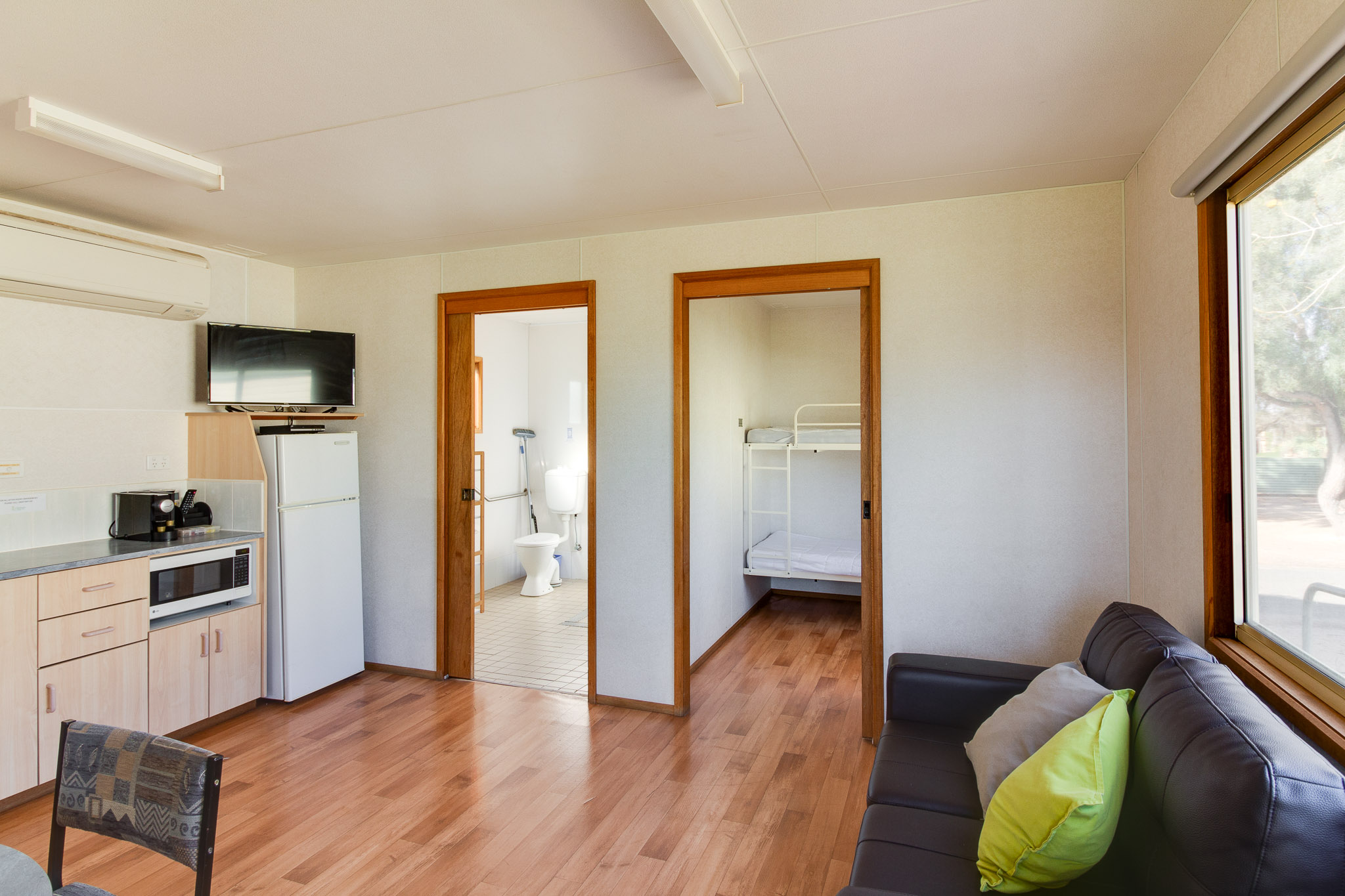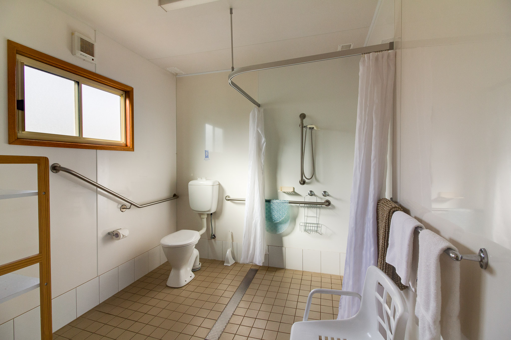 Ideally located in the park adjacent to BBQs, playgrounds and park entry/exit, these cabins are comfortable and spacious with quality fittings. Designed to cater for wheelchair use, the spacious bathroom has a shower chair and hand railing in the shower and by the toilet for extra safety. Mobility aids and other disability equipment is available for hire from local company HomeCare. Ideally suited to families featuring air conditioning, fully equipped kitchen, modern wheelchair access bathroom facilities and TV/DVD.