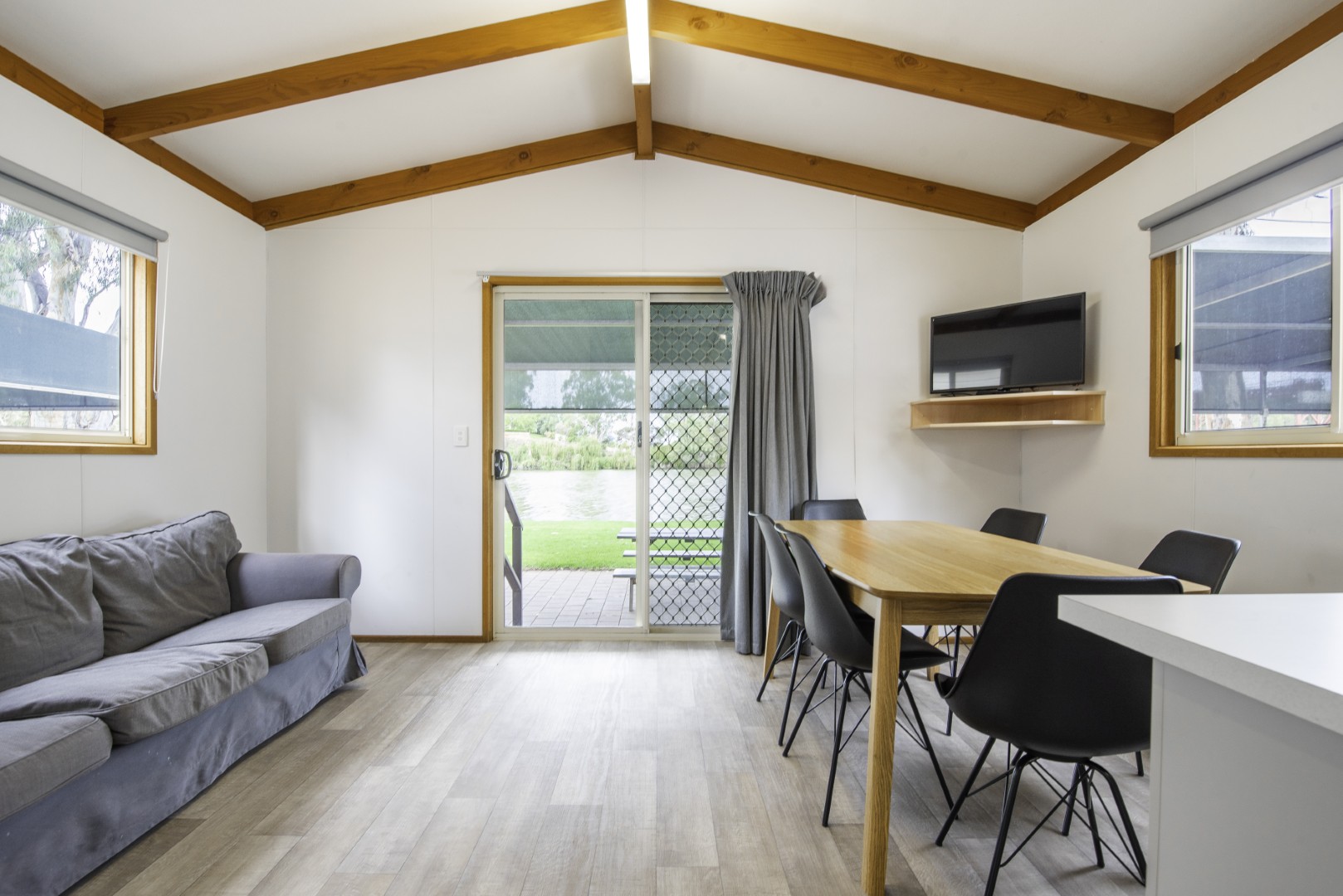 Our cosy Classic Riverfront Cabin offers two bedrooms—one with a queen bed and the other with two bunk beds—making it a great choice for families. Linen and towels are provided, and the space includes a comfortable three-seater lounge, a dining table, and a TV for relaxing indoors. The kitchenette is equipped with a full-size refrigerator, microwave, electric kettle, toaster, cooktop (no oven), and all necessary utensils for preparing simple meals. The bathroom features a shower, toilet, and hair dryer.