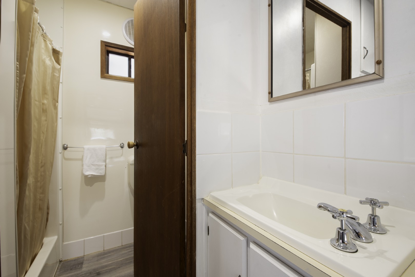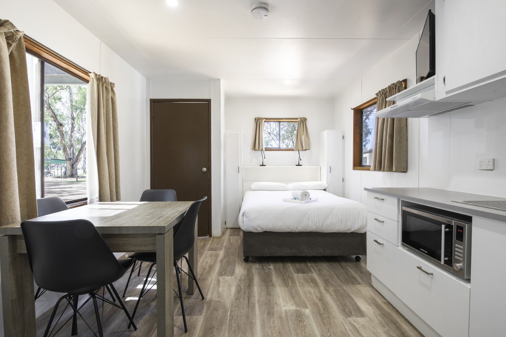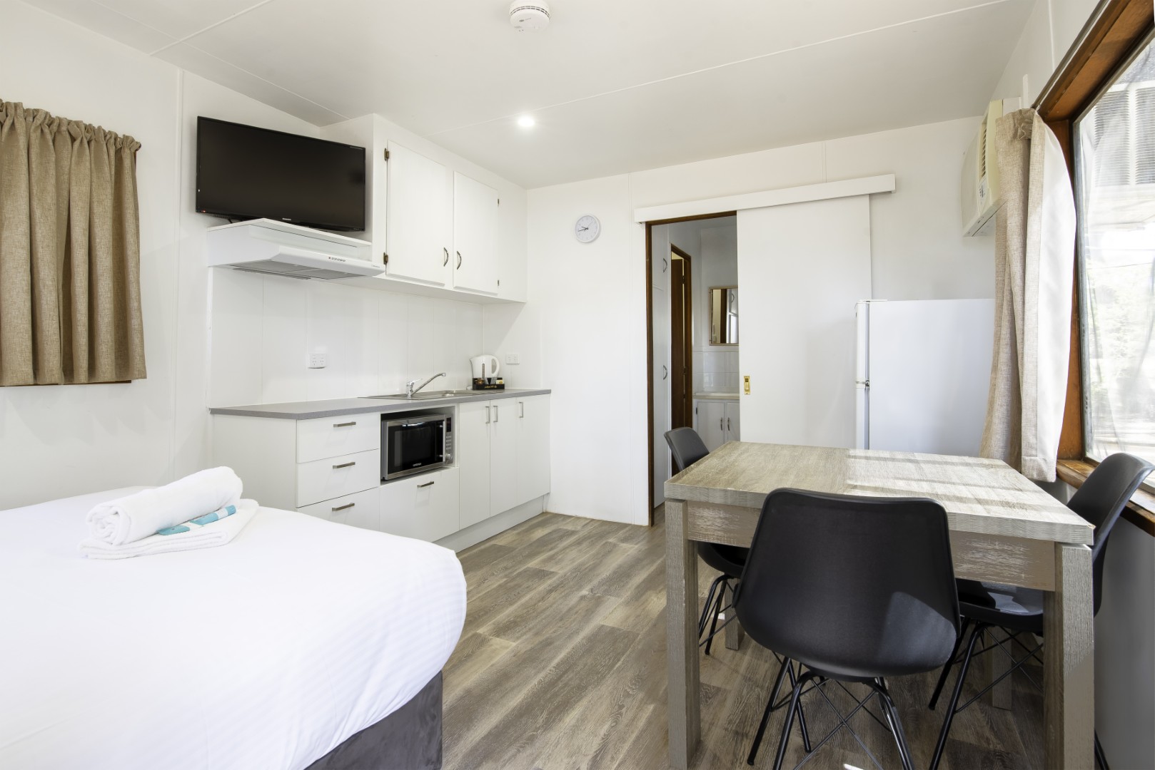 This Ensuite Cabin offers a cosy and functional space with one double bed and one bunk bed, making it ideal for couples or small families. Linen and towels are provided. The studio features a private entrance via steps and includes an outdoor dining area for enjoying meals in the fresh air. Inside, you'll find reverse cycle air conditioning, a dining table, and a TV for entertainment.