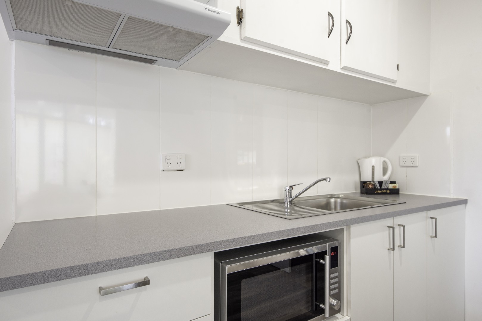 The kitchenette is equipped with a full-size refrigerator, electric kettle, cooktop (no oven), microwave, toaster, and all necessary utensils for preparing light meals. The bathroom includes a toilet, shower, and hair dryer.