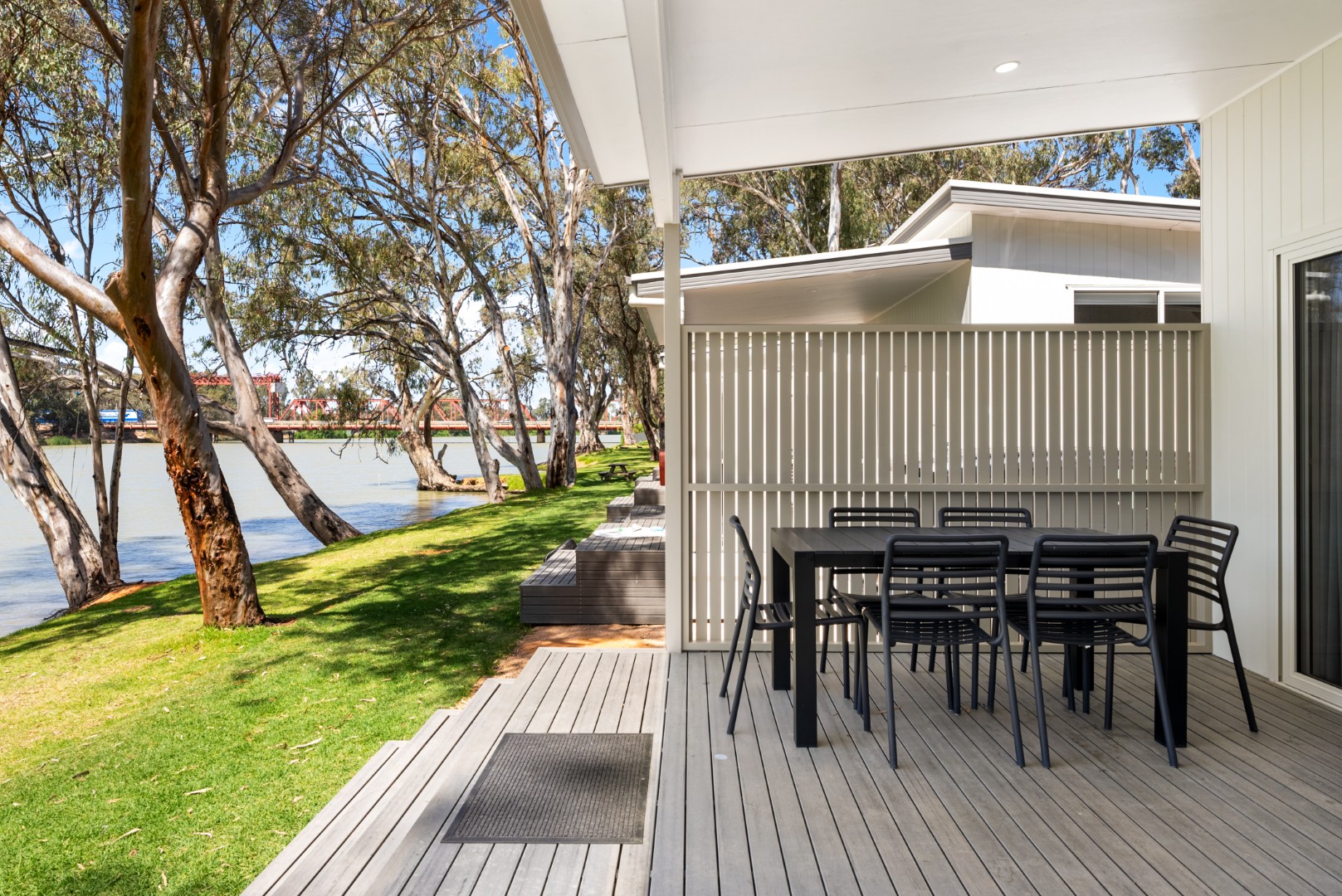 Our well-appointed Standard Riverfront Cabin features two bedrooms—one with a queen bed and another with two bunk beds—making it ideal for families or small groups. Linen and towels are provided for your convenience. The living area includes a spacious L-shaped lounge, a dining table, and a TV, all kept comfortable with reverse cycle air conditioning.