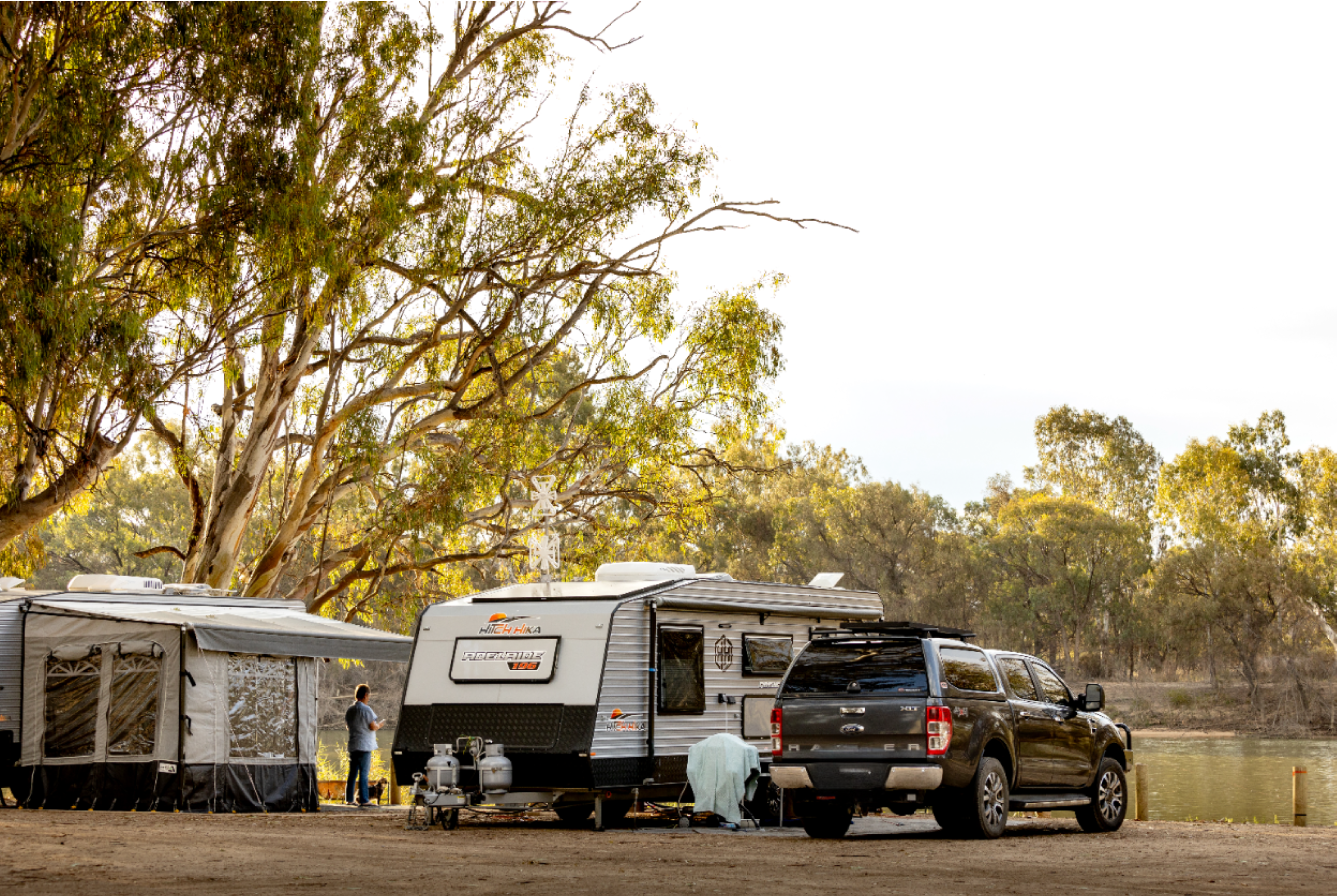 The Riverfront Powered Sites are suitable for caravans of all sizes, tents and campers. These sites boast beautiful views surrounded by lawned parklands. The sites themselves are gravel with 10m of lawn between the sites and water's edge.