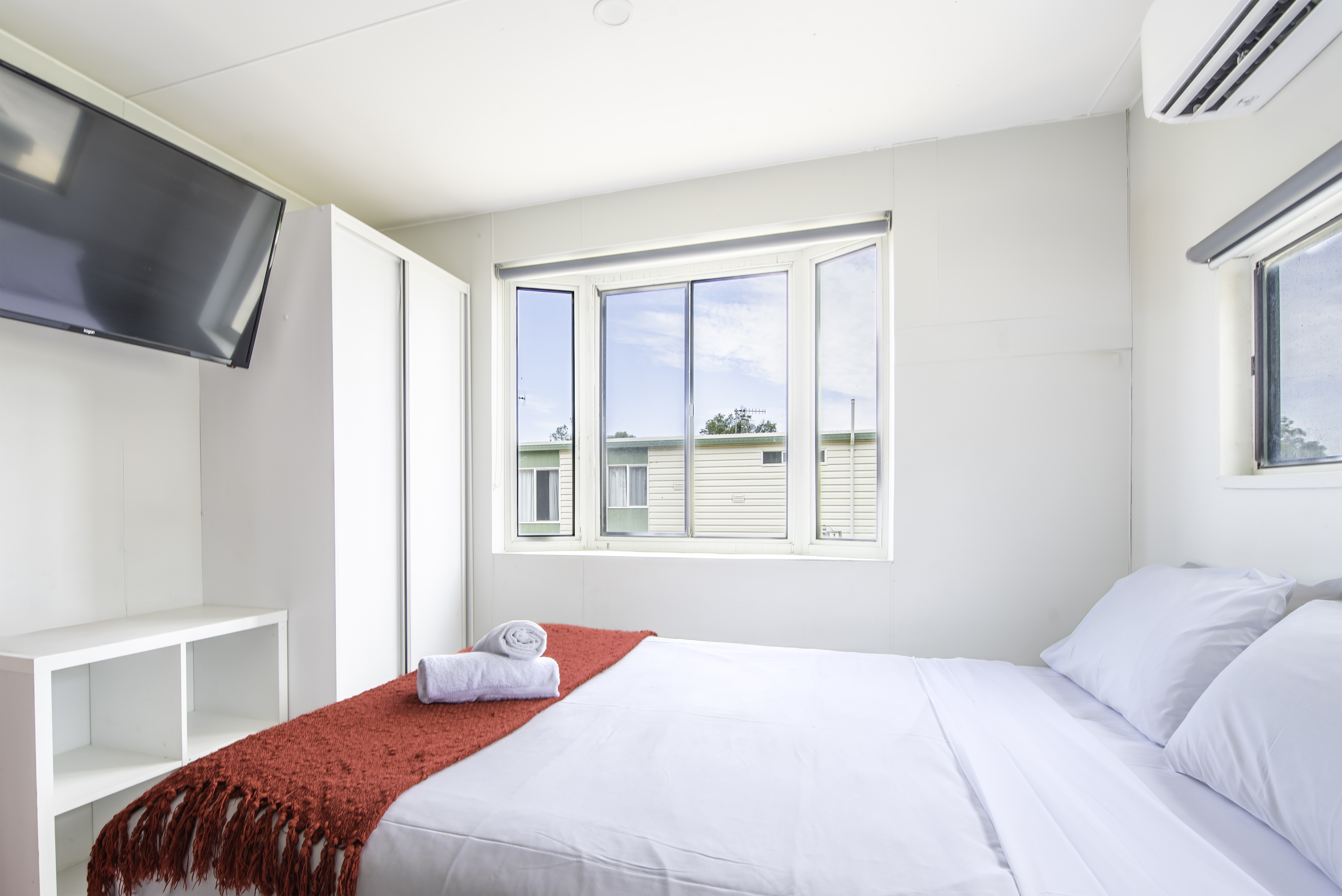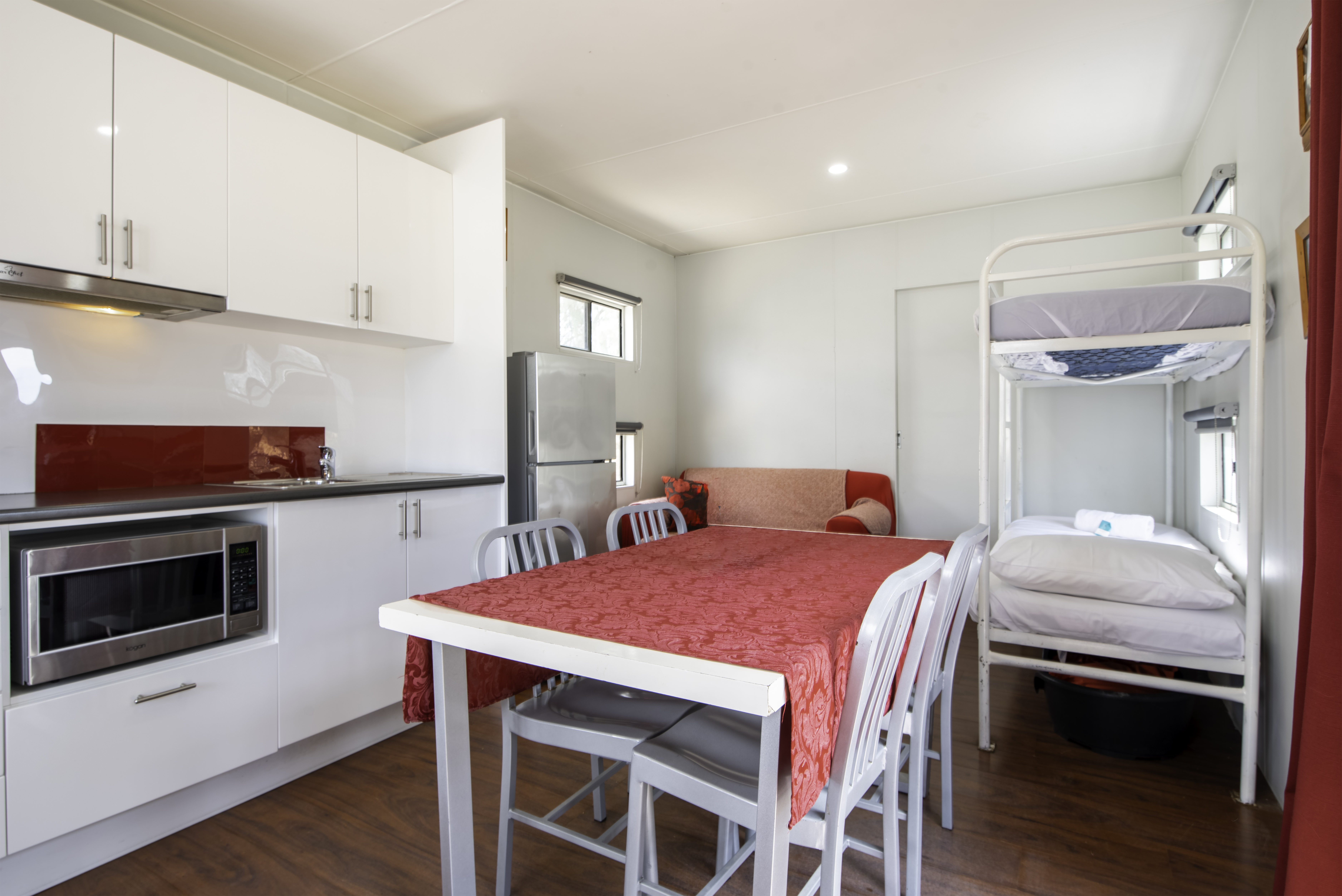 Enjoy relaxing walks through the township or by the river with your furry friend. Centrally located within our Park, each cabin features 1 queen bed and 1 bunk bed, linen provided. The bathroom contains free toiletries, toilet, shower and towels. The living area contains a dining table, TV and reverse cycle A/C. The kitchenette contains a microwave, kitchenware, full refrigerator, electric kettle, cooktop and toaster. Free Wi-Fi is available to guests throughout the Park.