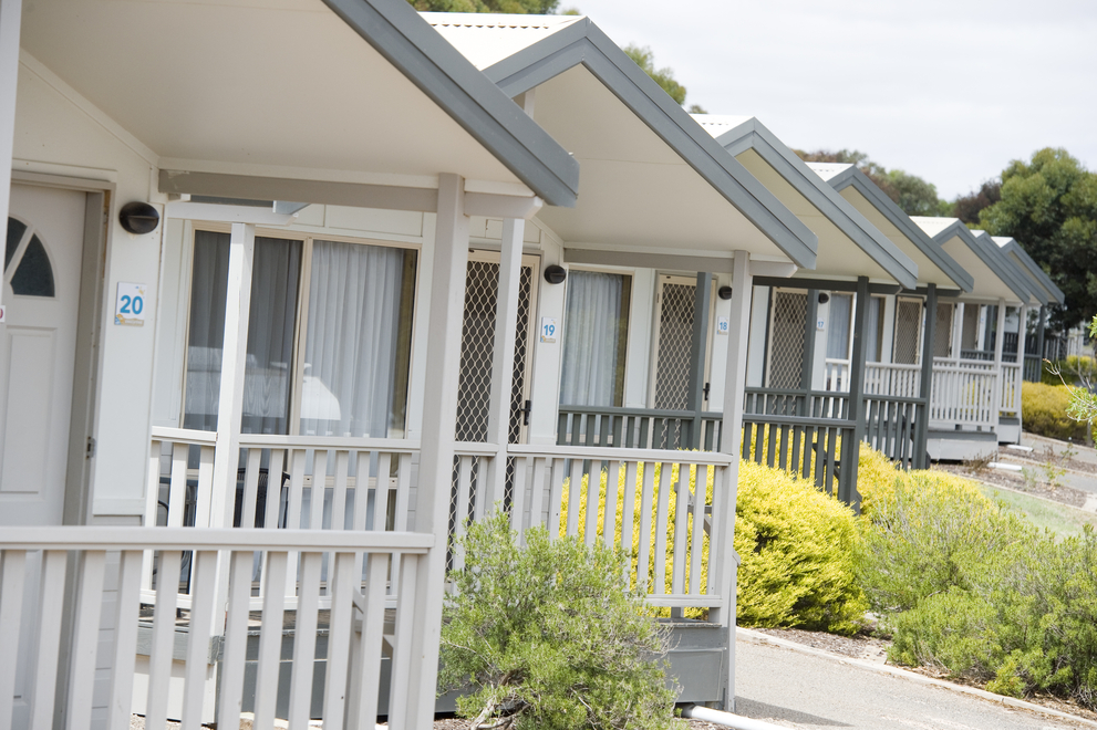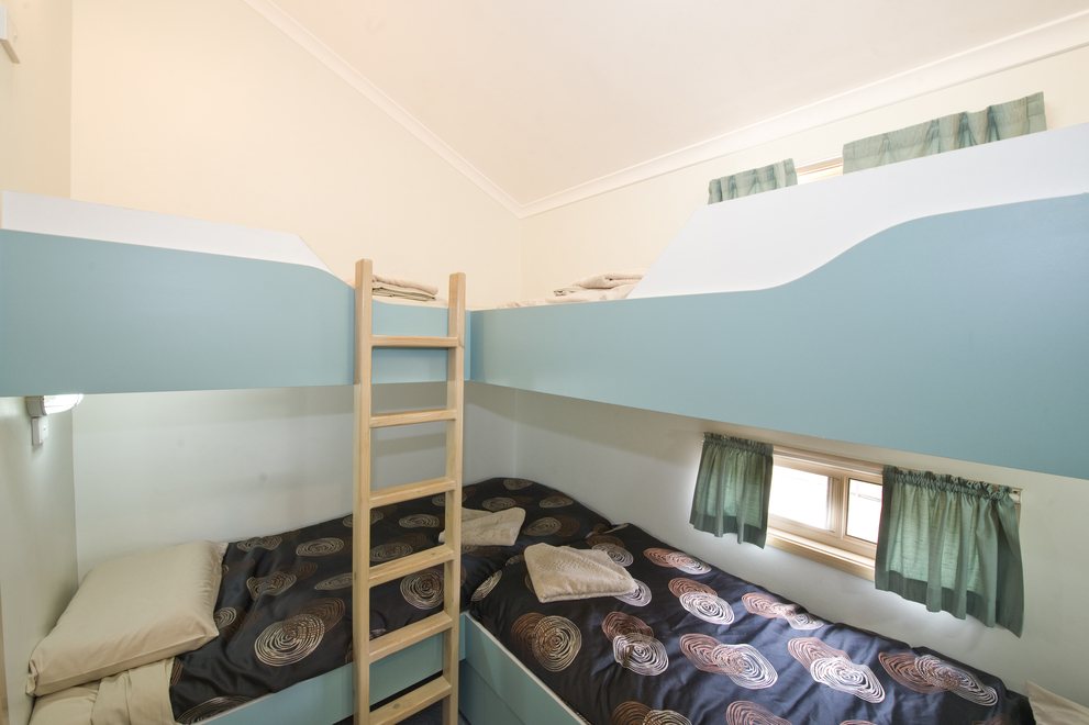 Well-suited to a family with small children, these cabins sleep up to 6 people and include a queen bed in the main bedroom and two sets of single bunks in the second bedroom. Offering a spacious lounge and dining area, there’s plenty of room for everyone to relax around the TV after a big day by the beach.