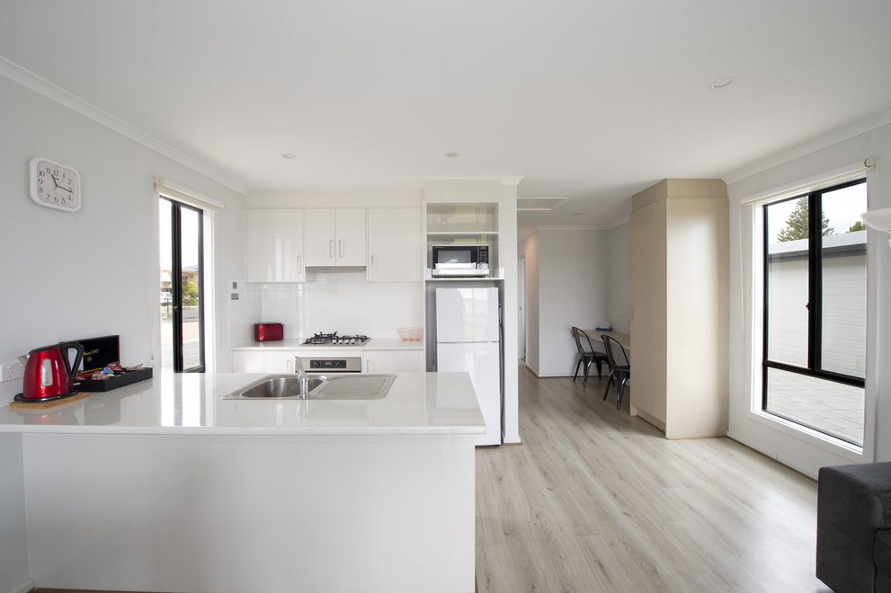 Overlooking the coastline of Moonta Bay, these spacious self-contained villas are the perfect place to set up for a beach-view holiday. Our two-bedroom Beach View Villas sleep up to six people and are equipped with a queen bed in the main bedroom and two sets of bunk beds in the second bedroom. Enjoy the comfort of your villa and come together in the open-plan living area to watch a movie. The villa is equipped with HD TV, High-Speed Internet, and streaming services, ensuring entertainment and connectivity during your stay. When you get hungry, make the most of the fully equipped kitchen for delicious family meals, or head outside to cook on the Weber BBQ while soaking up the coastal views. If you’re looking for a bit of quiet time to dive into a book, sneak off to the study area so you can read in peace. The Beach View Villas also have large bathrooms and separate toilets, so there won’t be any fighting about who’s going first. Please notify us if you are bringing a dog, as additional charges apply.