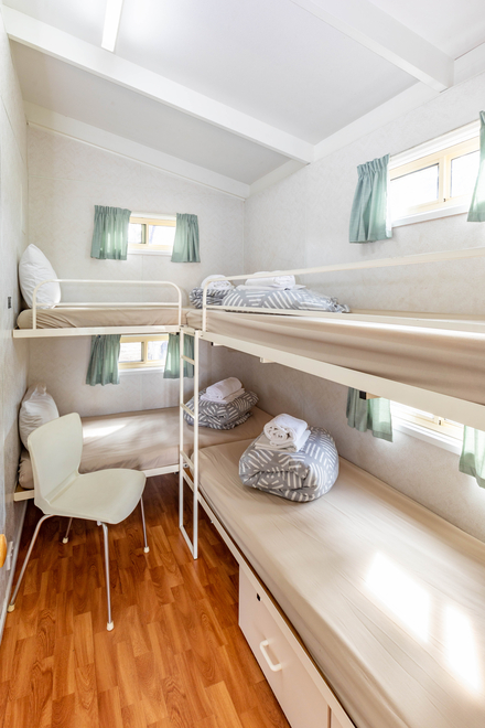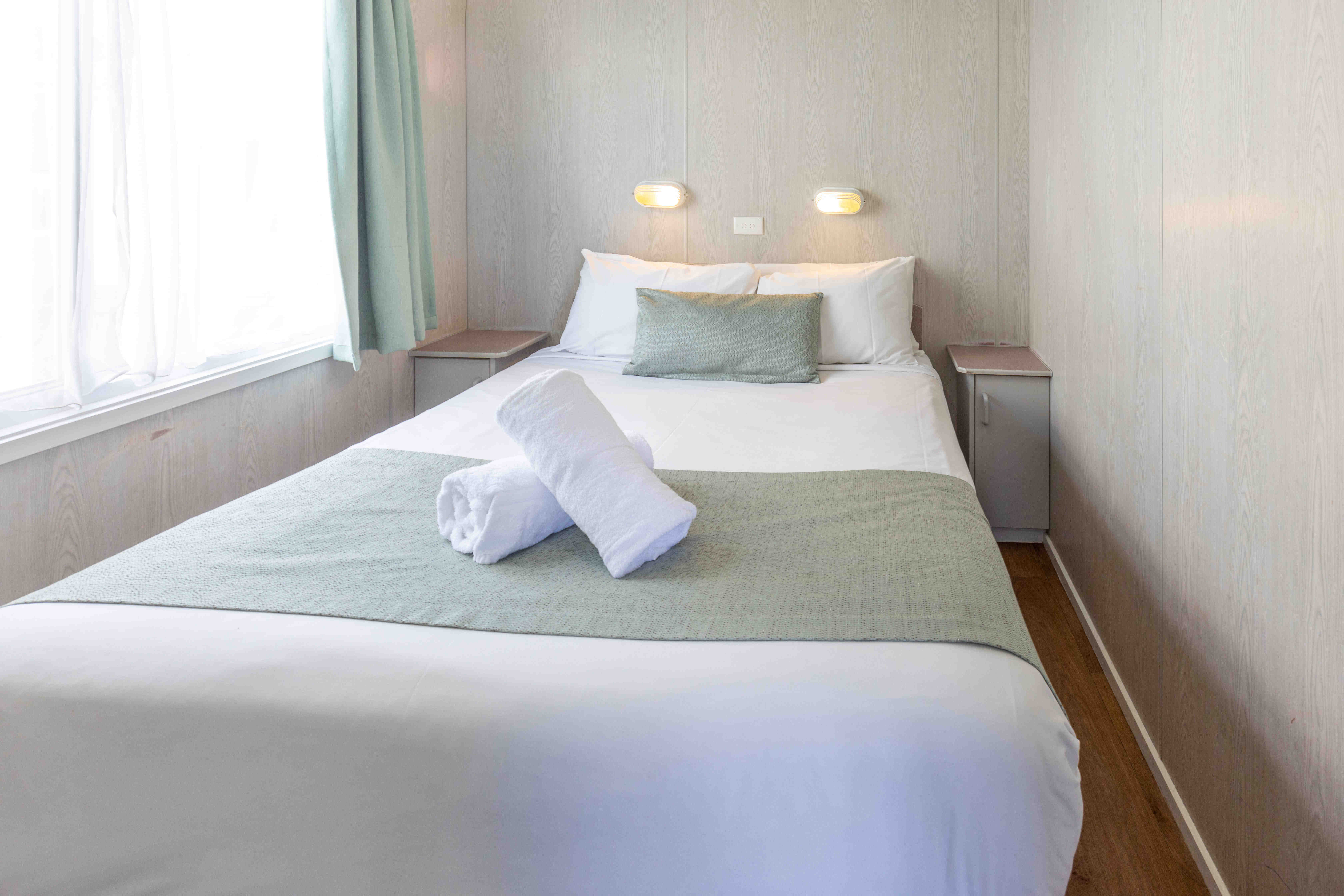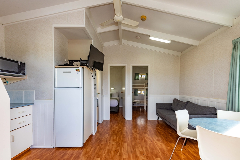 This two-bedroom cabin sleeps up to six people with a queen bed in the main bedroom and two sets of bunk beds in second room (L-Shape). Linen is supplied for all beds.