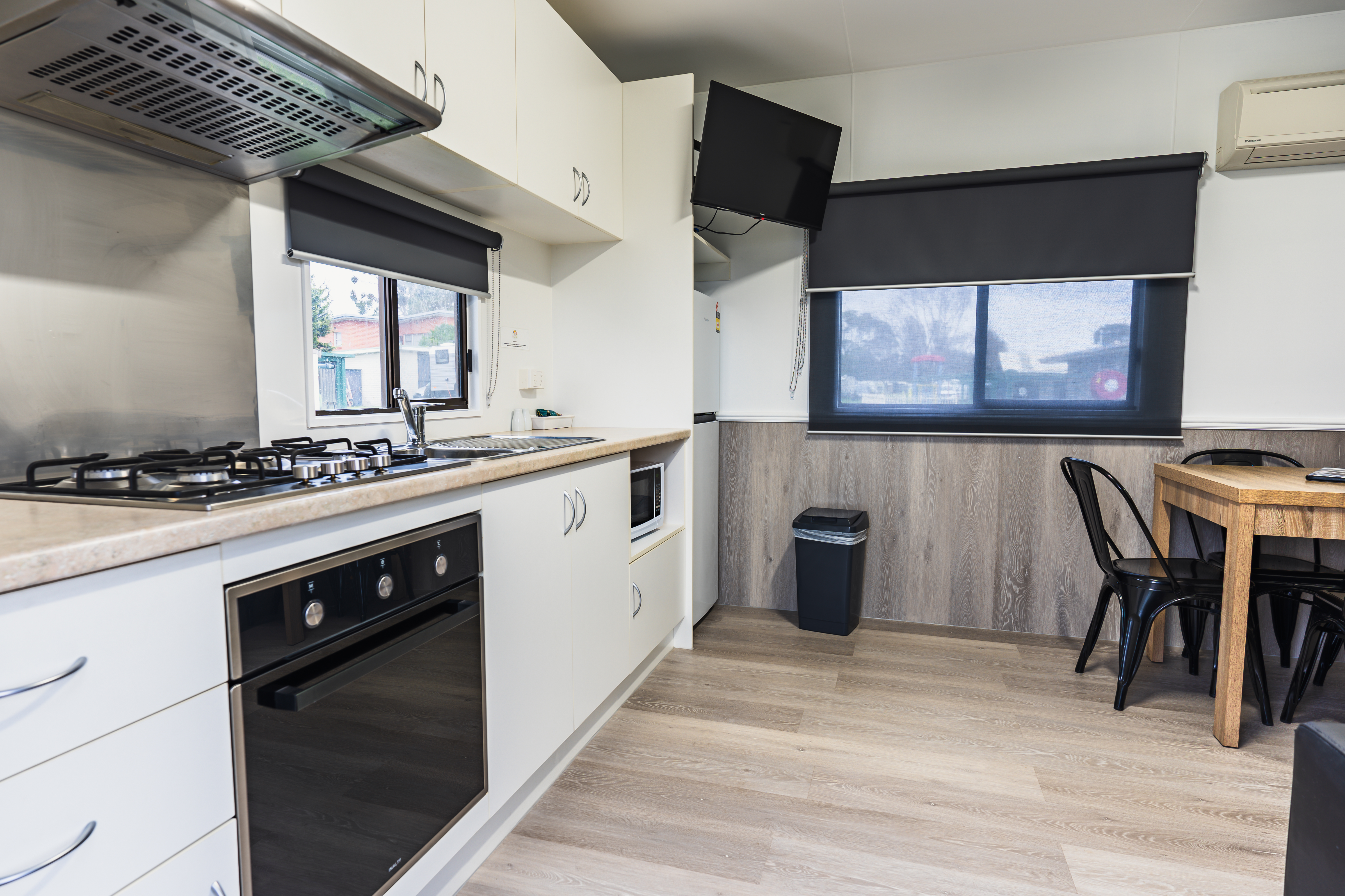 These family open plan cabins may be just what you are looking when you're travelling on a budget. Providing comfortable accommodation with a double bed in the main bedroom and bunks in a walk-through area. You will find everything you need in the kitchen including a microwave, stove top and fridge. In the lounge and dining area you will find a dining table, couch, TV, reverse cycle air-con/heat-pump plus an ensuite style bathroom in the cabin. Parking is right beside your cabin.