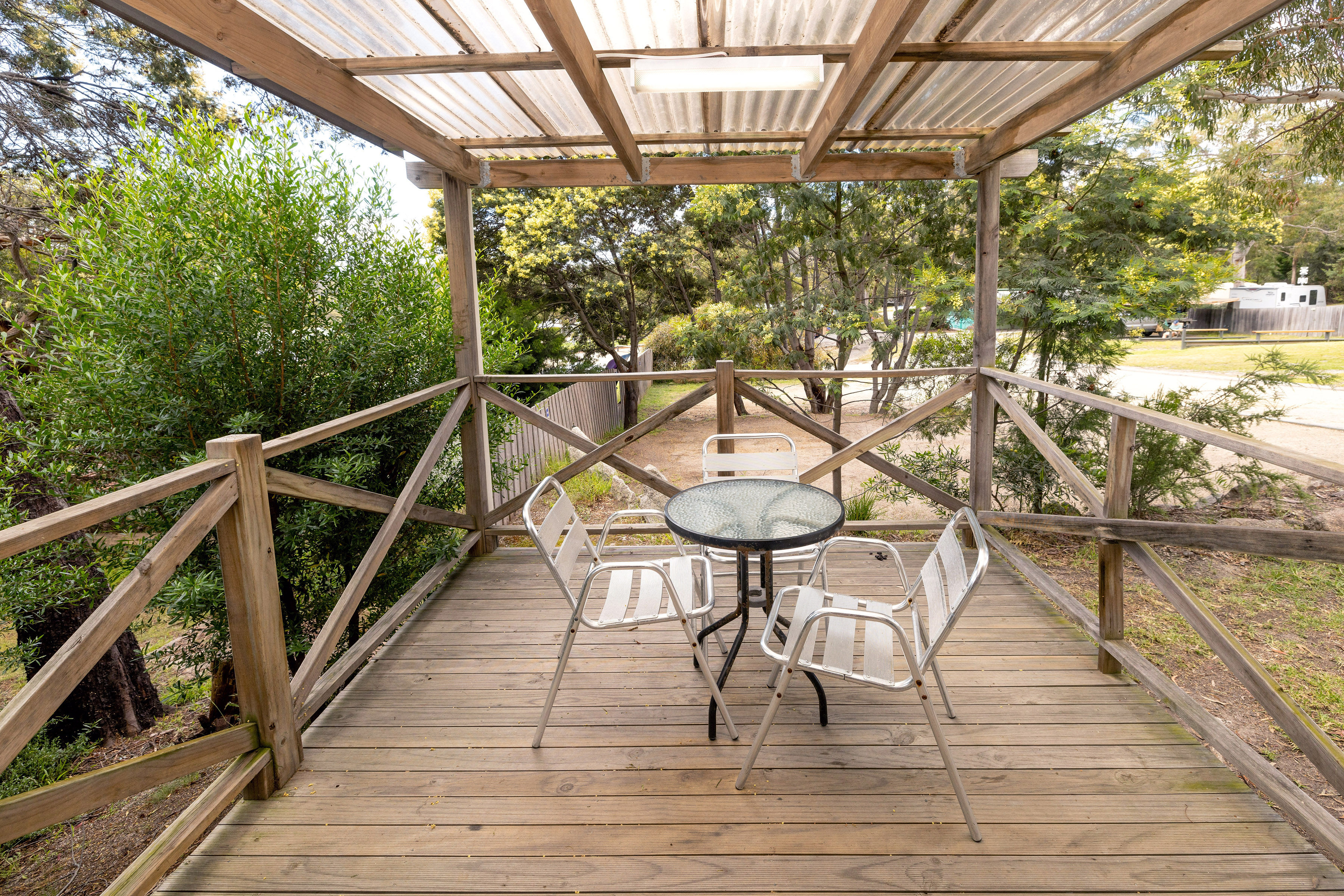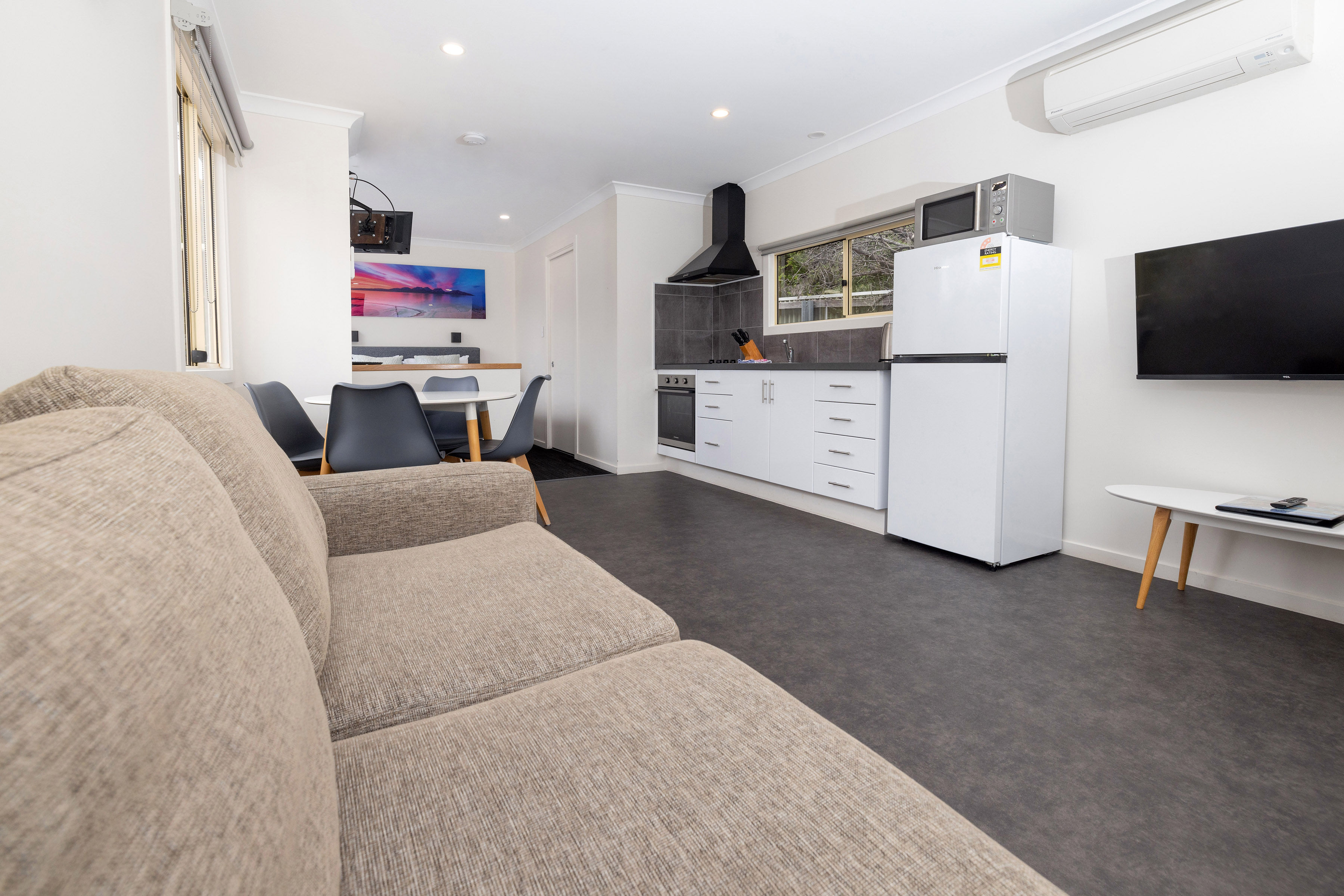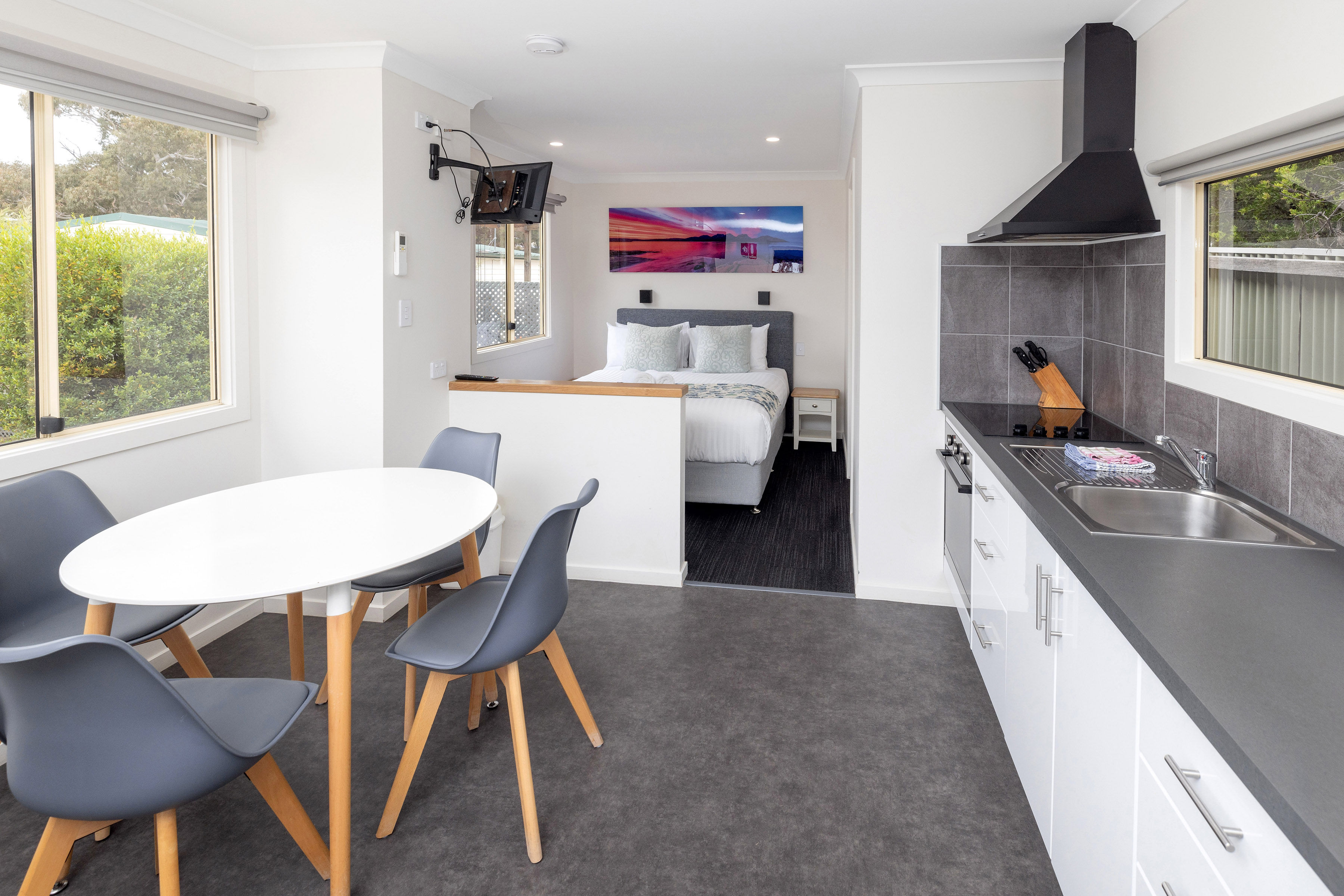 Open plan. One queen bed. Sleeps up to 2 people. Self-contained kitchen with full sized fridge, oven and microwave. Dining/Lounge area with smart TV x 2. Private bathroom. Features air-conditioning & outdoor seating.