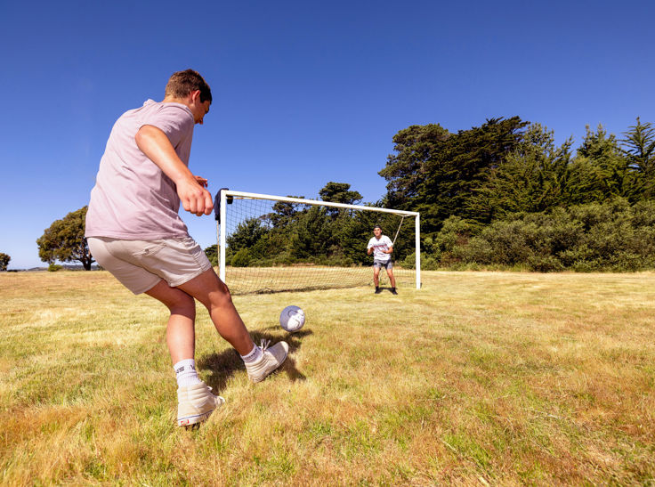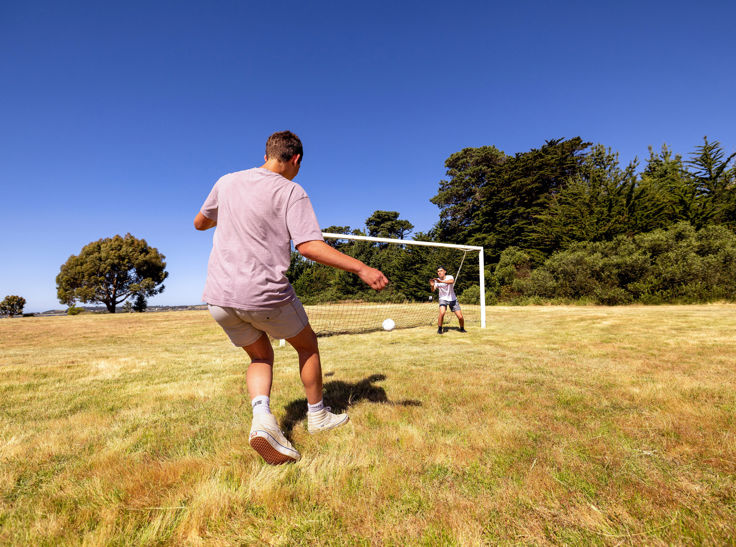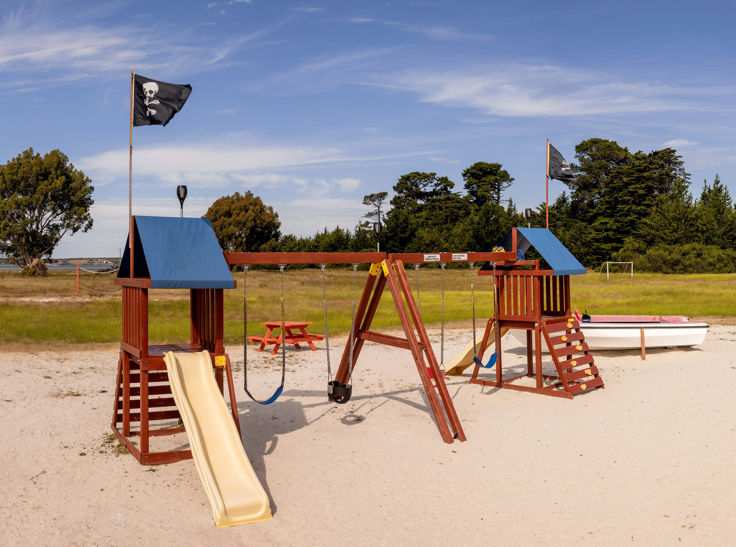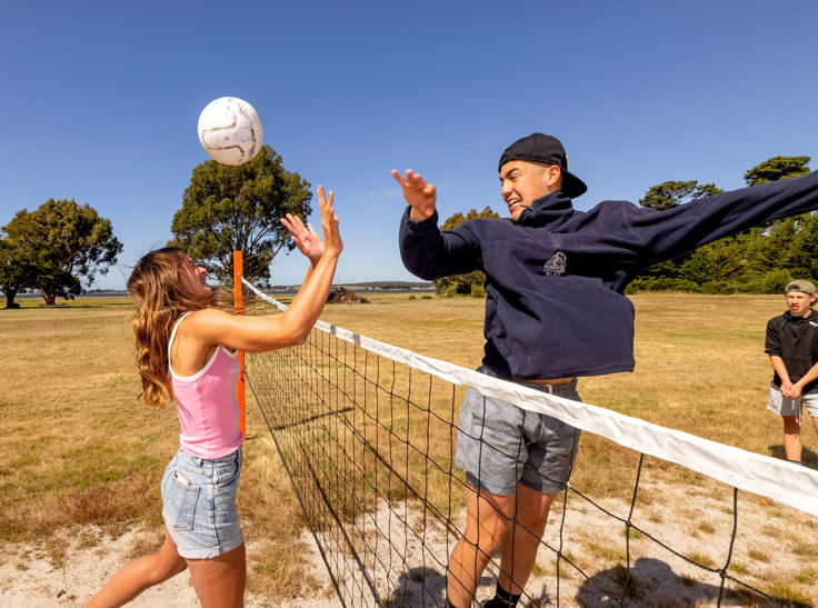 - Sport & games field area: volleyball court, soccer goals, basketball hoop, sandpit and general lawn space for kids to run around.