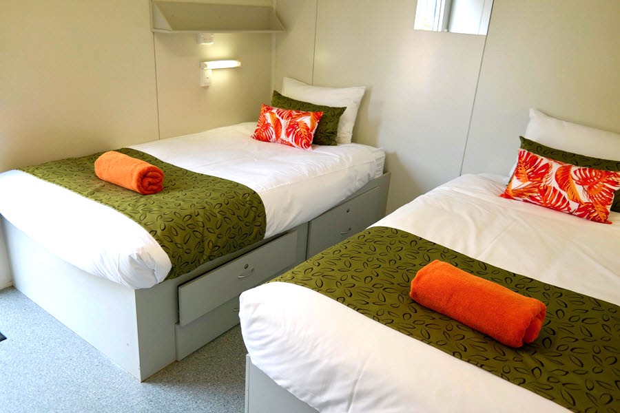 Our Bunkhouse is the perfect spot for backpackers, MTB mountain bike fans, or groups. Each room features two king single beds, a TV, a wardrobe, and reverse cycle air conditioning for your comfort. It's the ideal place to crash for a night or two while you explore our stunning coast. Shared ensuite-style bathrooms are just a short stroll away. Don’t miss our outdoor communal area! It's a favourite among guests, featuring a large kitchen, a wood-fired pizza oven, a huge fire pit, plus there is an indoor camp kitchen next door.
