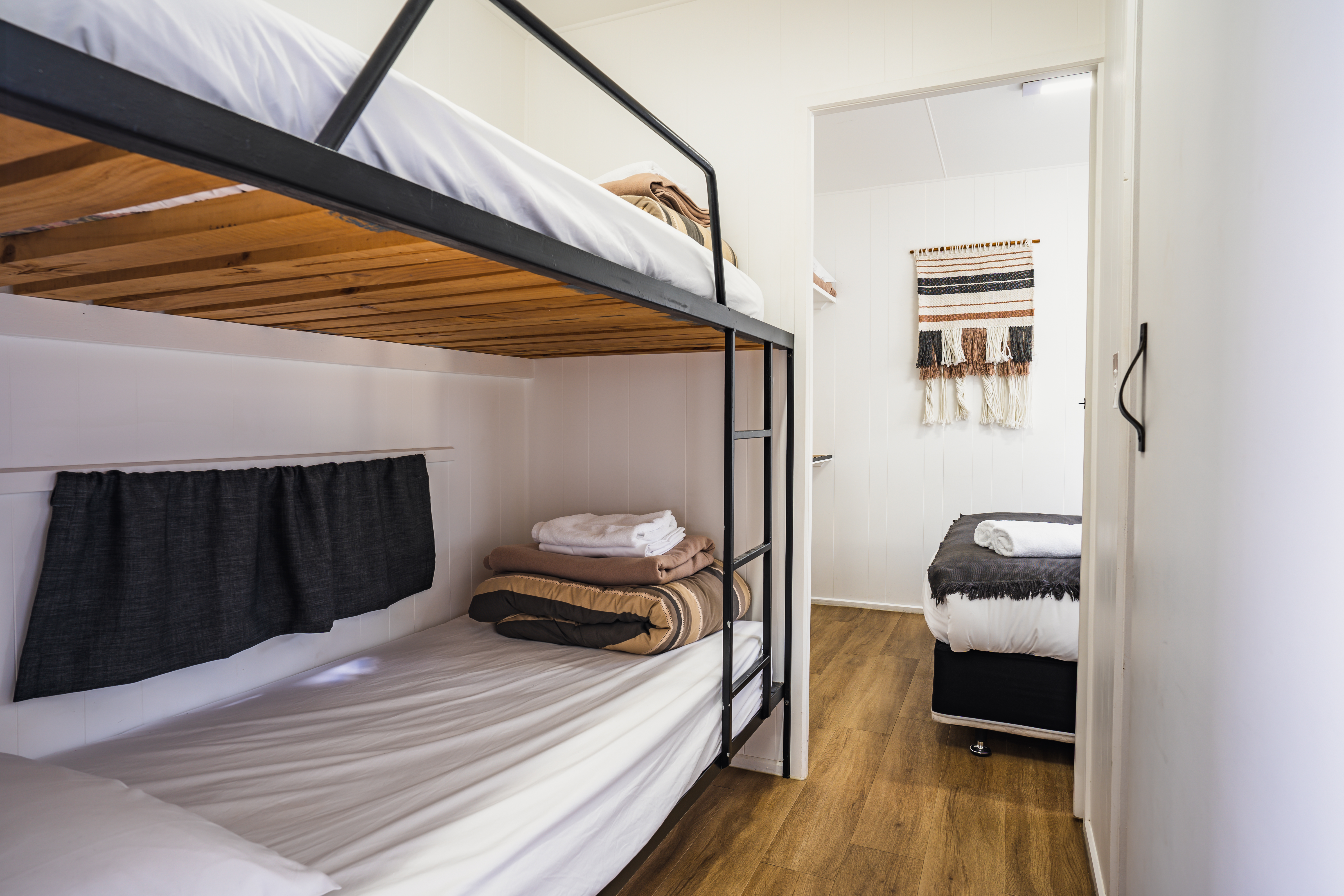 Australian Standards maintain that children need to be nine years old or above to sleep on the top bunk and even though it’s fun, they aren’t allowed to play on the top bunk either. Please make your booking with this in mind.