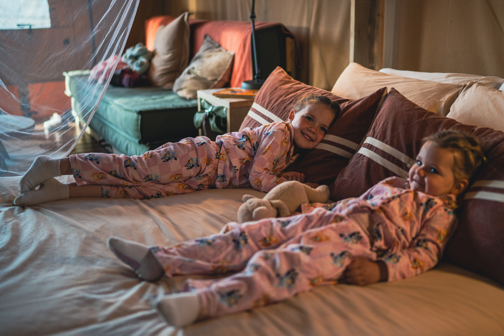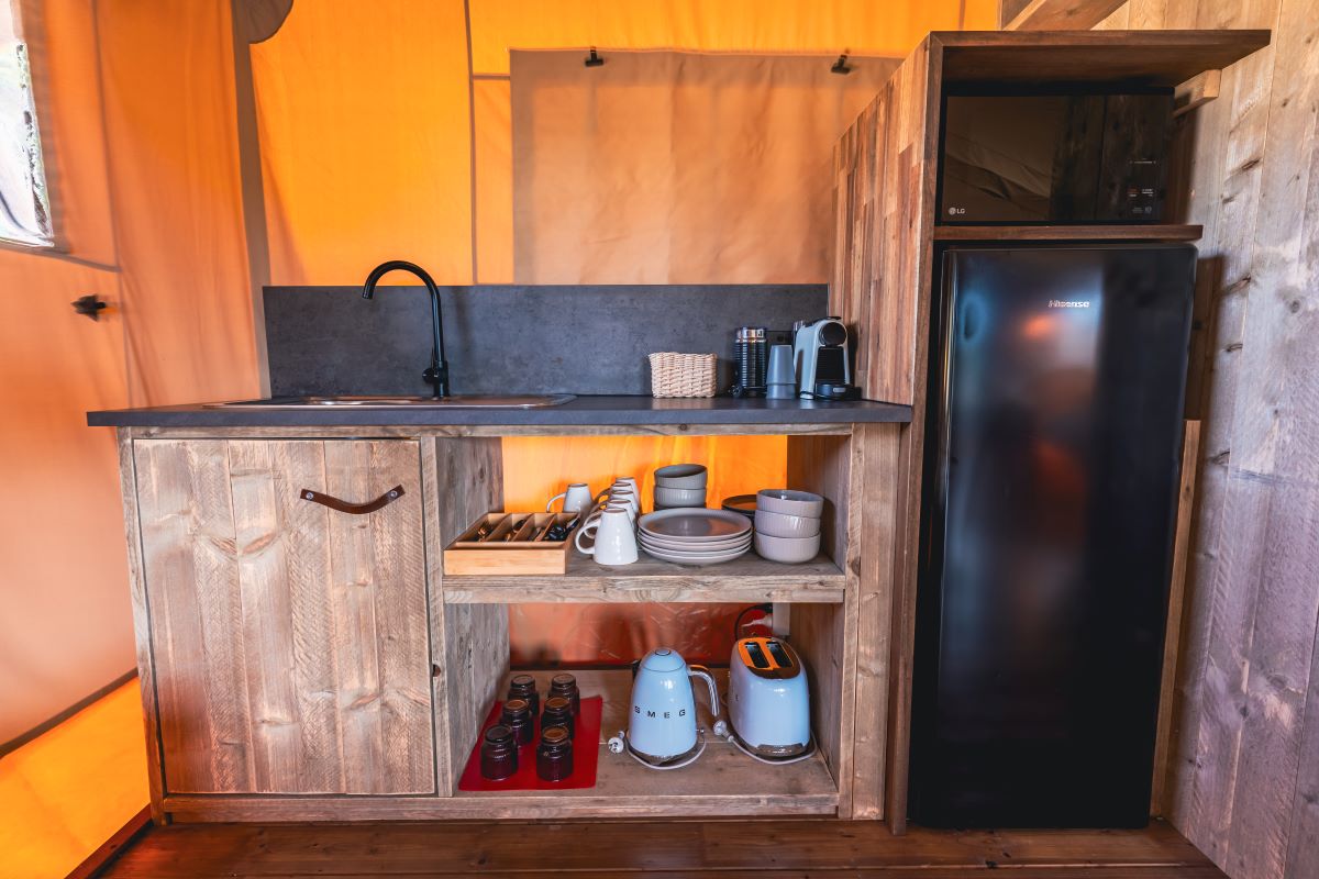 Our spacious Glamping Tents accommodate 4 to 6 guests comfortably, featuring a queen bed, bunk bed with two king-sized singles, and a cosy fold-out sofa bed. There's ample room for everyone! Children can relish the novelty of the outdoor clawfoot bath, toast marshmallows by the firepit, or enjoy a BBQ feast on the secluded deck.