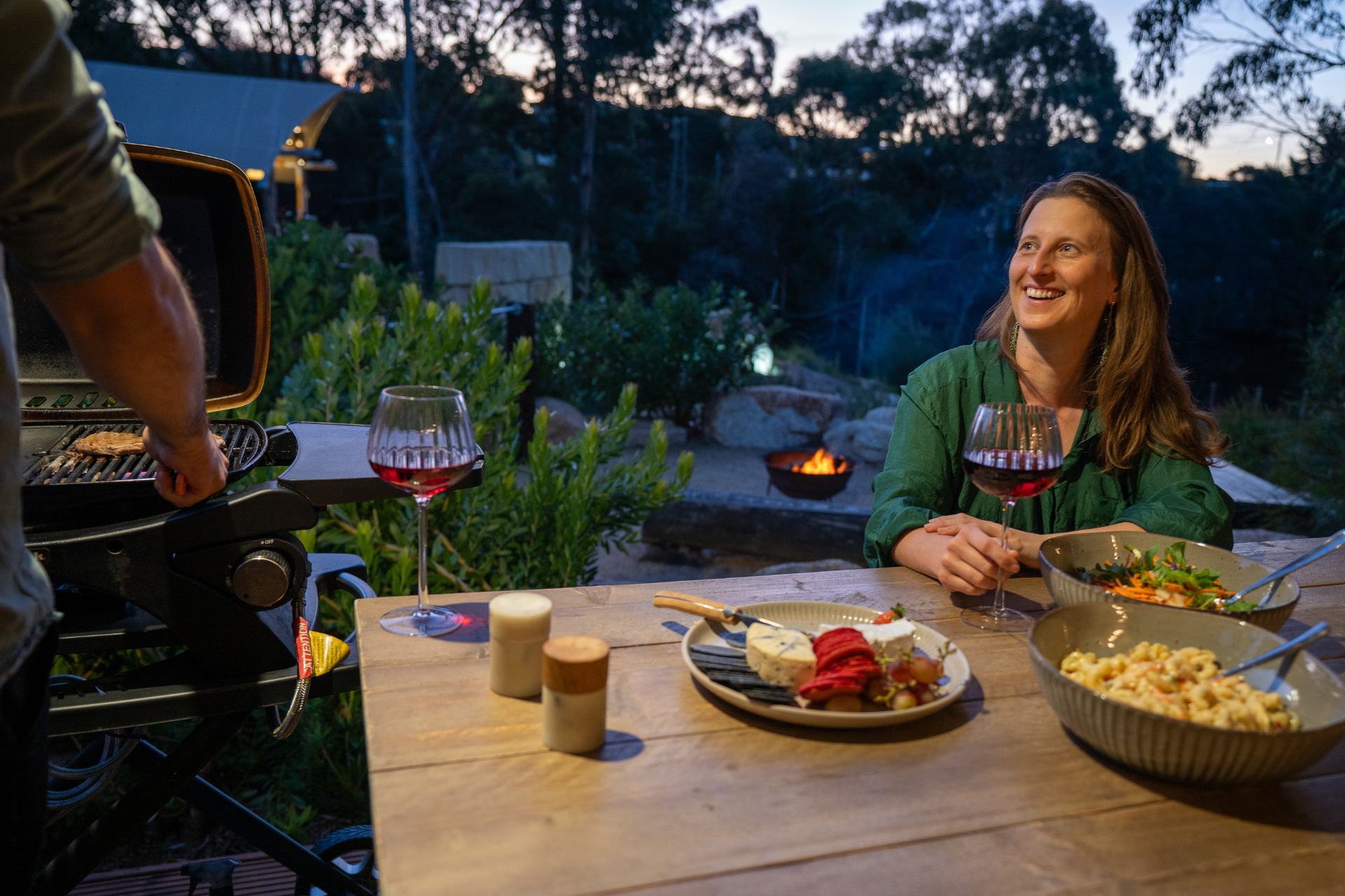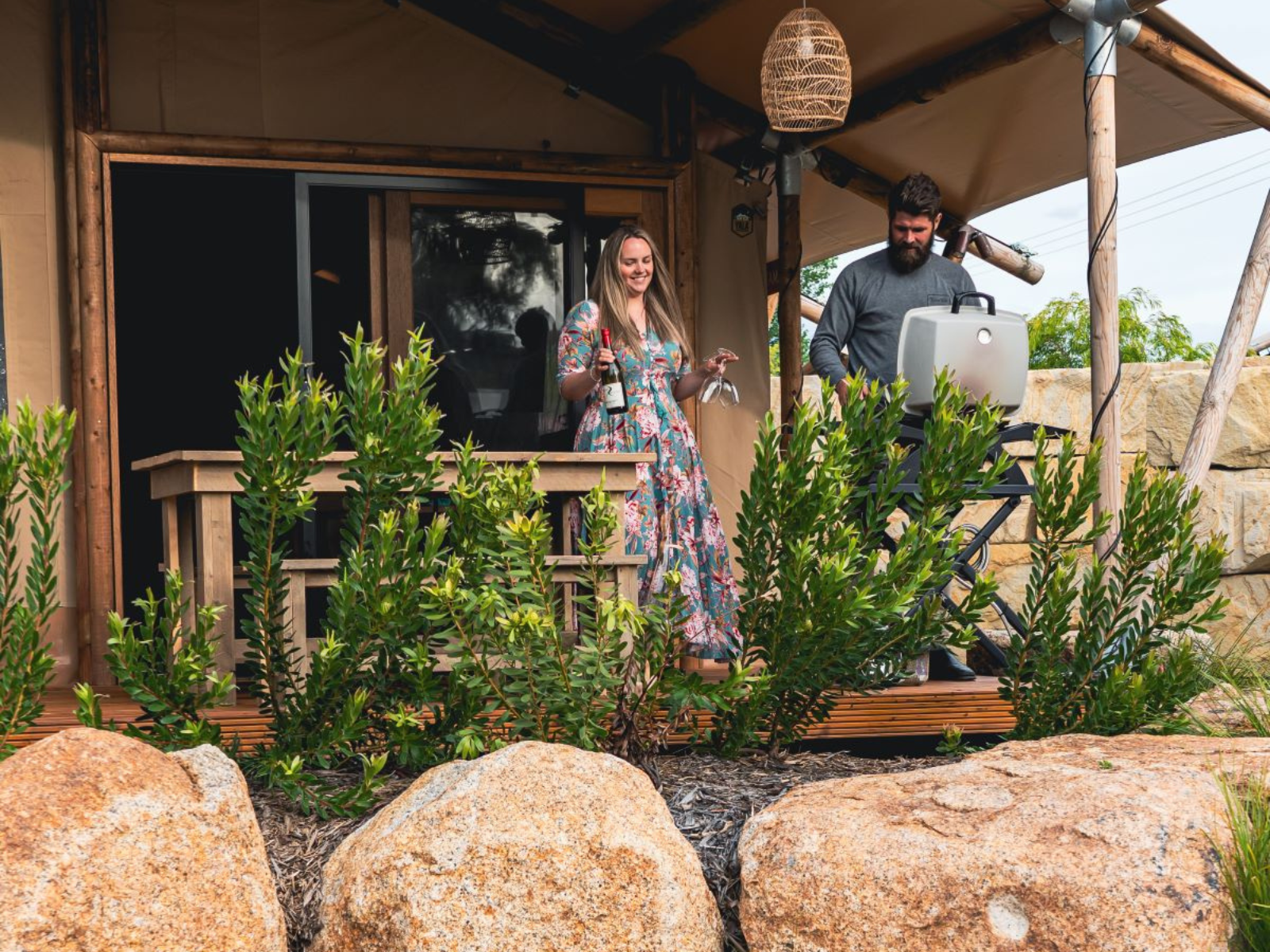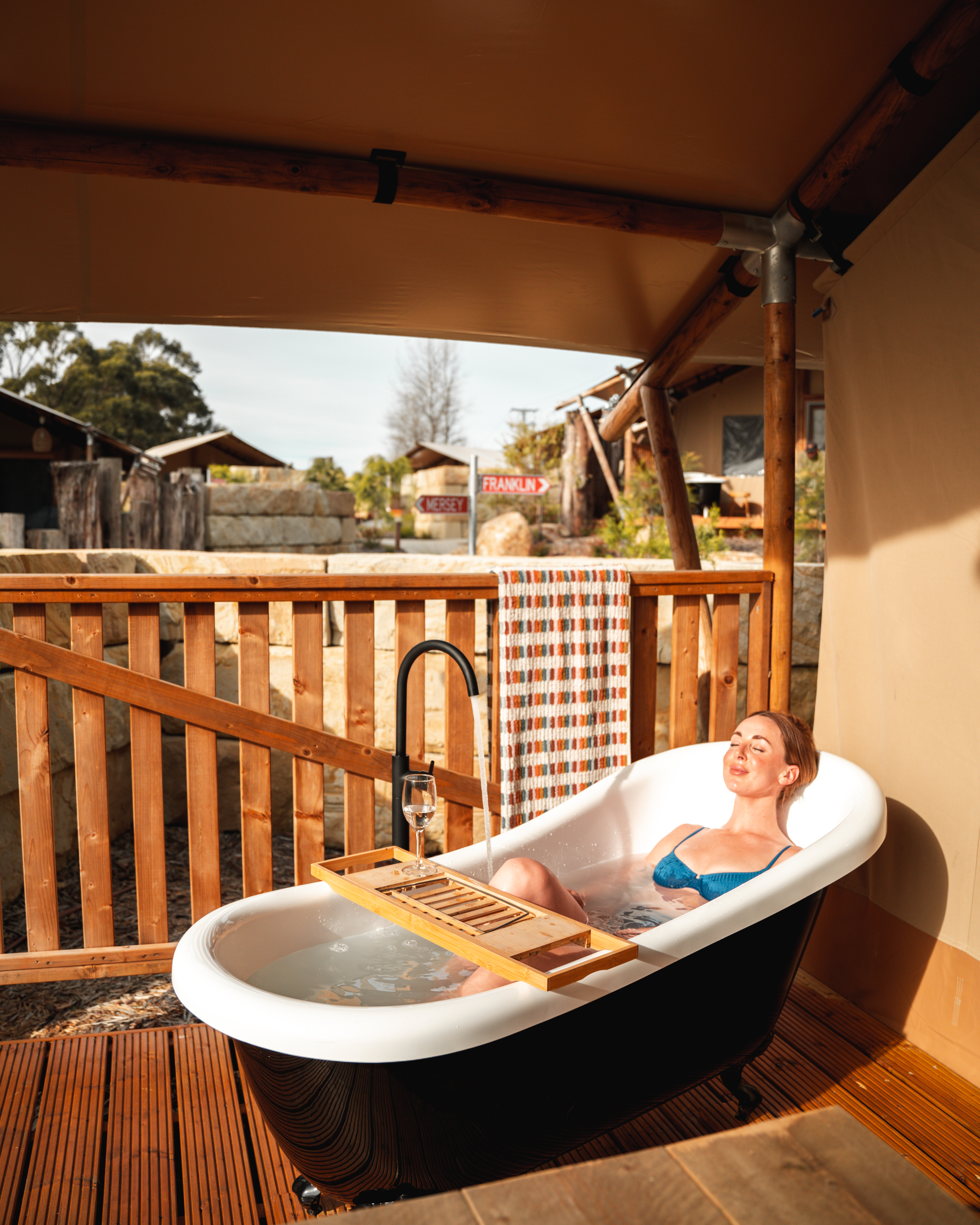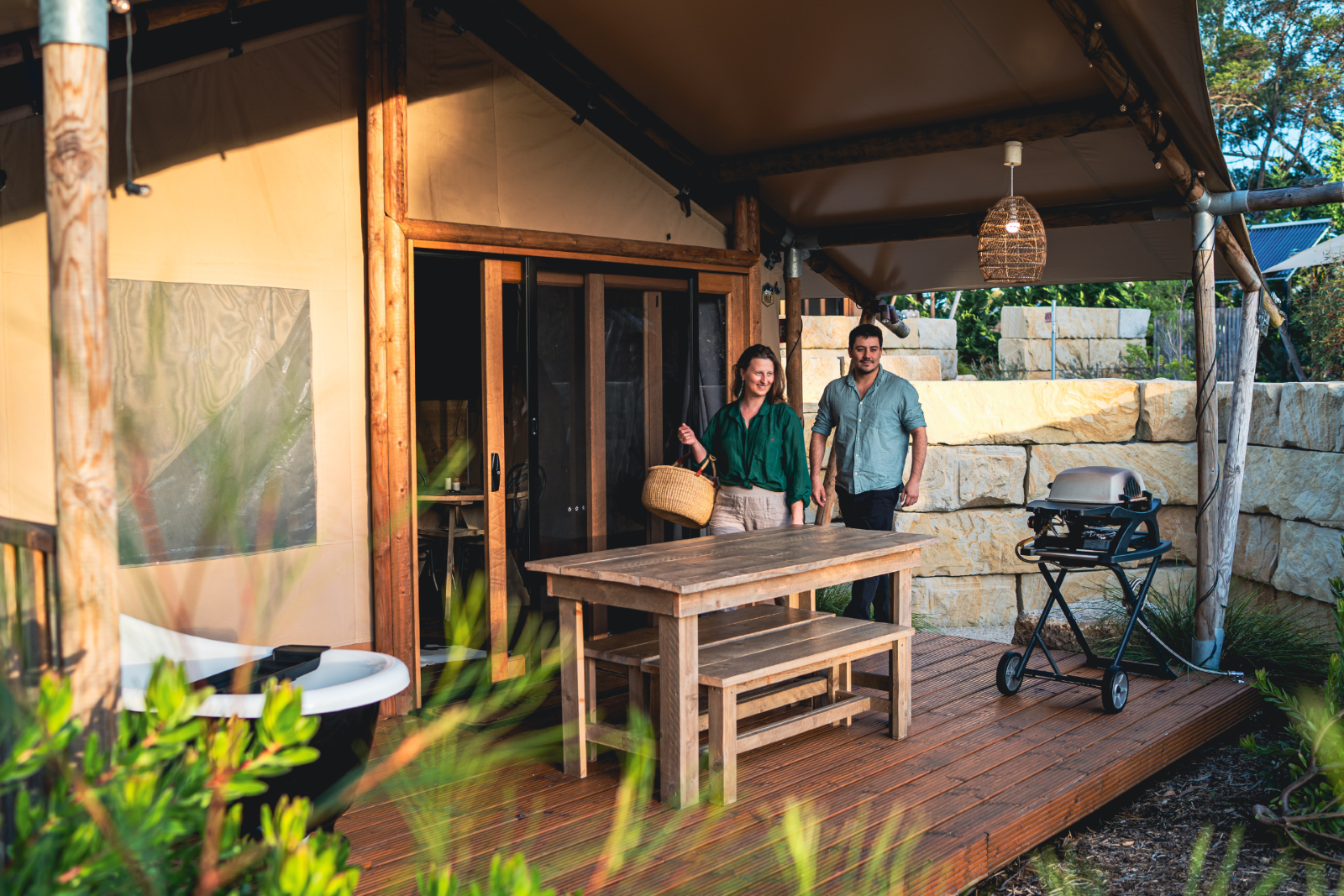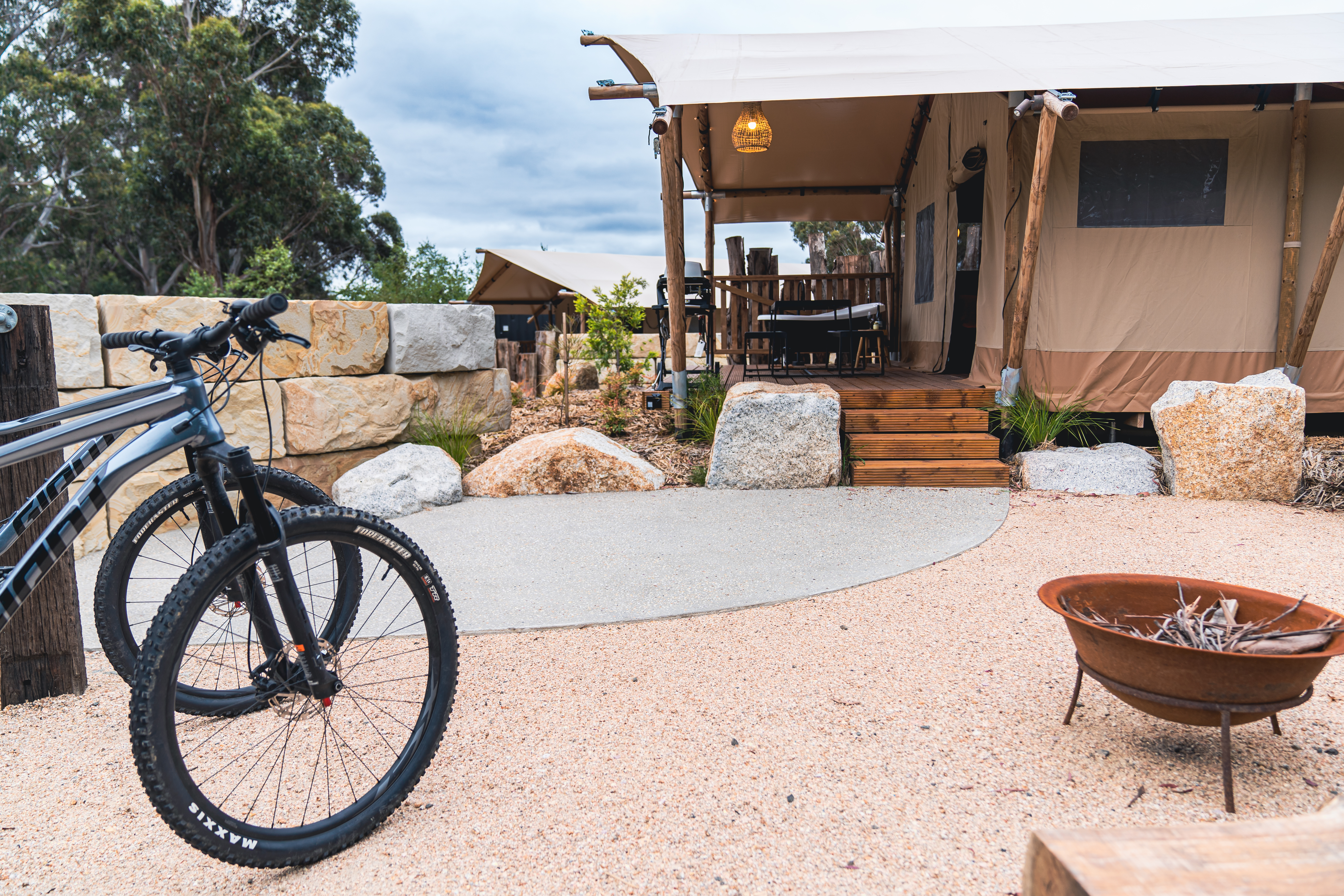 Combining rustic charm with refined elegance, we offer serenity and tranquility amidst the enchanting Bay of Fires, Tasmania. Your Glamping Tent is a sanctuary, secluded for your privacy with sandstone and aged timbers. Each tent boasts its own barbecue, firepit, and clawfoot bath on a private deck, complemented by essential amenities like a kitchen, bathroom, heating/cooling, and living area. Accessed via a secure entrance, our exclusive oasis ensures complete tranquility throughout your stay. You still have access to all of the Park's amenities, including the jumping pillow, communal fire pit, and pizza oven if you wish to use them.