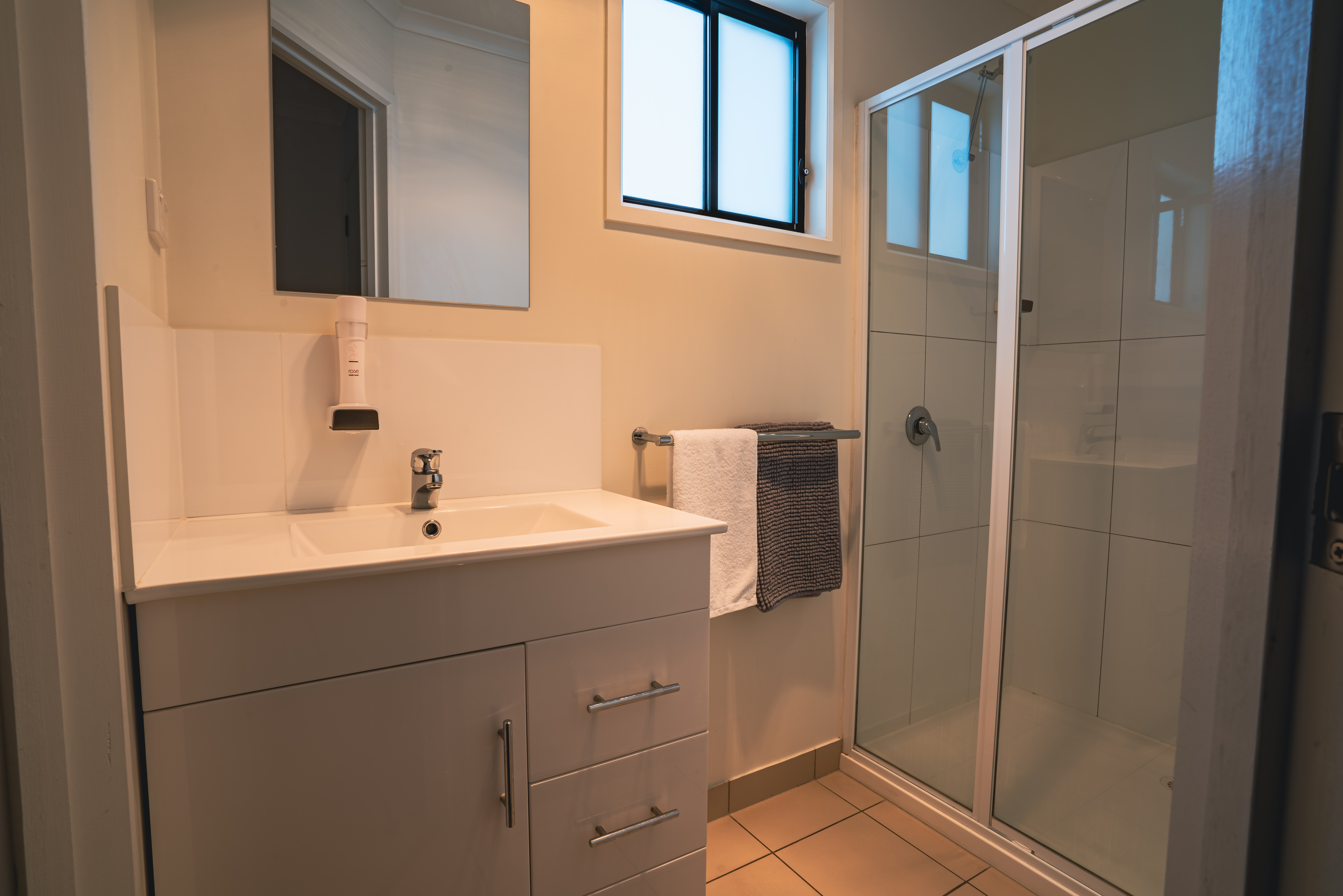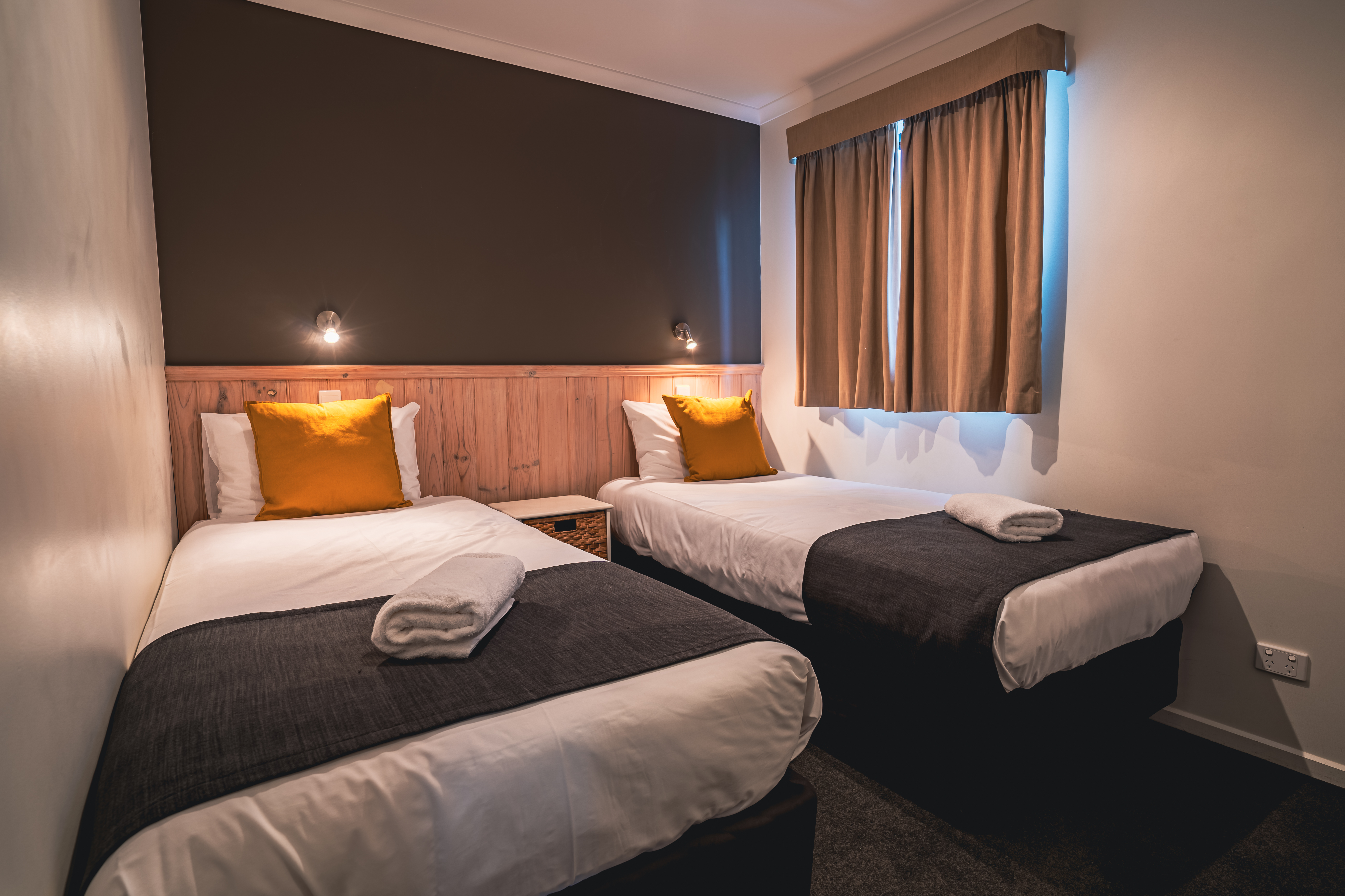 Our top of the range cabins consist of one queen bedroom with a TV, second bedroom has two king single beds, fully equipped kitchen, modern bathroom, lounge with sofa bed (linen supplied on request), dining area, reverse cycle air con/heat pump, deck equipped with a BBQ and outdoor setting, plus parking right beside the unit.