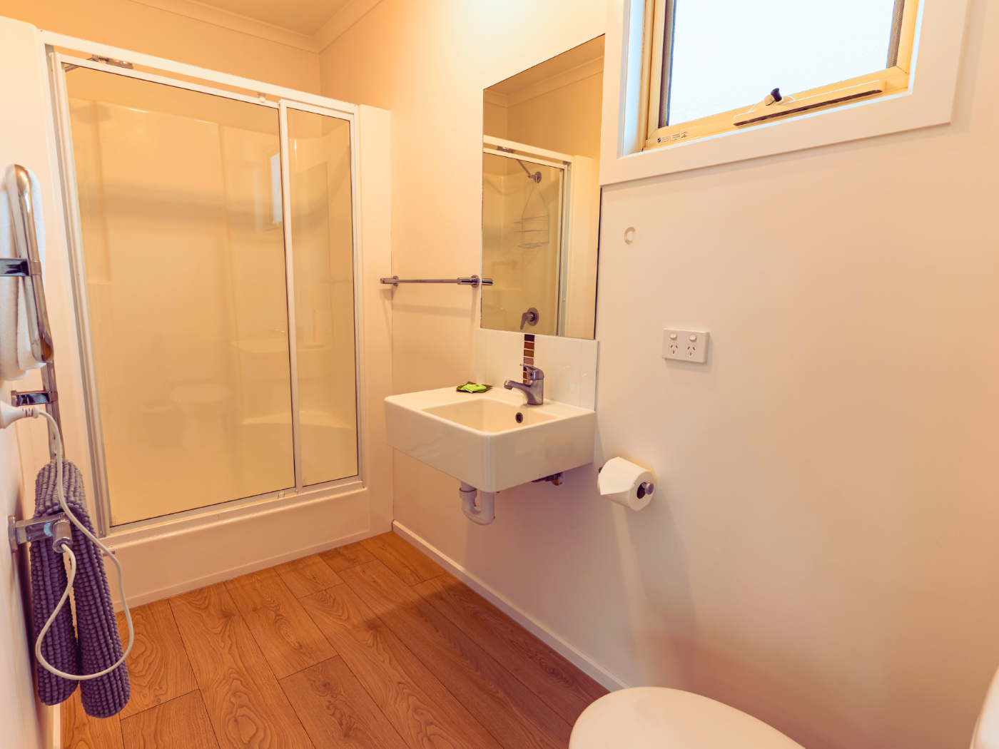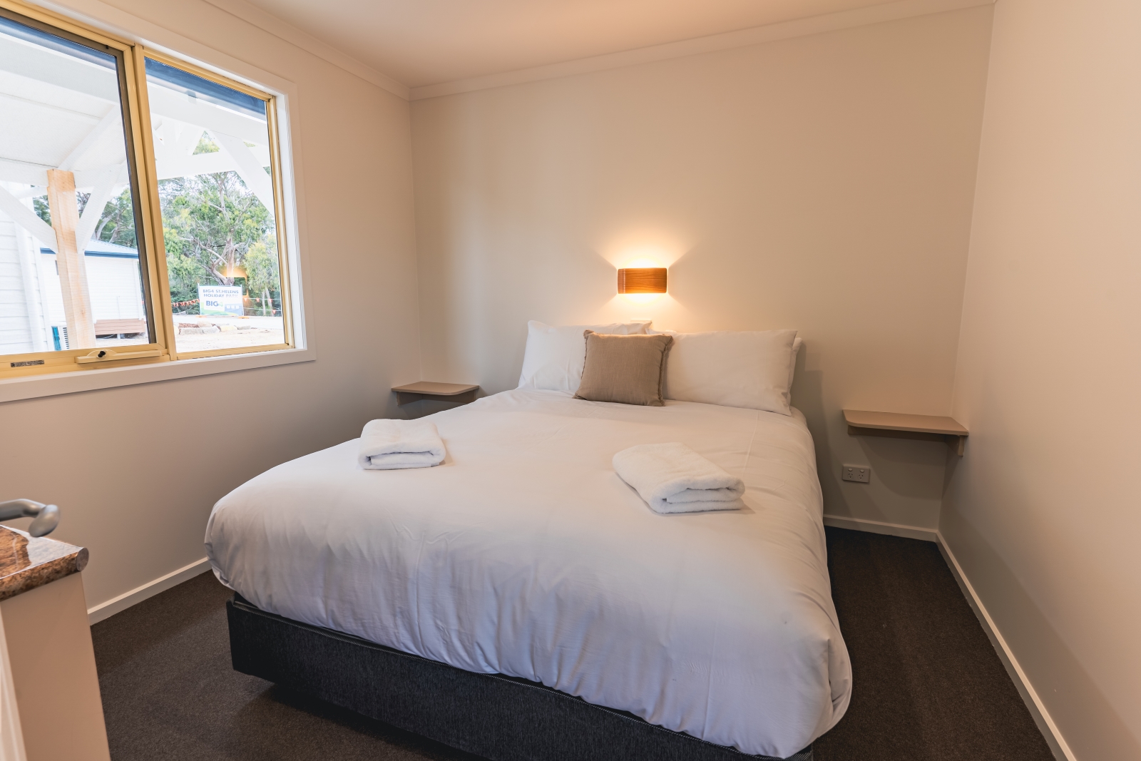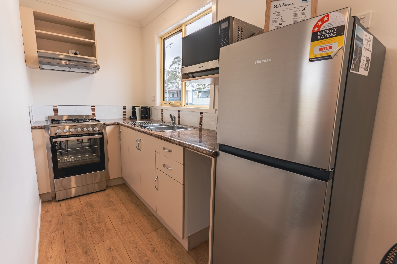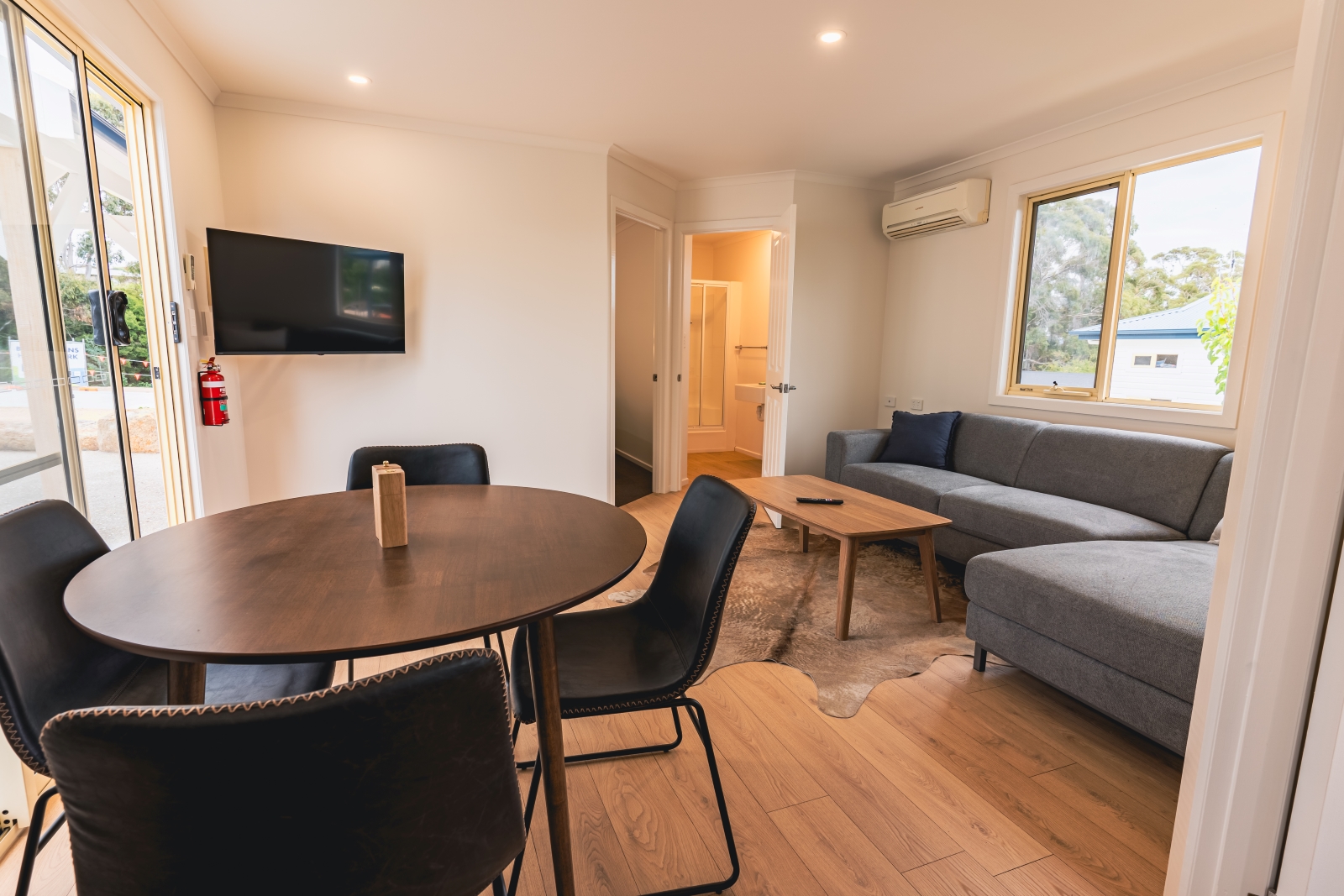 Modern in design and equipped with quality fittings, the cabin includes a comfortable living area with a lounge, TV, and dining table. The self-contained kitchen has everything you need for your holiday including a full-size refrigerator, microwave, and stovetop.