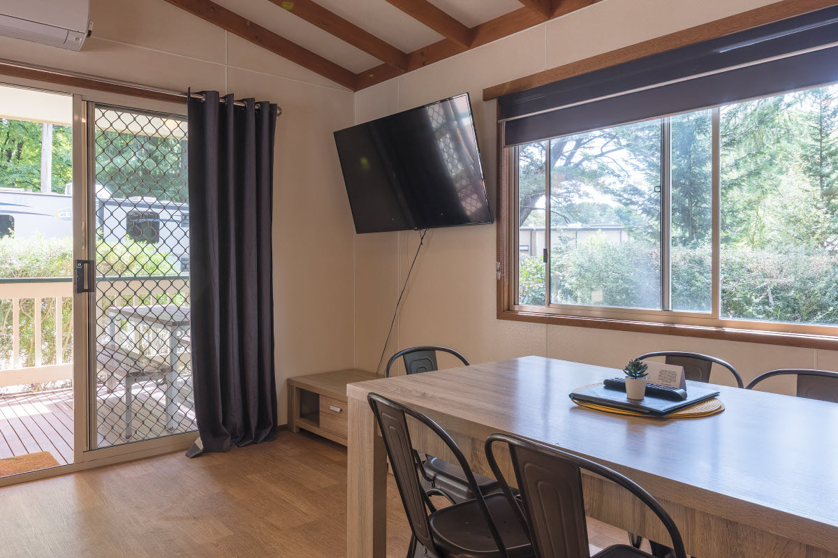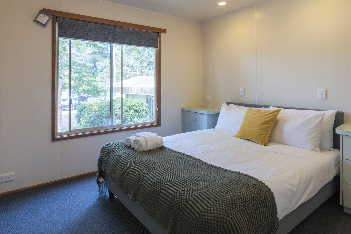 - All cabins have a self-contained kitchen/kitchenette with fridge, microwave and cooking facilities along with a colour television, heater, cutlery, crockery.