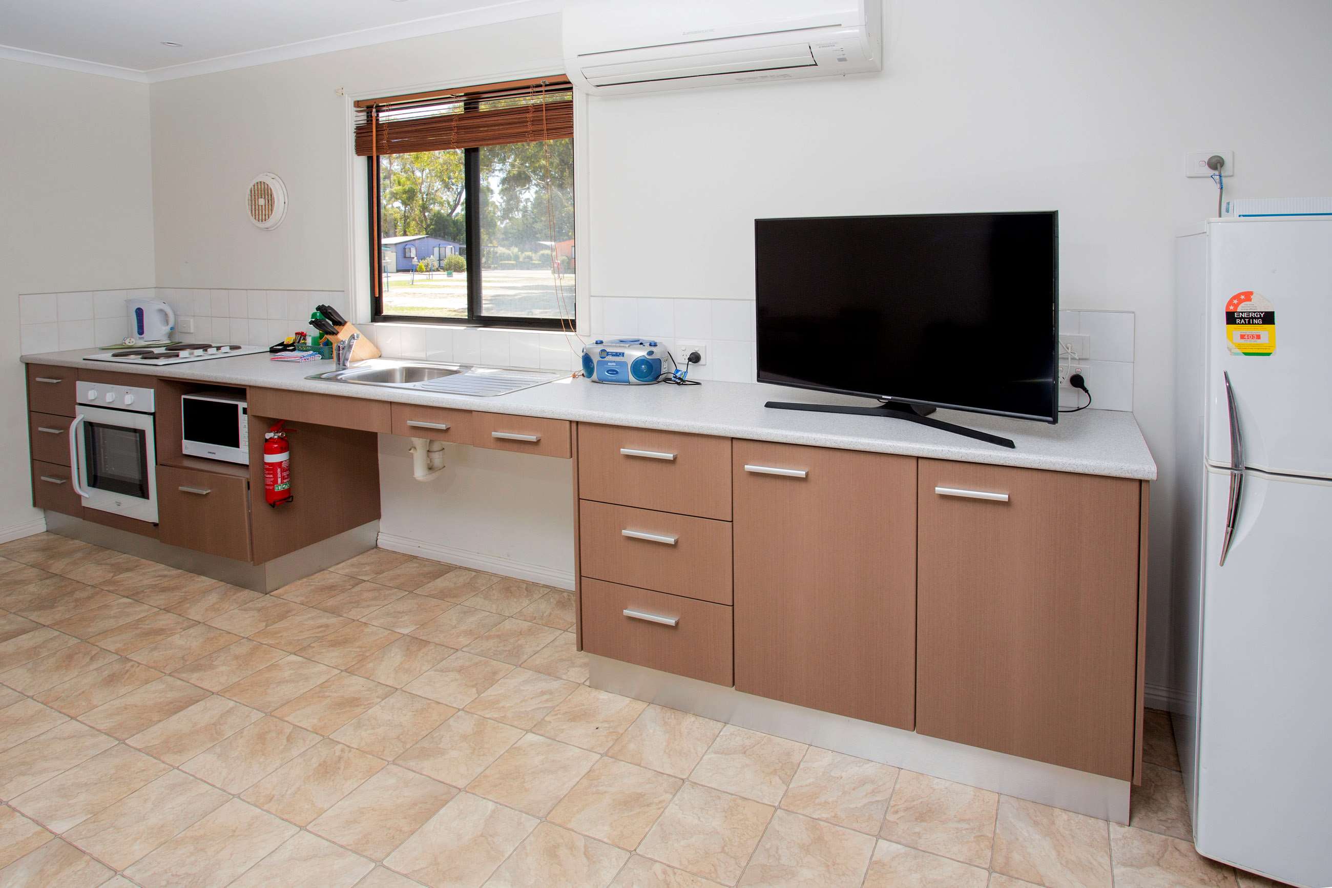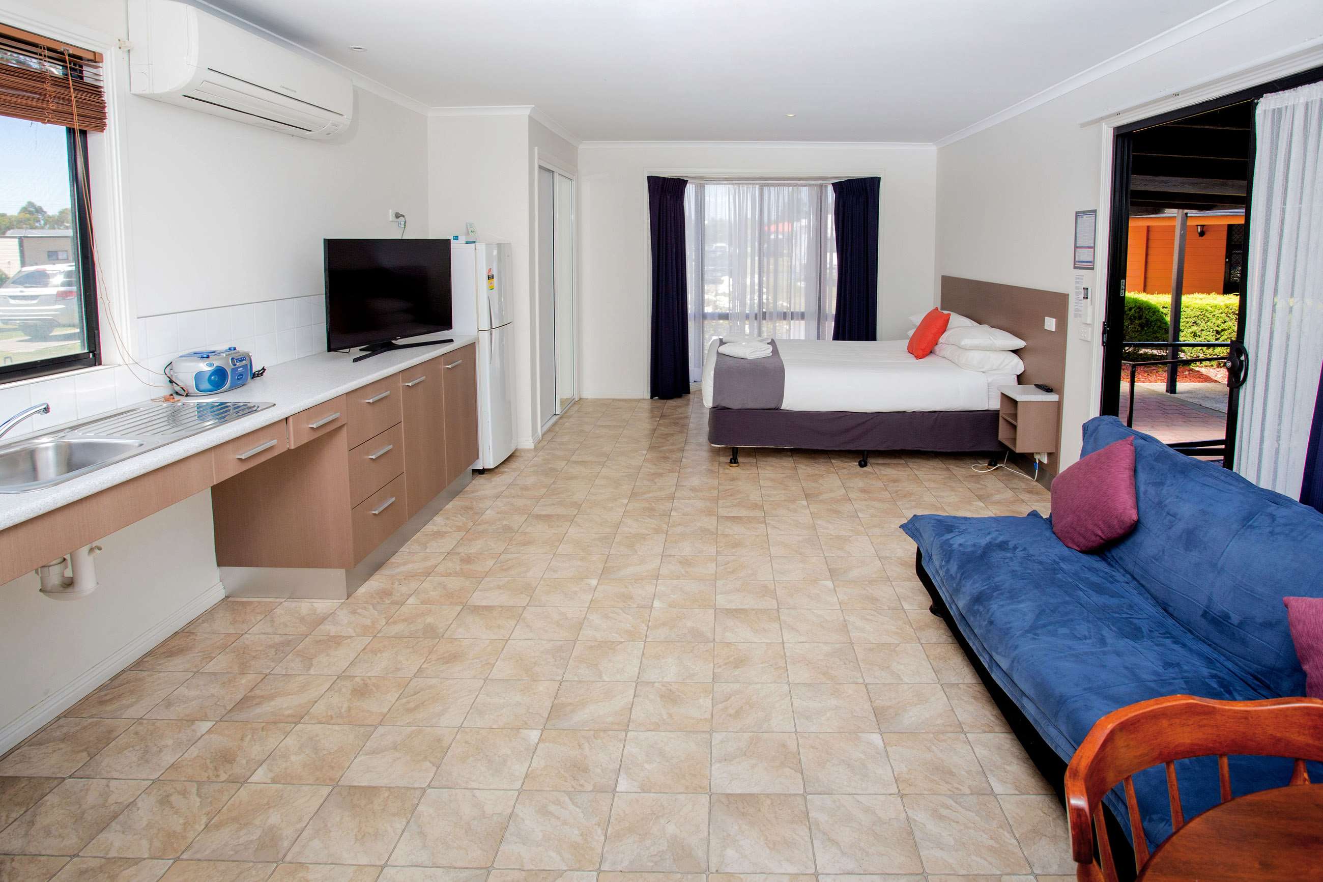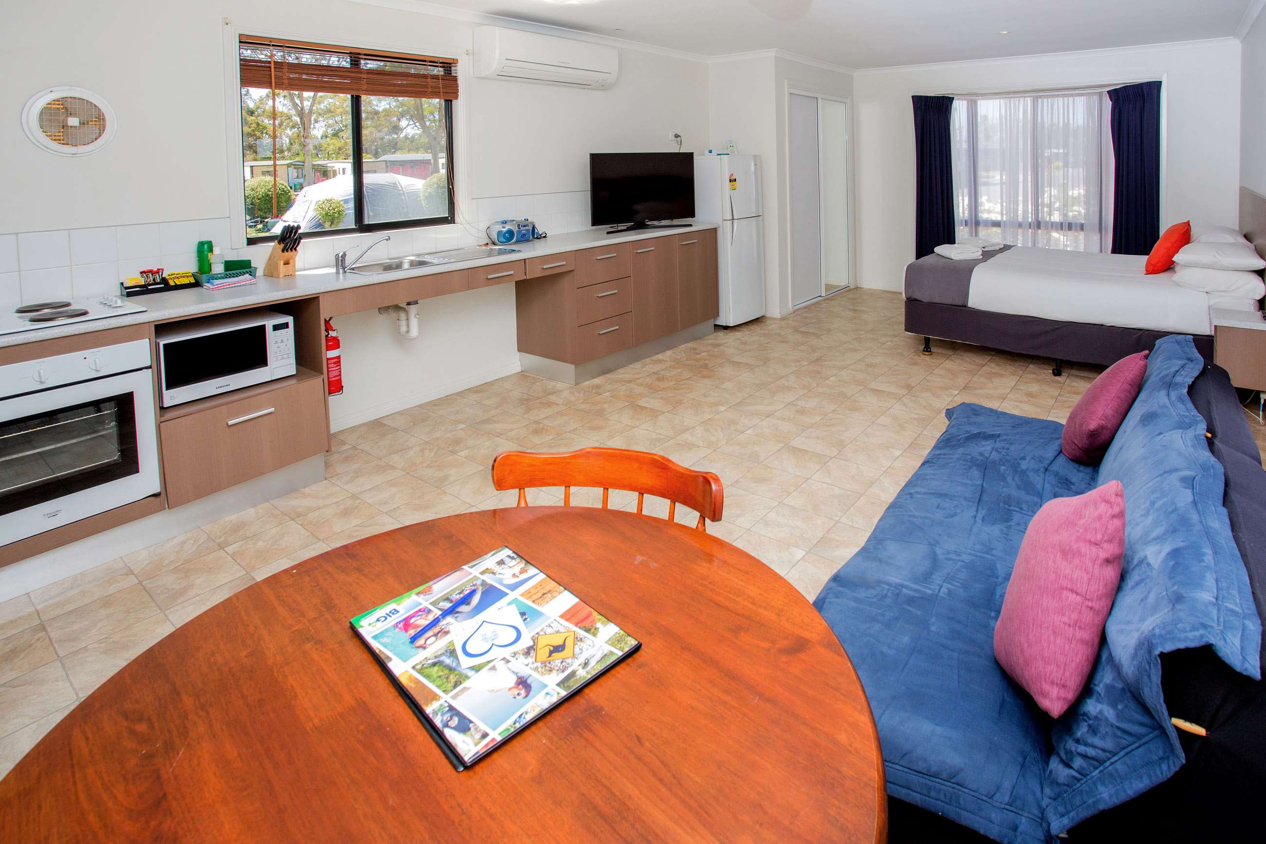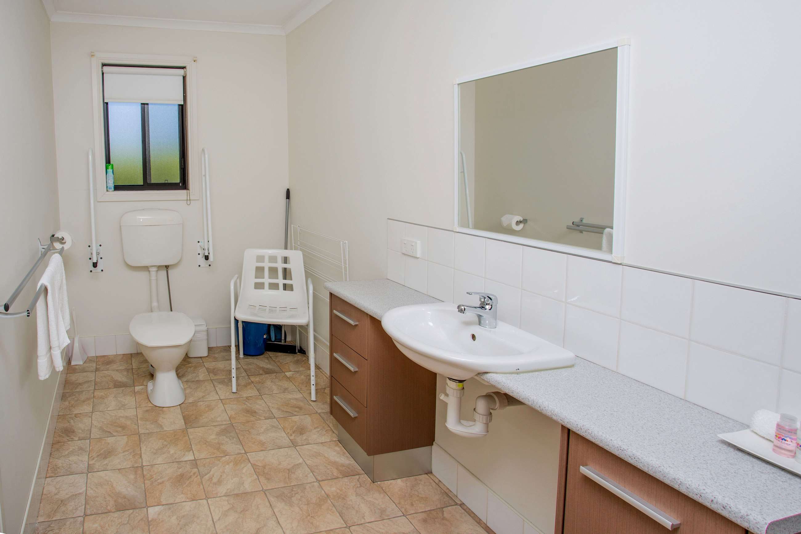 Accessible via a gentle ramp from the carport right outside your door our Easy Access Studio has been designed to meet the needs of those who are mobility impaired. Offering all the convenience of a fully equipped kitchen with lower benches and oven along with a spacious living/dining area and queen sized bed. The open plan design includes a fully equipped bathroom with handrails and the large shower has plenty of room for any mobility aids you may require.