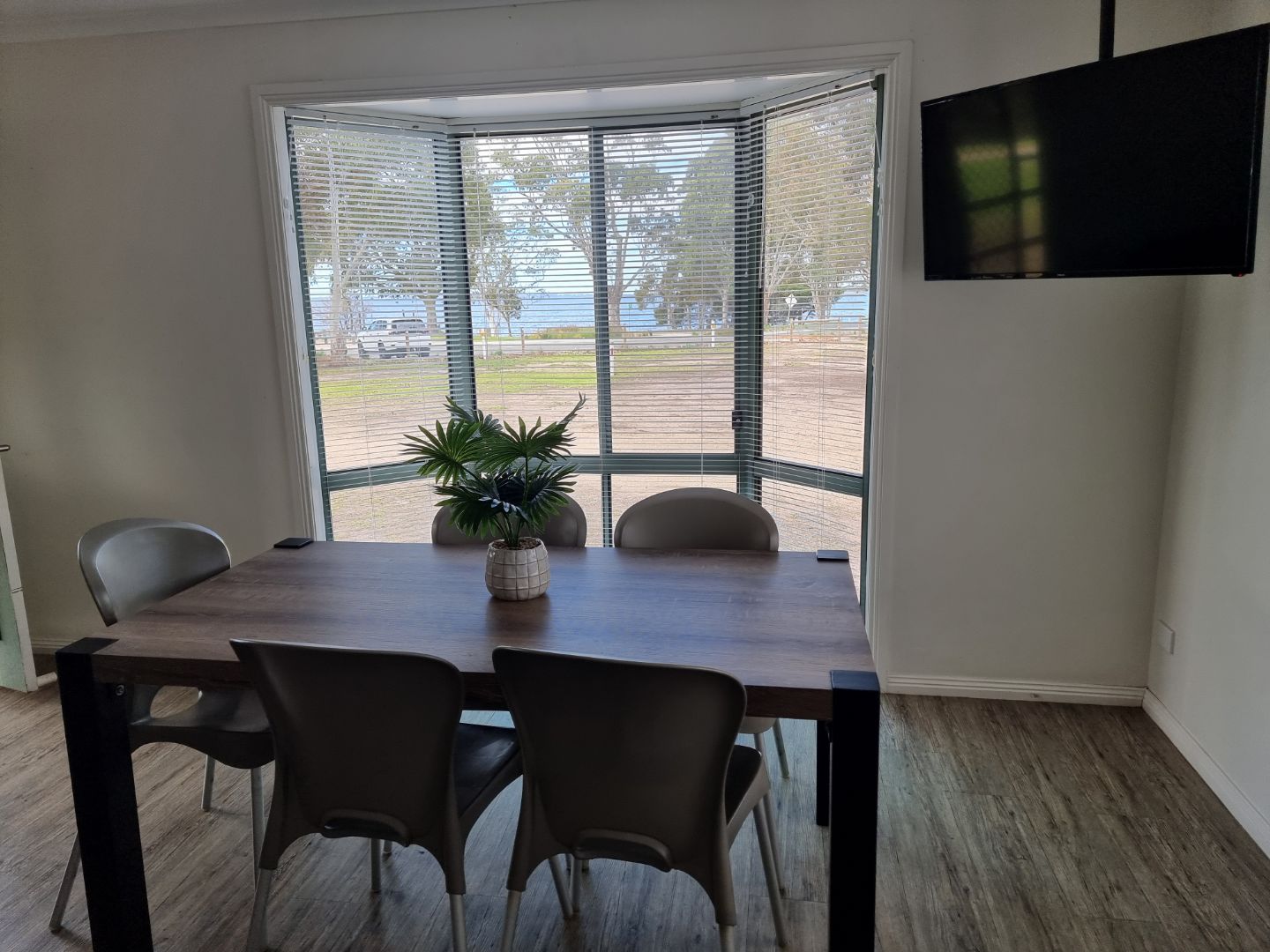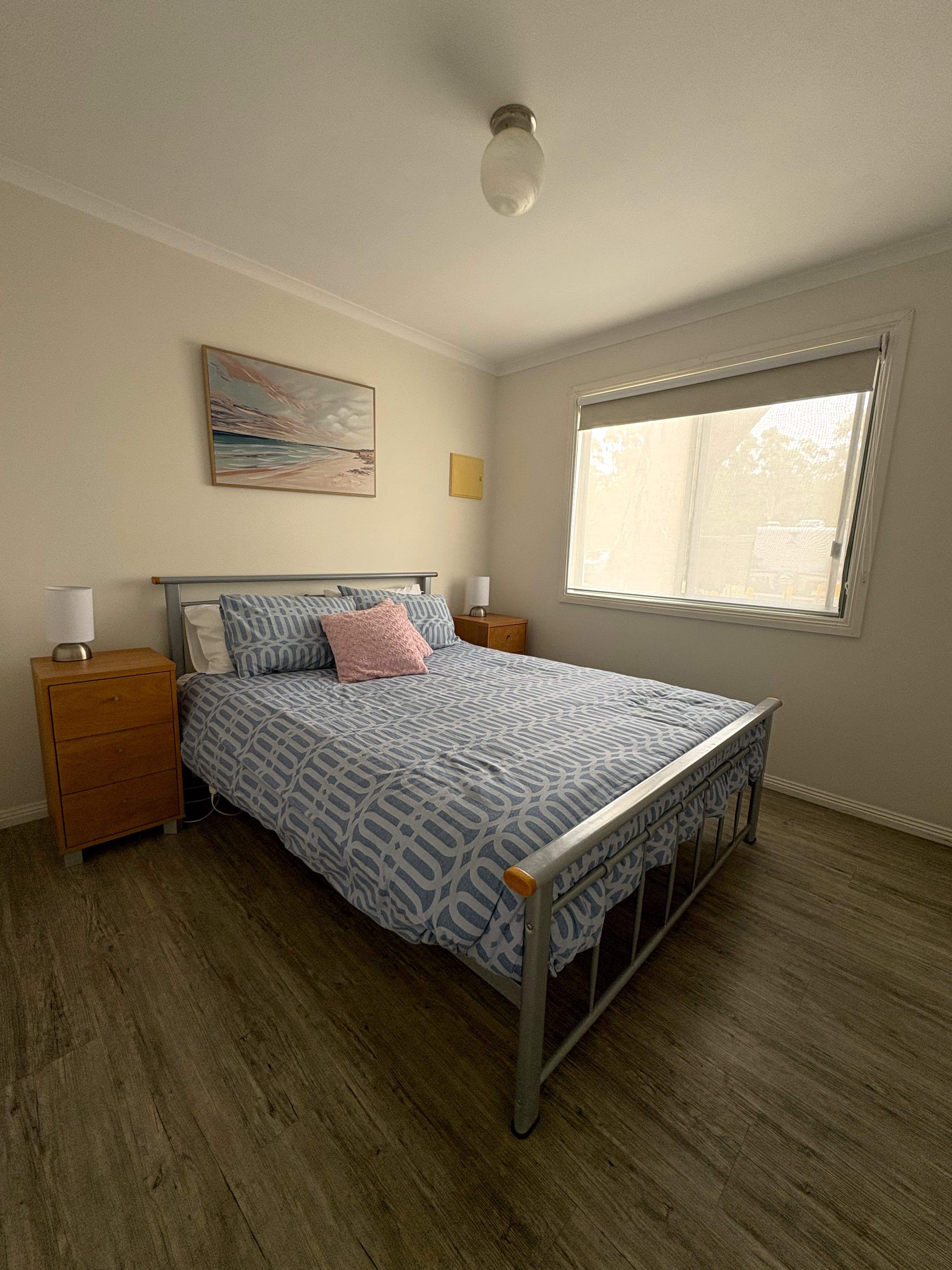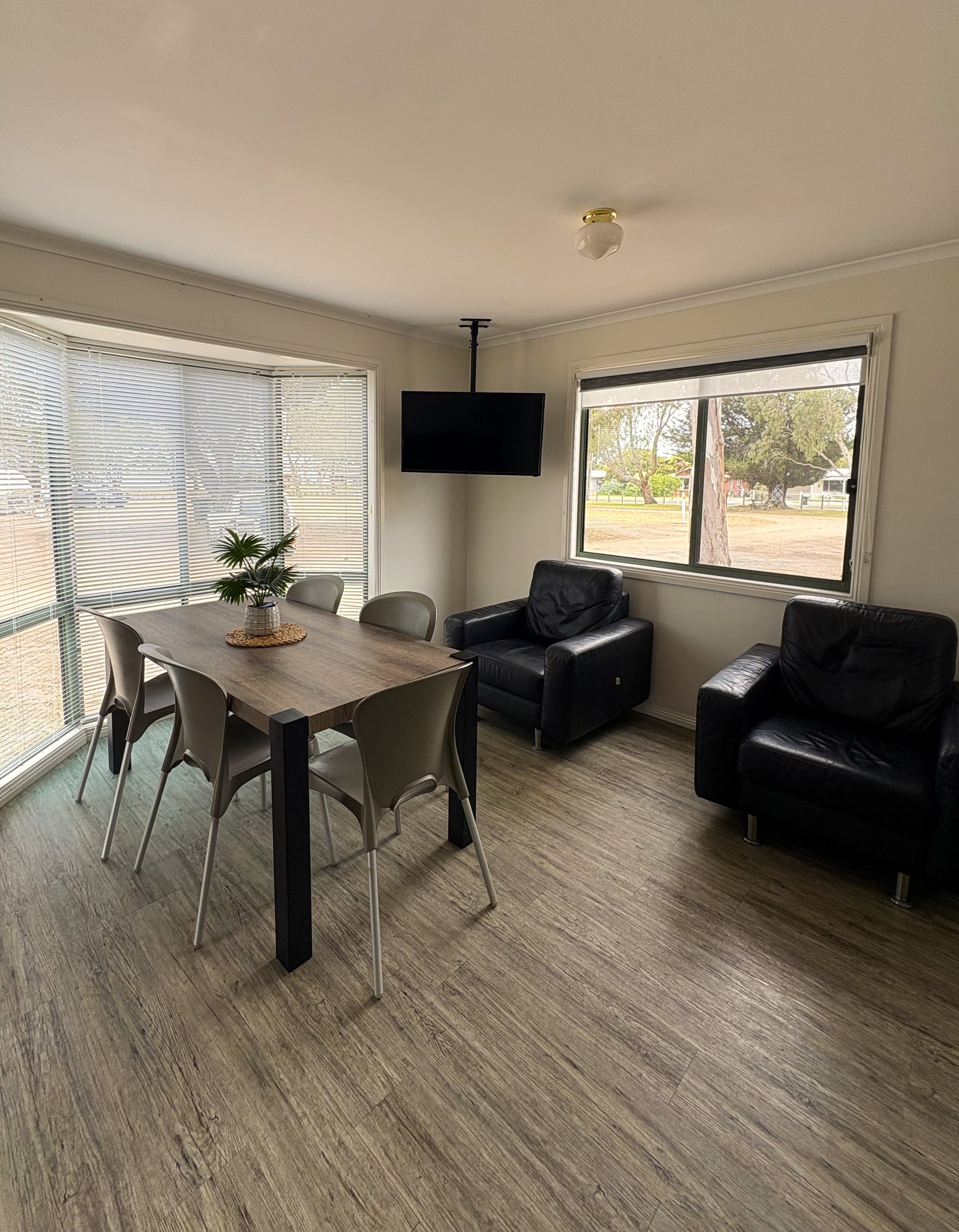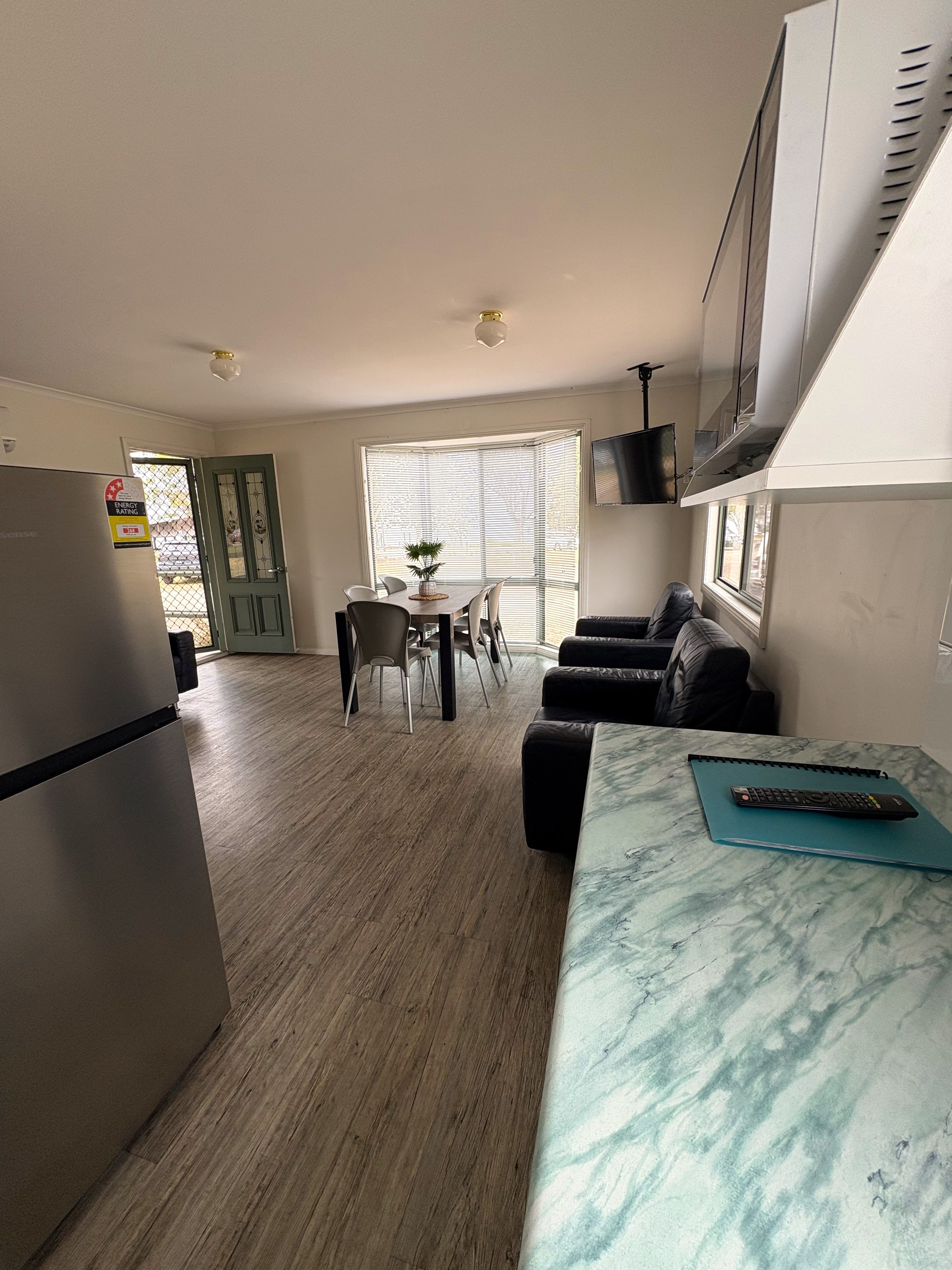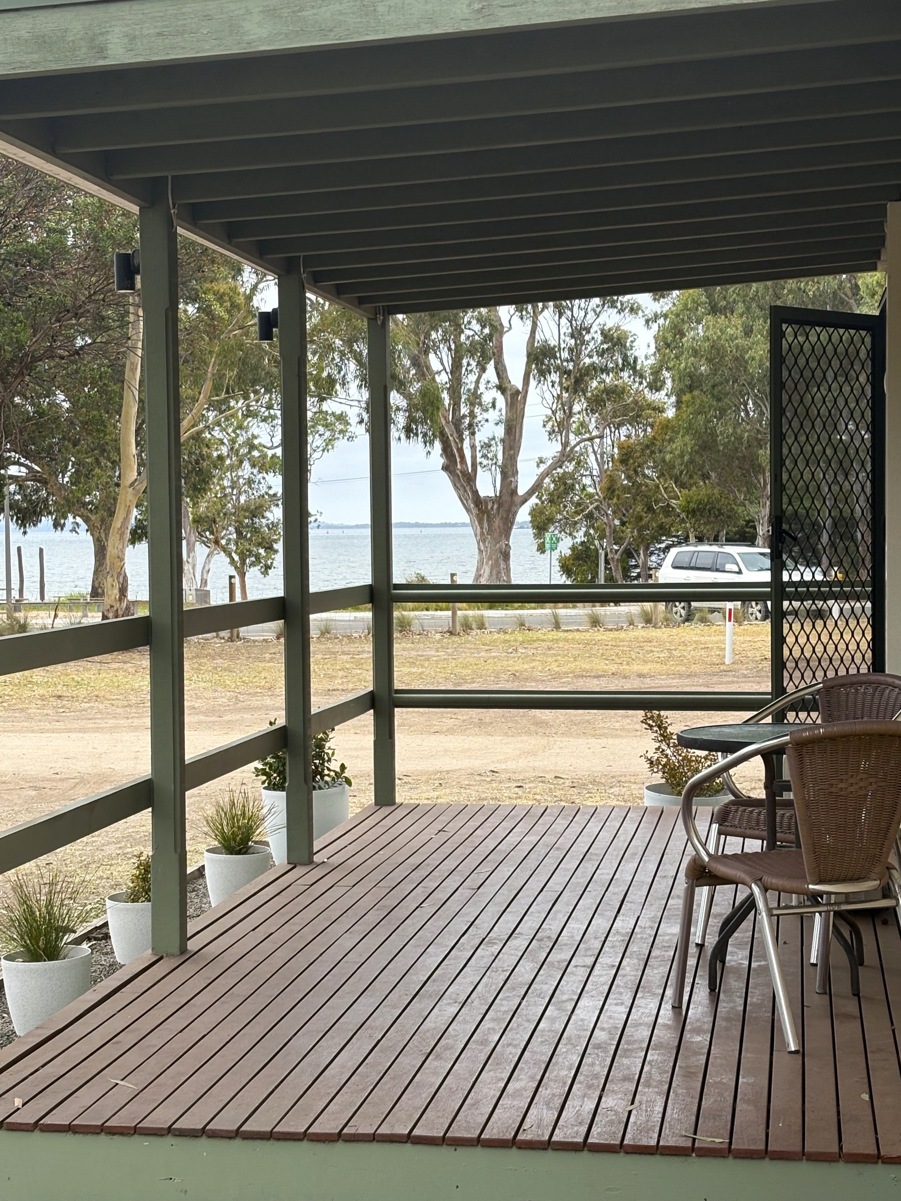 Our largest cabin, accommodating 5 people in 2 bedrooms. One bedroom has a queen bed, the 2nd has a double bed with a single bunk above. A fold out trundle bed is available for a 6th person, (if required, please request). Front deck with setting, with all rooms overlooking Lake King. Lounge with large TV, dining table and lounge. Full kitchen, large fridge and a washing machine. The cabin provides a balcony with views of Lake King or a view of the natural Eagle Point Flora and Fauna Reserve.