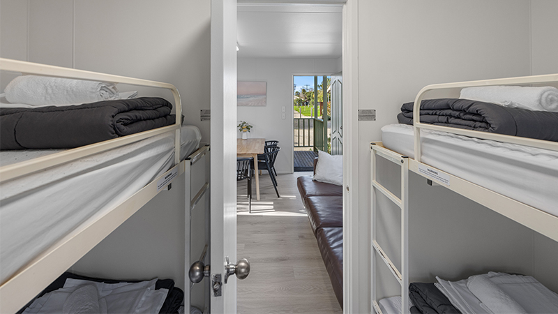 Our Ensuite Cabins sleep four to six guests with a variety of bedding configurations, as well as a bathroom, small living area, and kitchenette.